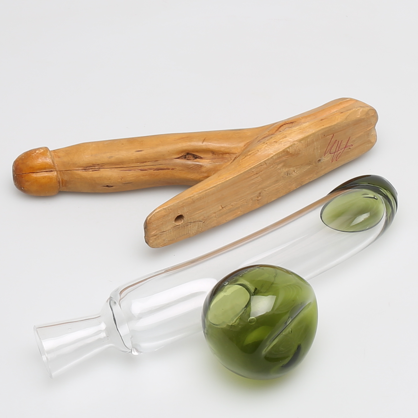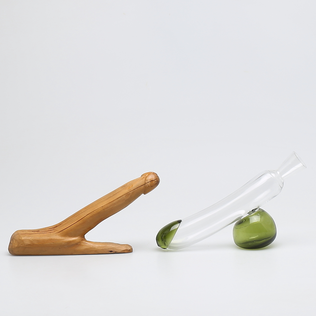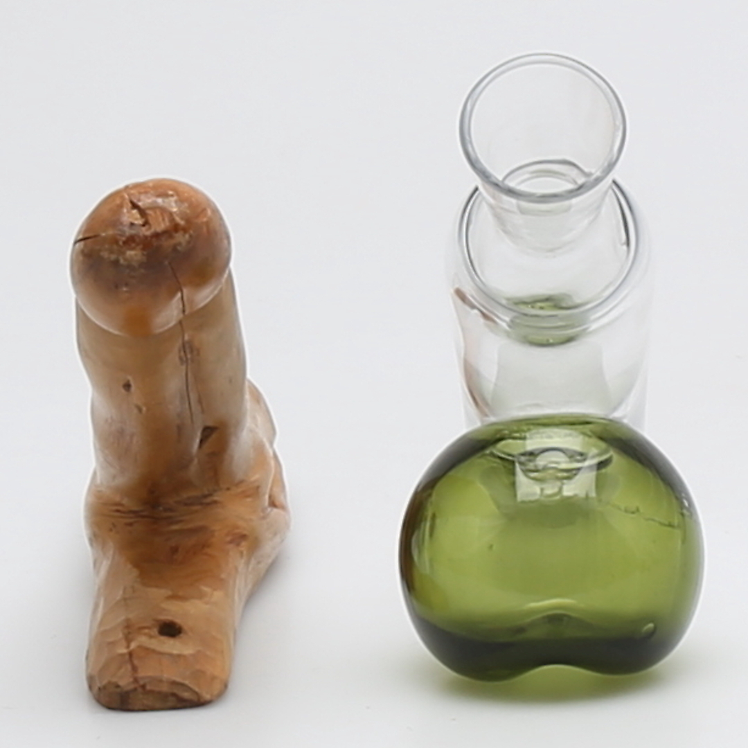 332679. FLASKE- & TØJKROG, 2 STK, glas og træ.