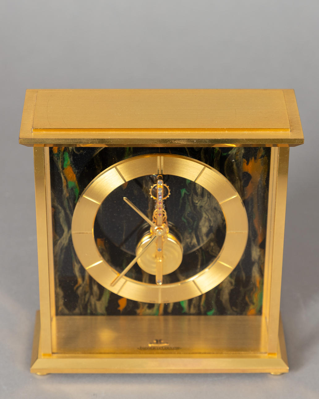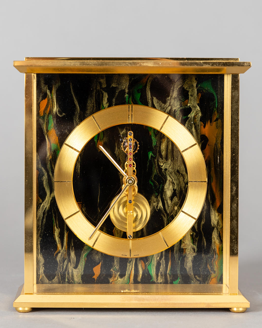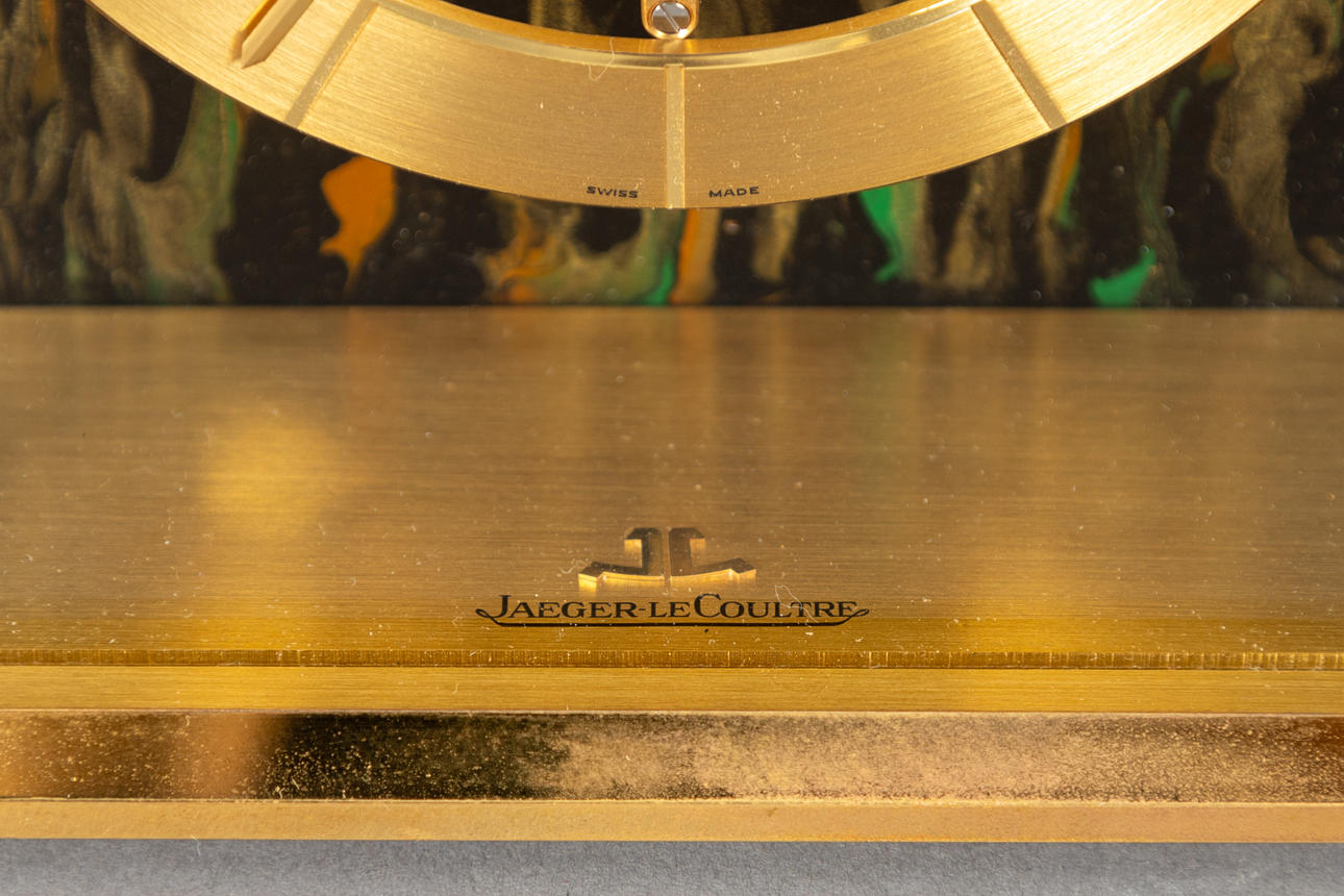 Bagvæg med lodret gradient i guld, jernrød og grøn på sort baggrund. Struktur med ankerlås. manuel løft. Time- og minutvisning. Firmanavn på jorden. HxBxD: ca. 17 x 15,5 x 6,5 cm I den originale æske (skumpolstring kommer af) og den originale garantihæfte. Renoveringer hos Juwelier Willer i 2004 og 2006.