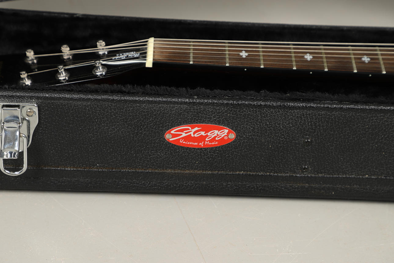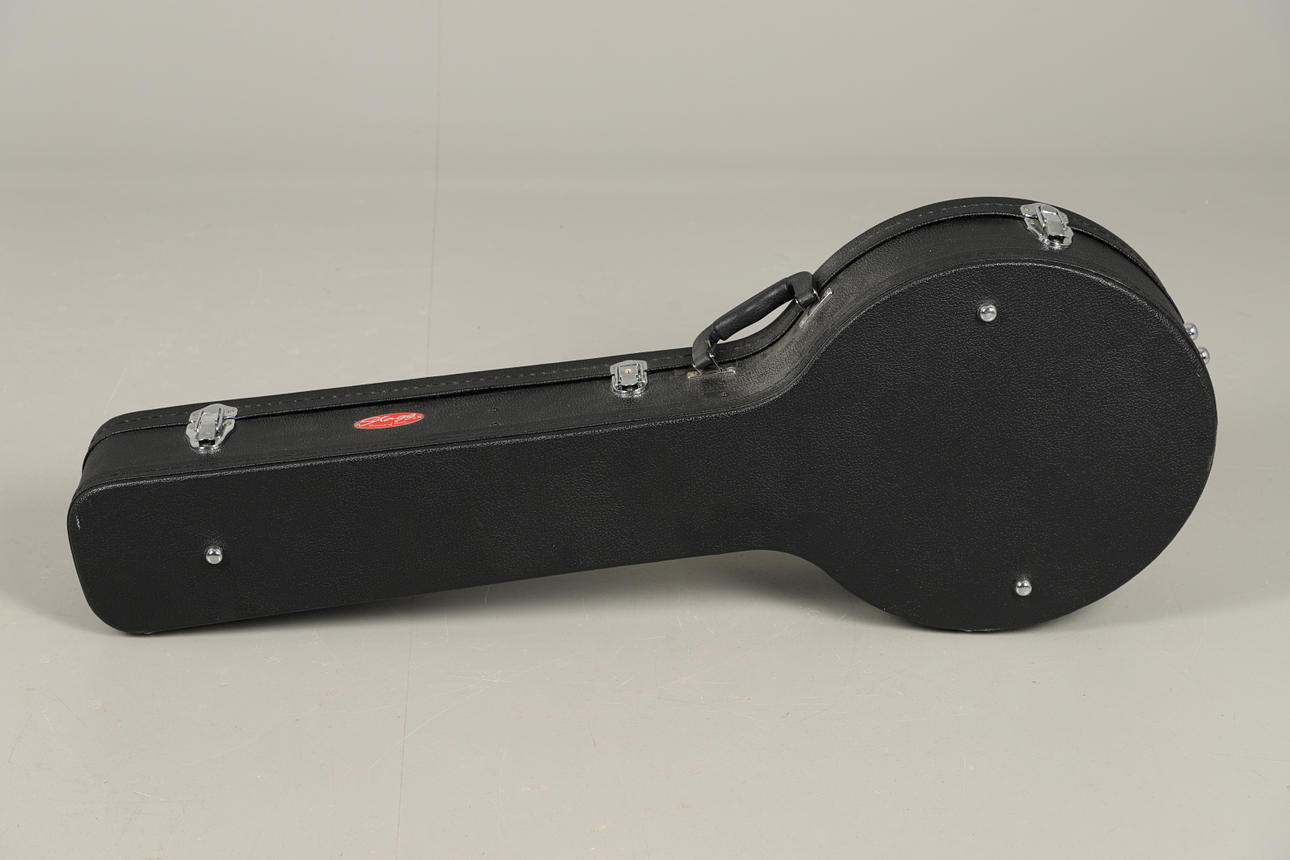 En banjoguitar med seks strenge fra Tanglewood (Union Series TB24DLX-6), i sin originale monterede og forede sorte hårde sikkerhedskasse fra Stagg. Leveres med skulderslynge. Tasken måler Højde 16cm x Længde 105cm x Dybde 39cm.