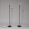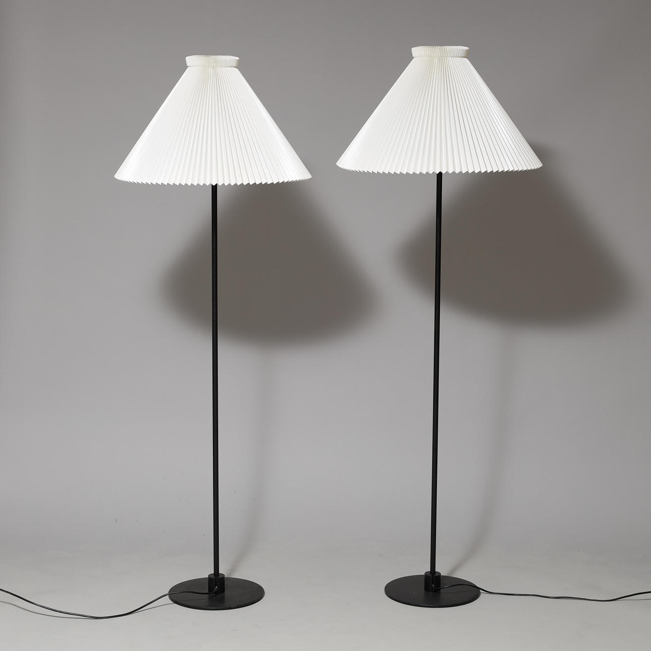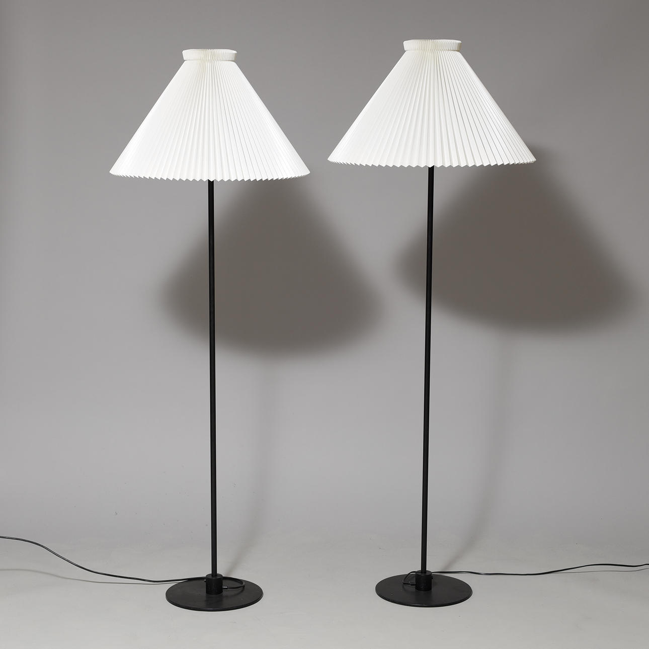 Et par model 369 standerlamper med sortlakeret stamme og fod, plisseret skærm, af Flemming Agger for Le Klint.