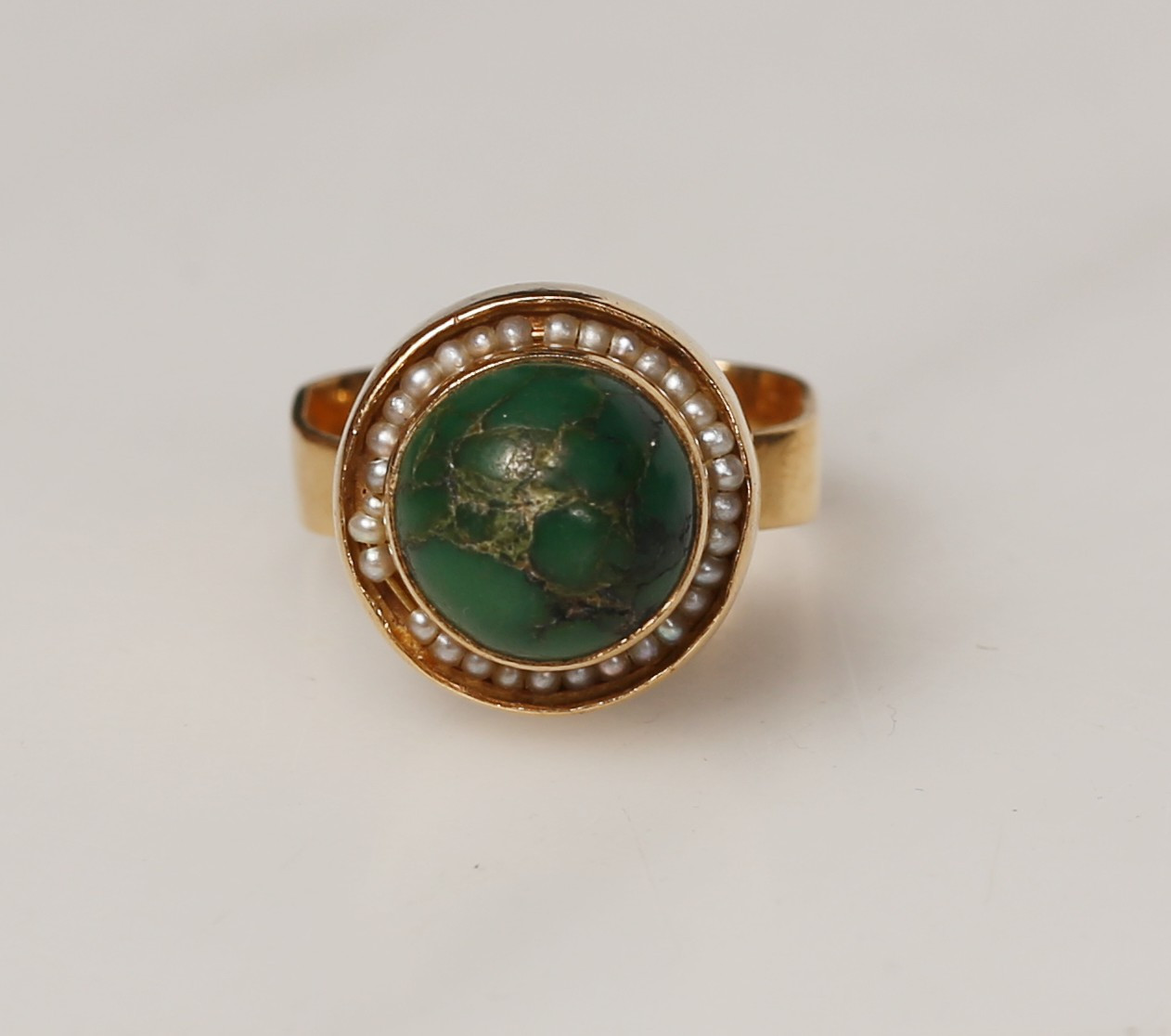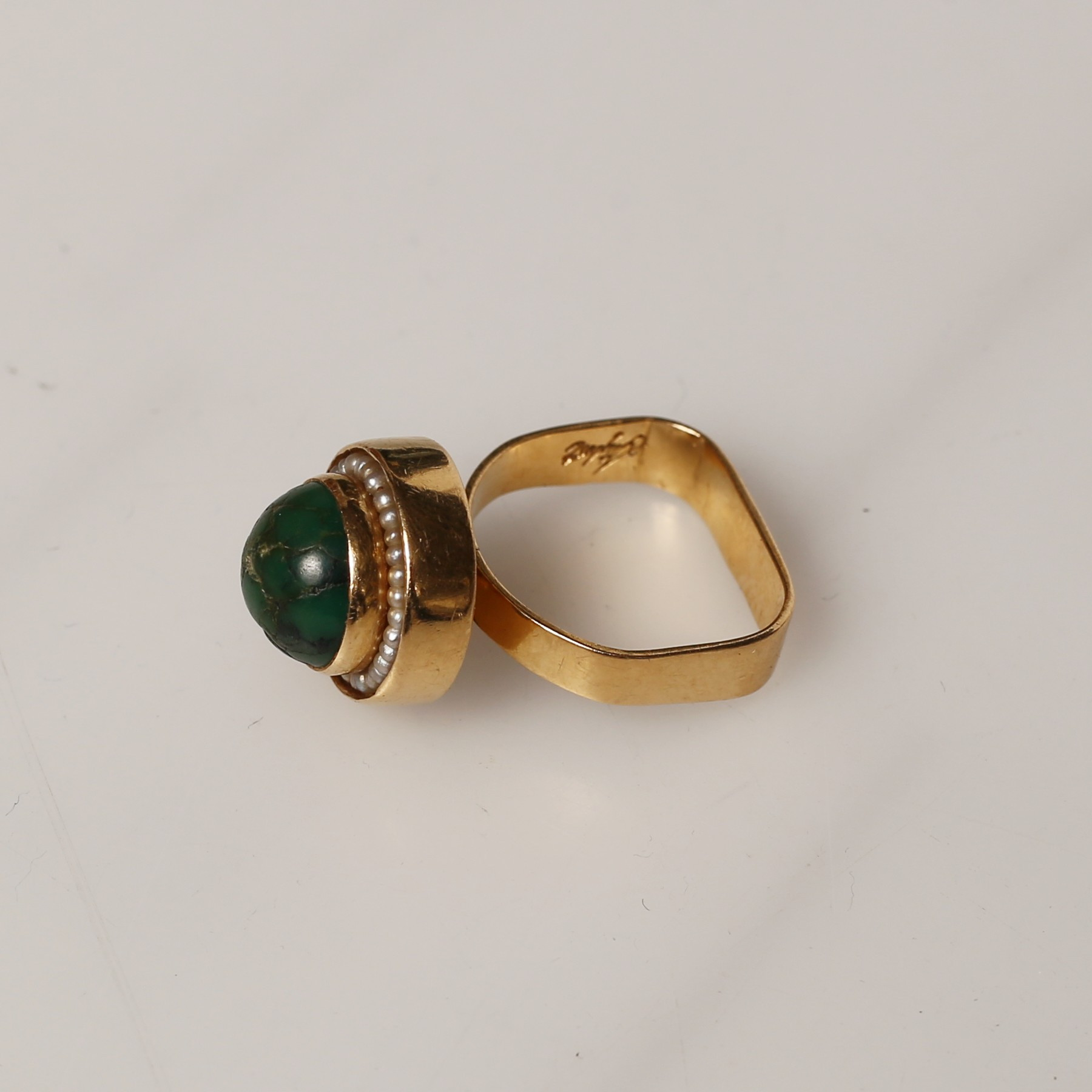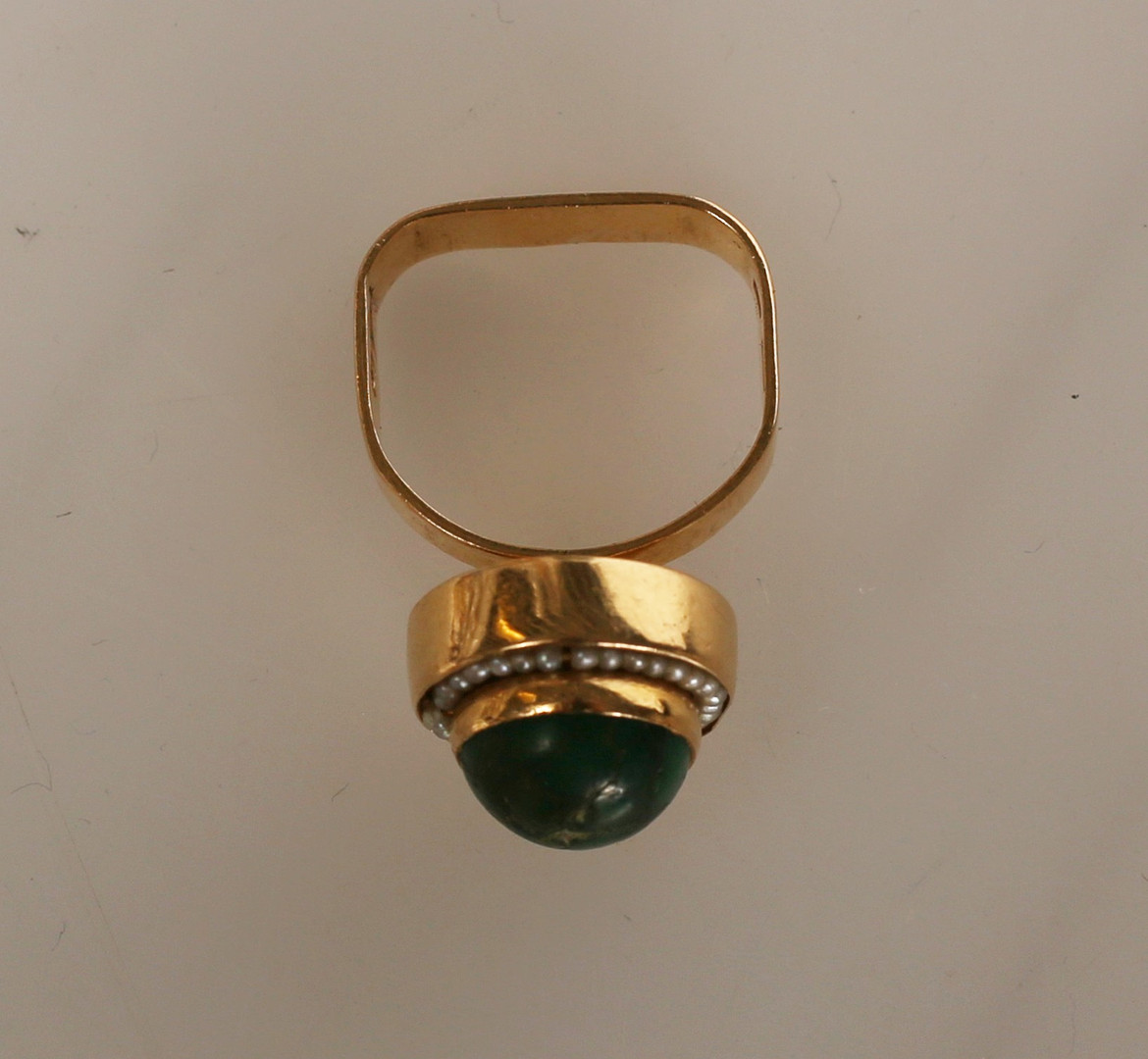 3335127. RING med perler og grøn sten, 18 kt guld, design Stigbert.
