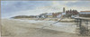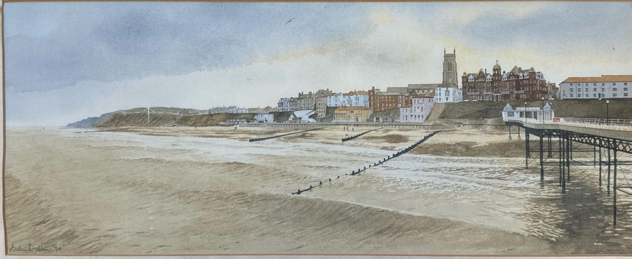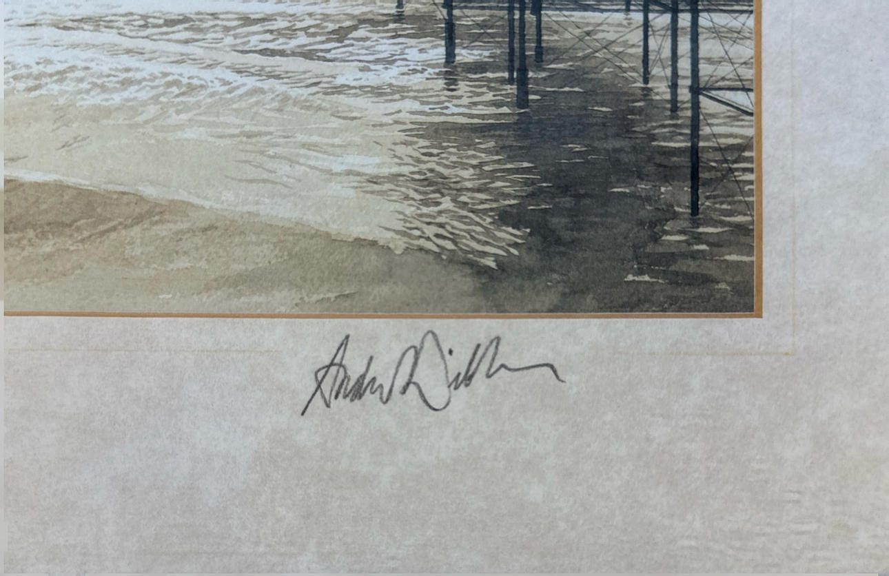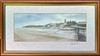 Et indrammet blyantsigneret tryk af Norfolk mole og strand af Andres Dibben dateret '94, rammestørrelse 51 x 29cm.