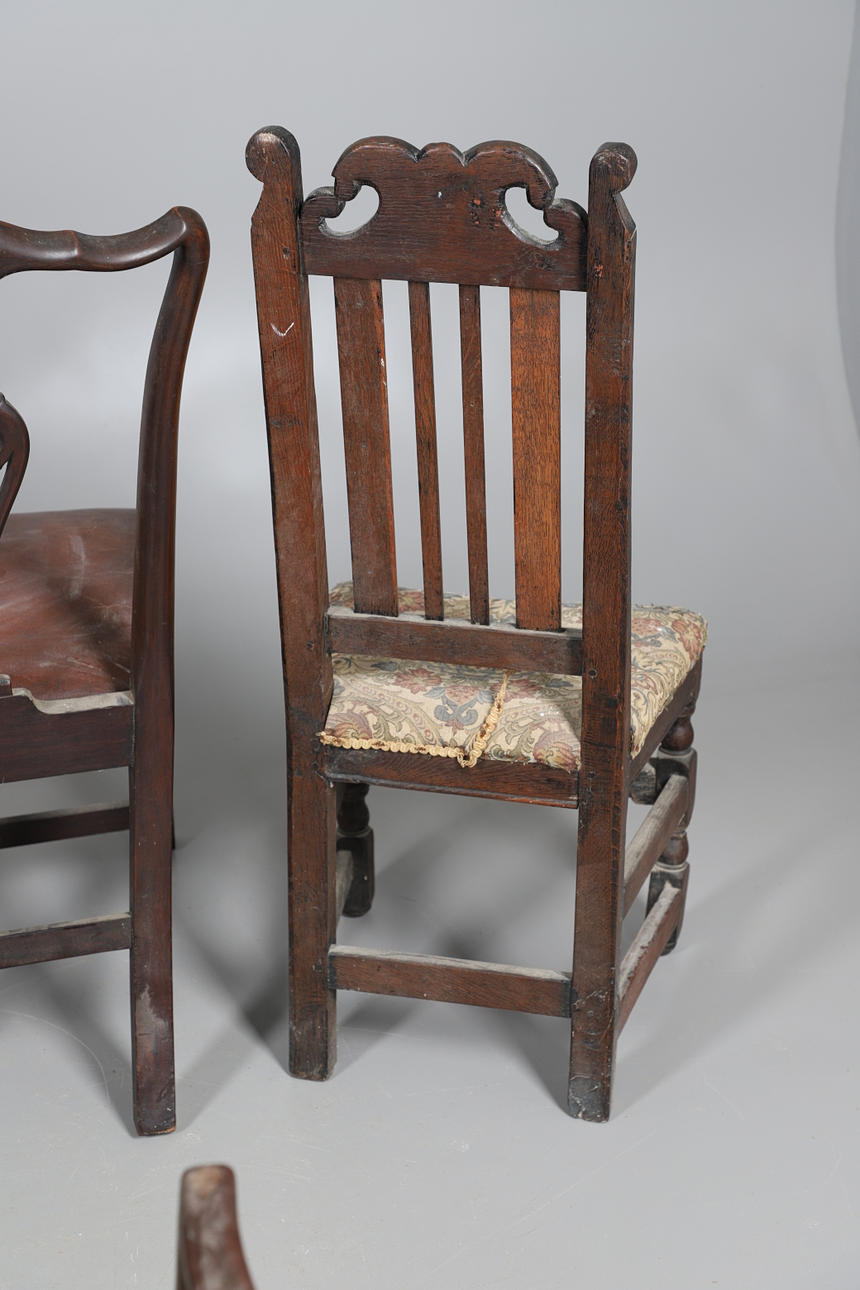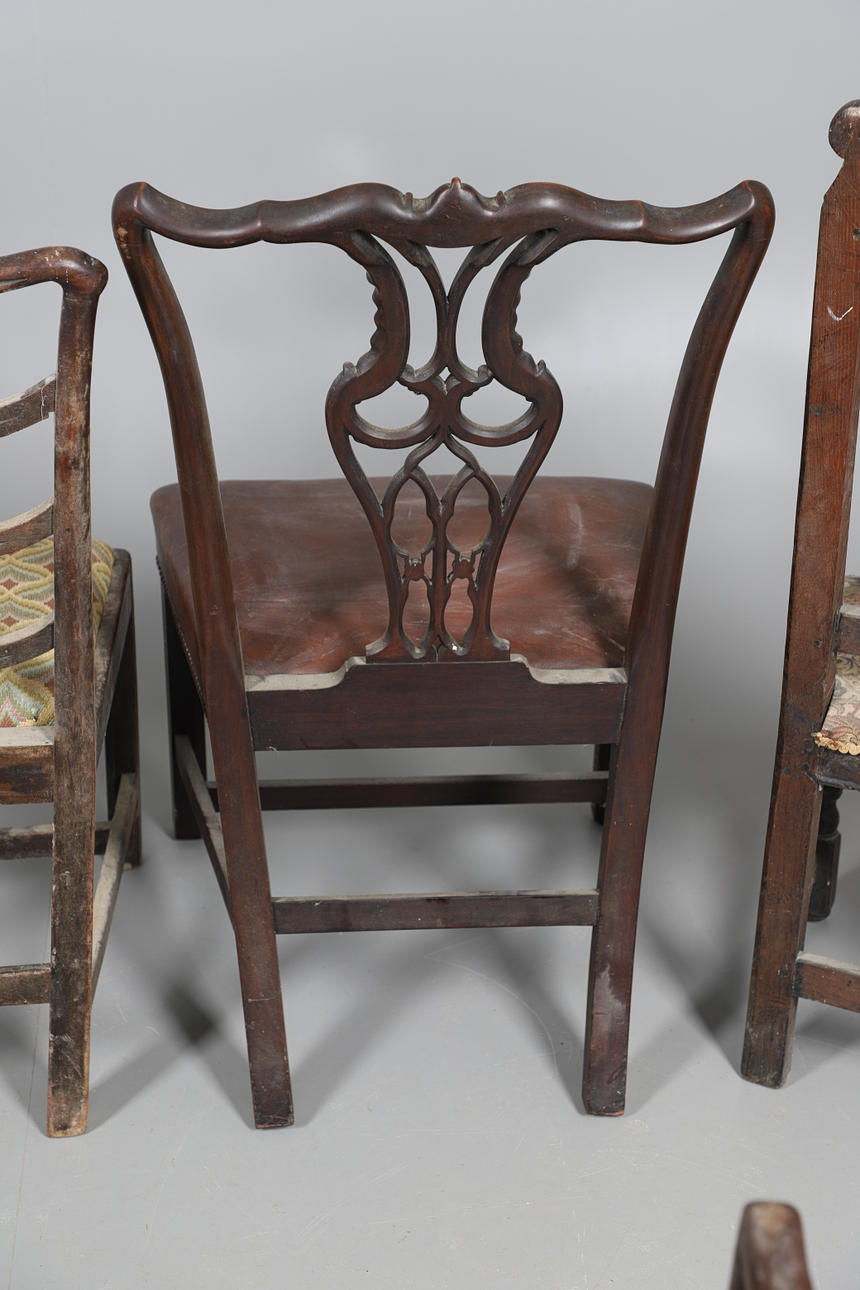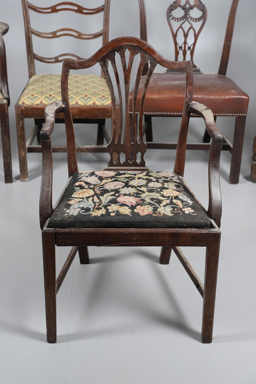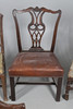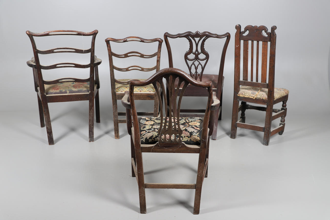 Fire af stolene med håndarbejdspolstrede sæder, tre falder ind og en fast. Forskellige stænk/ryg, herunder ladderback og hulsplats. Mahogni og egetræ konstruktion, nogle lænestole. Sammen med en læder siddestol. Lignende størrelser; Læderstolen måler; Sædehøjde 48cm, Samlet højde 98cm. (5).