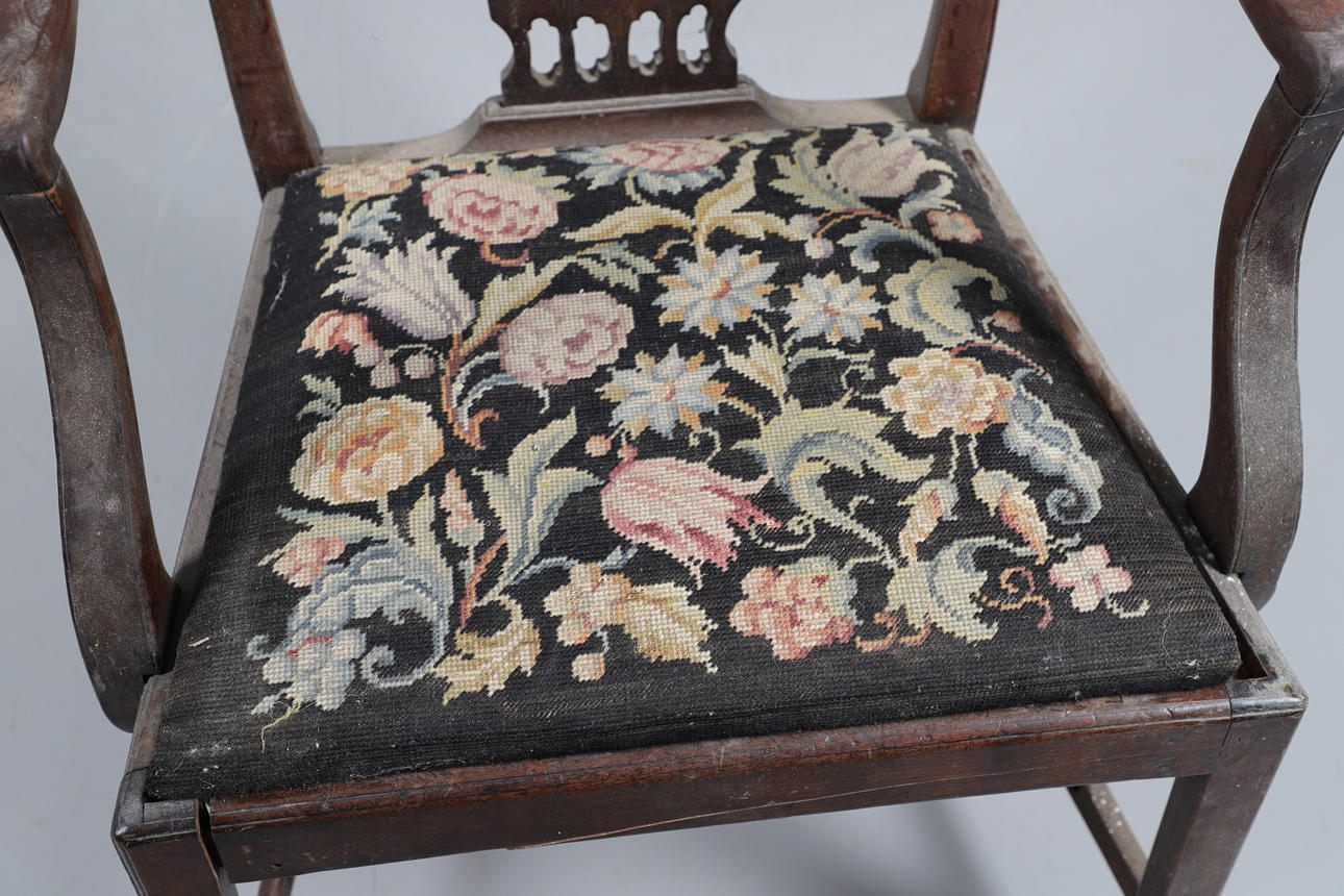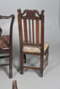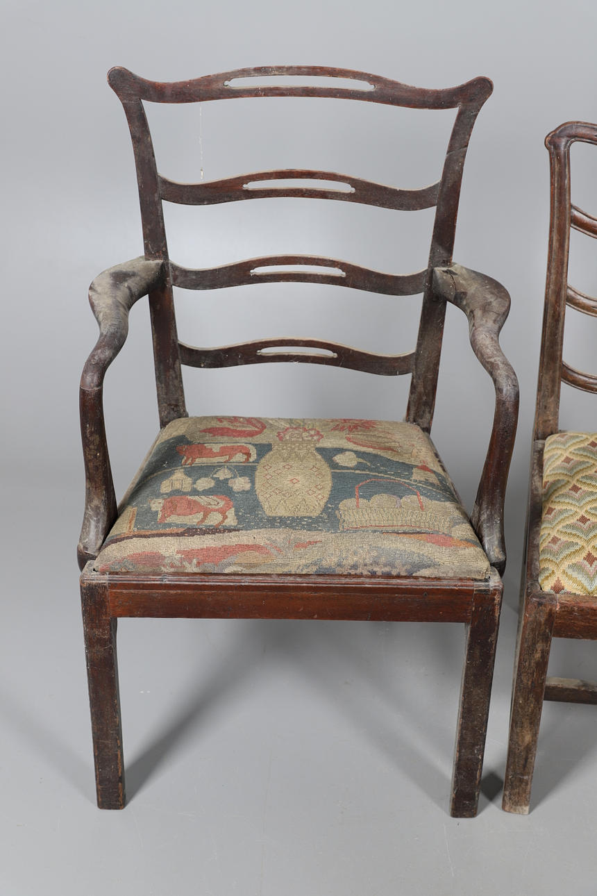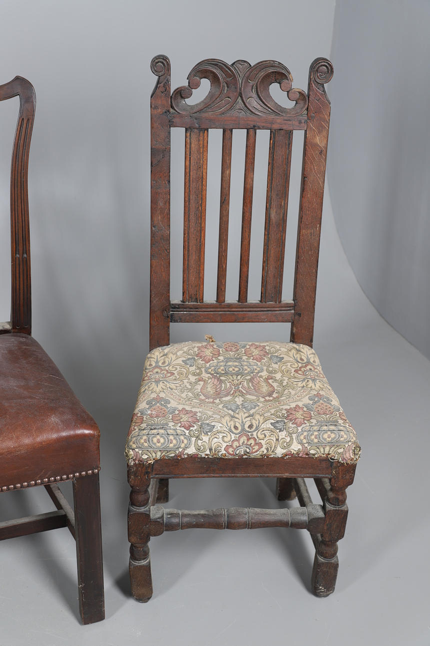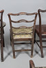 Fire af stolene med håndarbejdspolstrede sæder, tre falder ind og en fast. Forskellige stænk/ryg, herunder ladderback og hulsplats. Mahogni og egetræ konstruktion, nogle lænestole. Sammen med en læder siddestol. Lignende størrelser; Læderstolen måler; Sædehøjde 48cm, Samlet højde 98cm. (5).