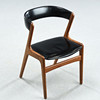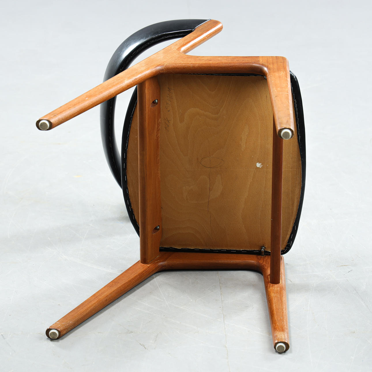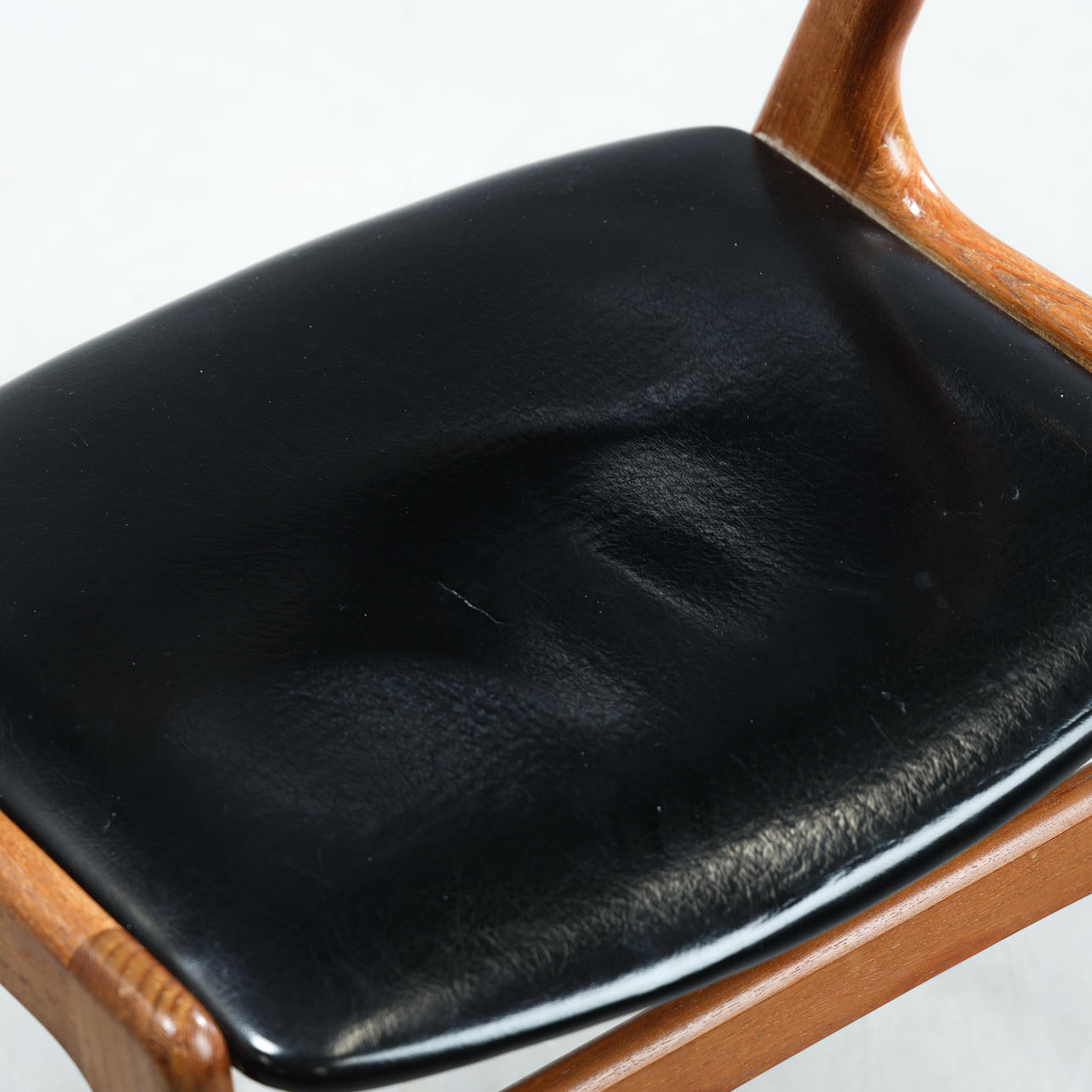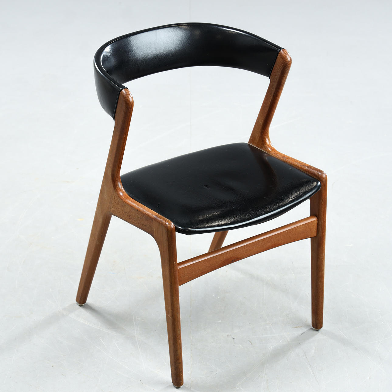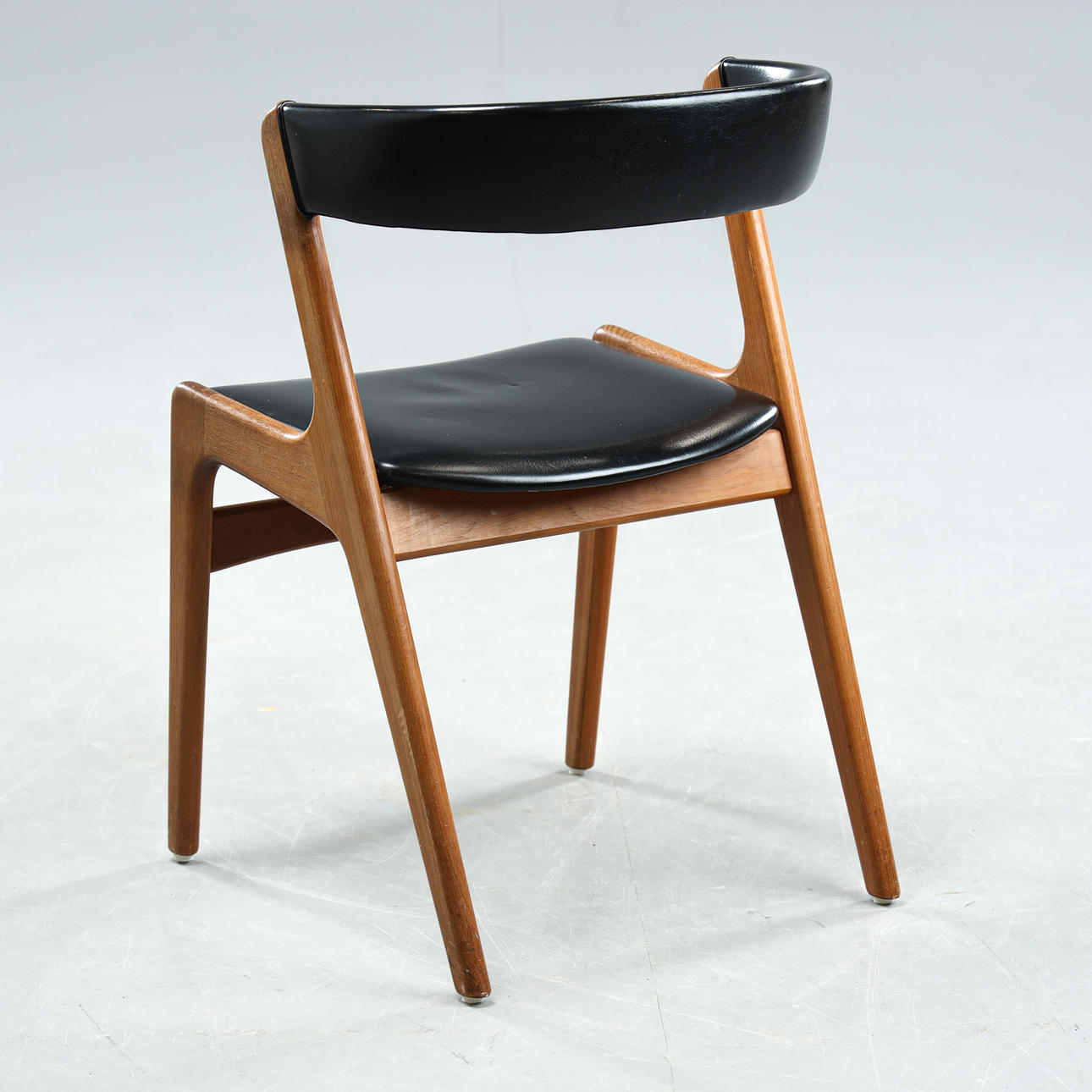 Ramme i teak. Sæde og ryg betrukket med kunstlæder. Sædehøjde ca. 45 cm.