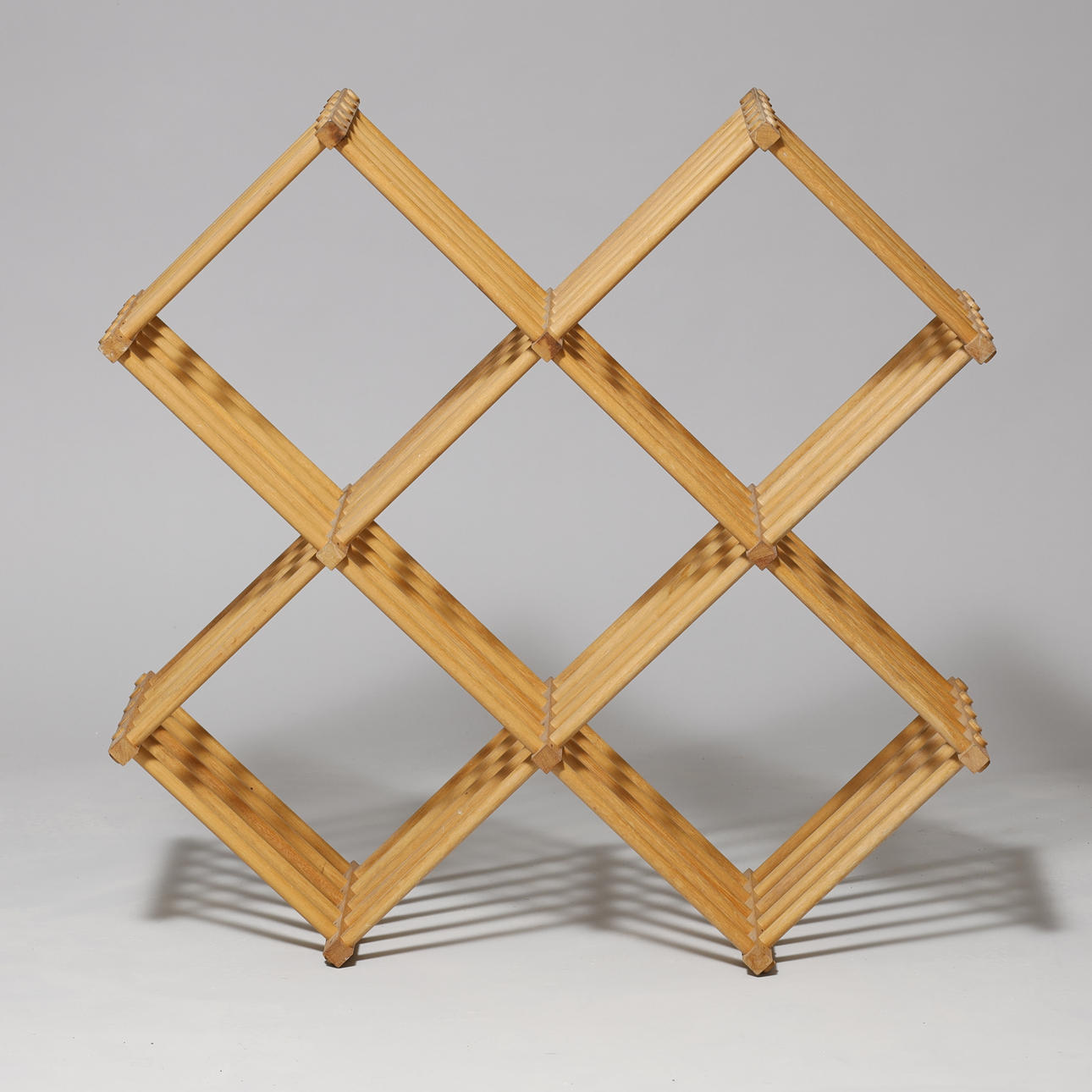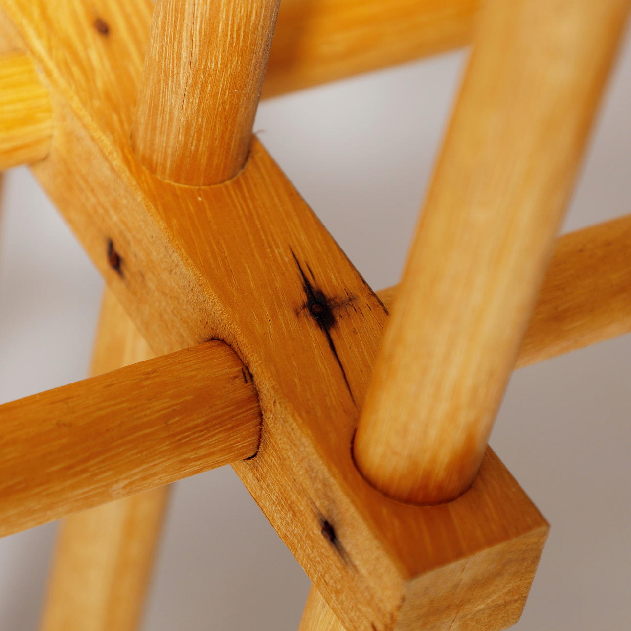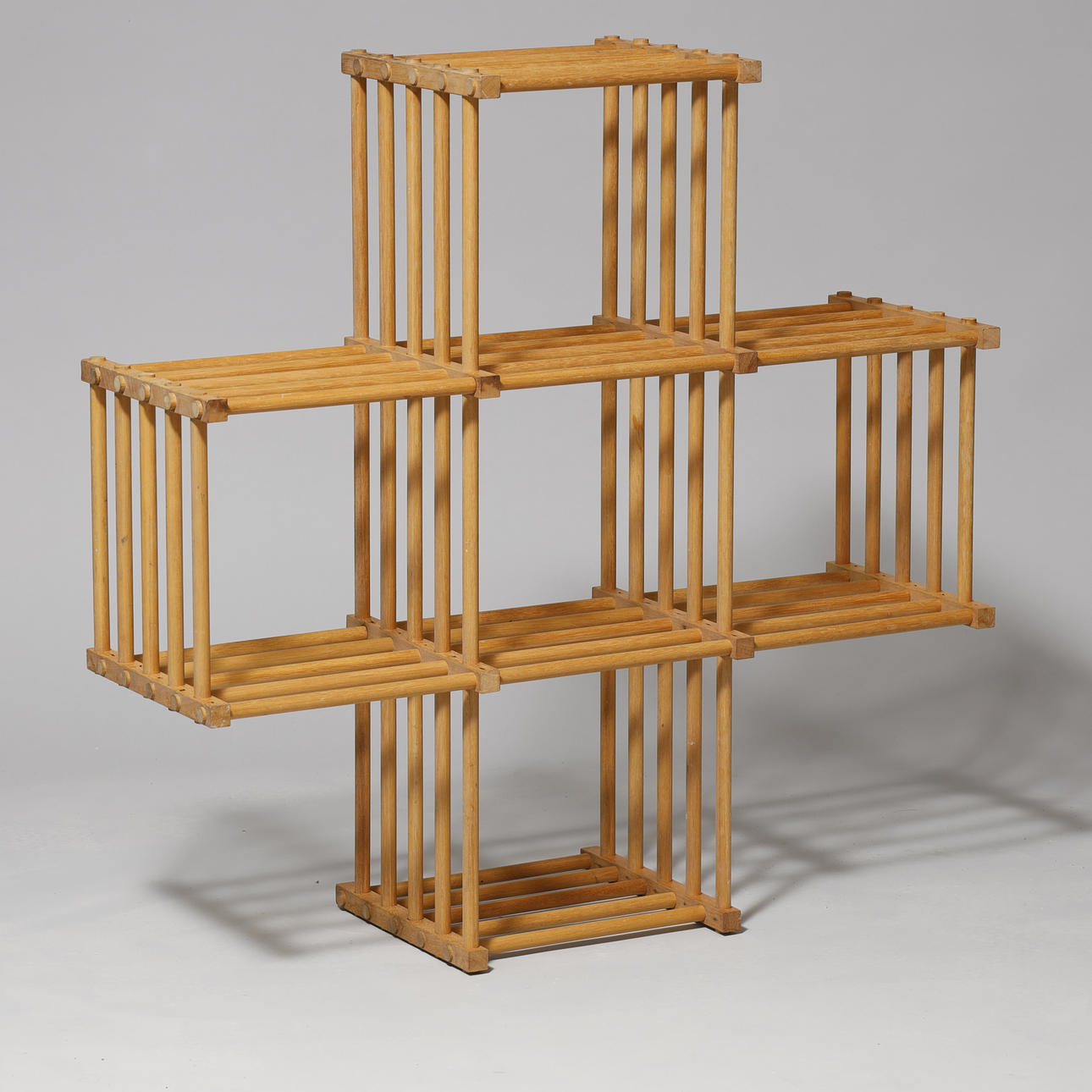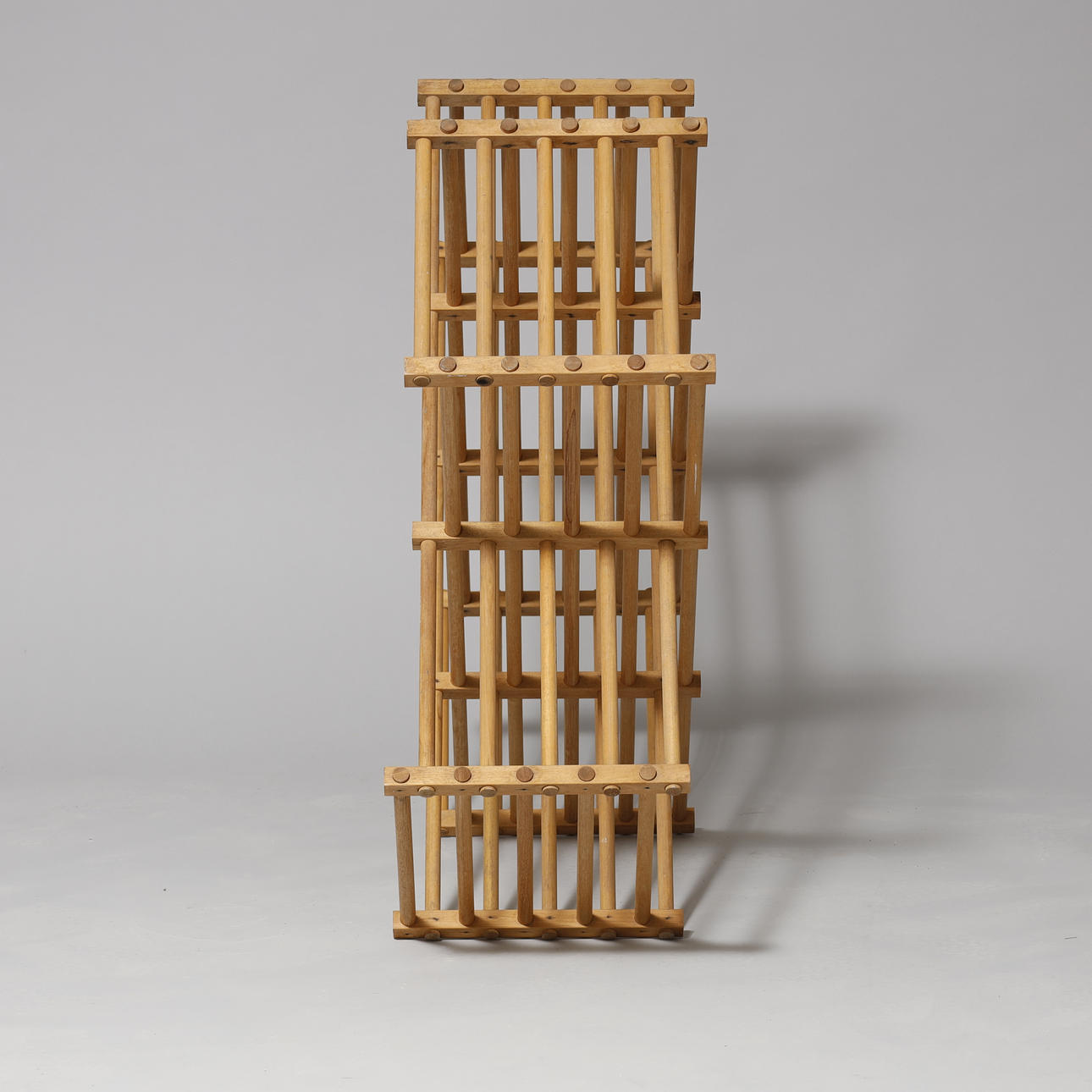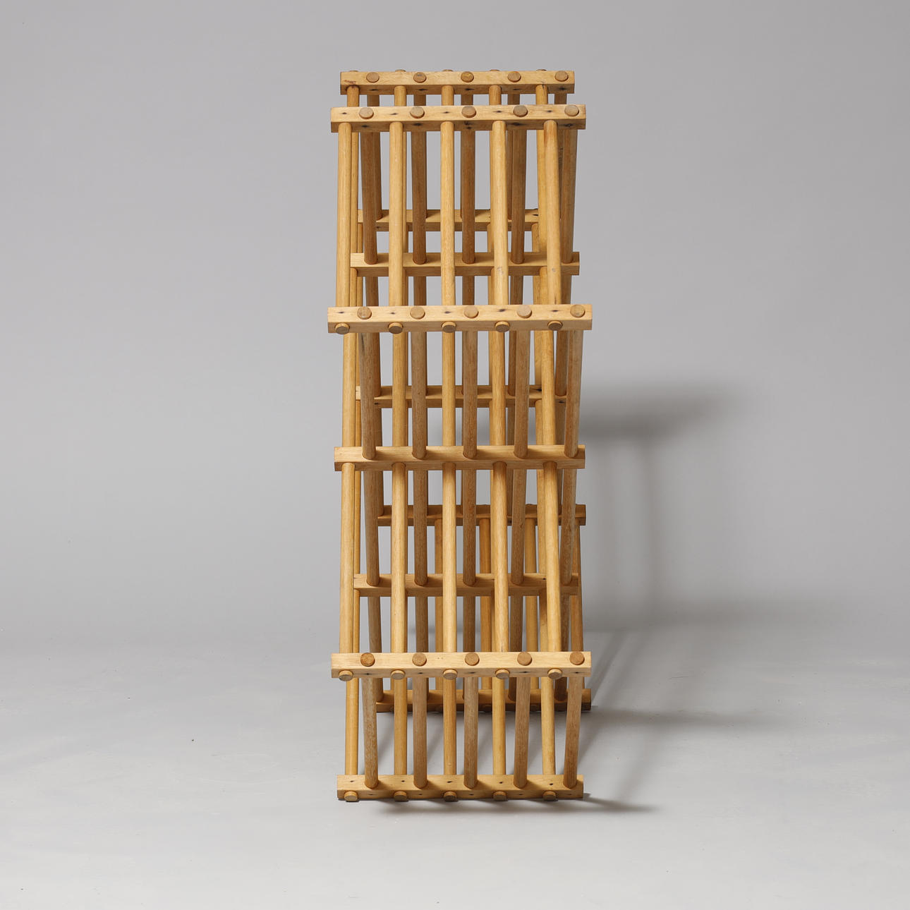 Skulpturel reol med rundstokke af bøgetræ.
