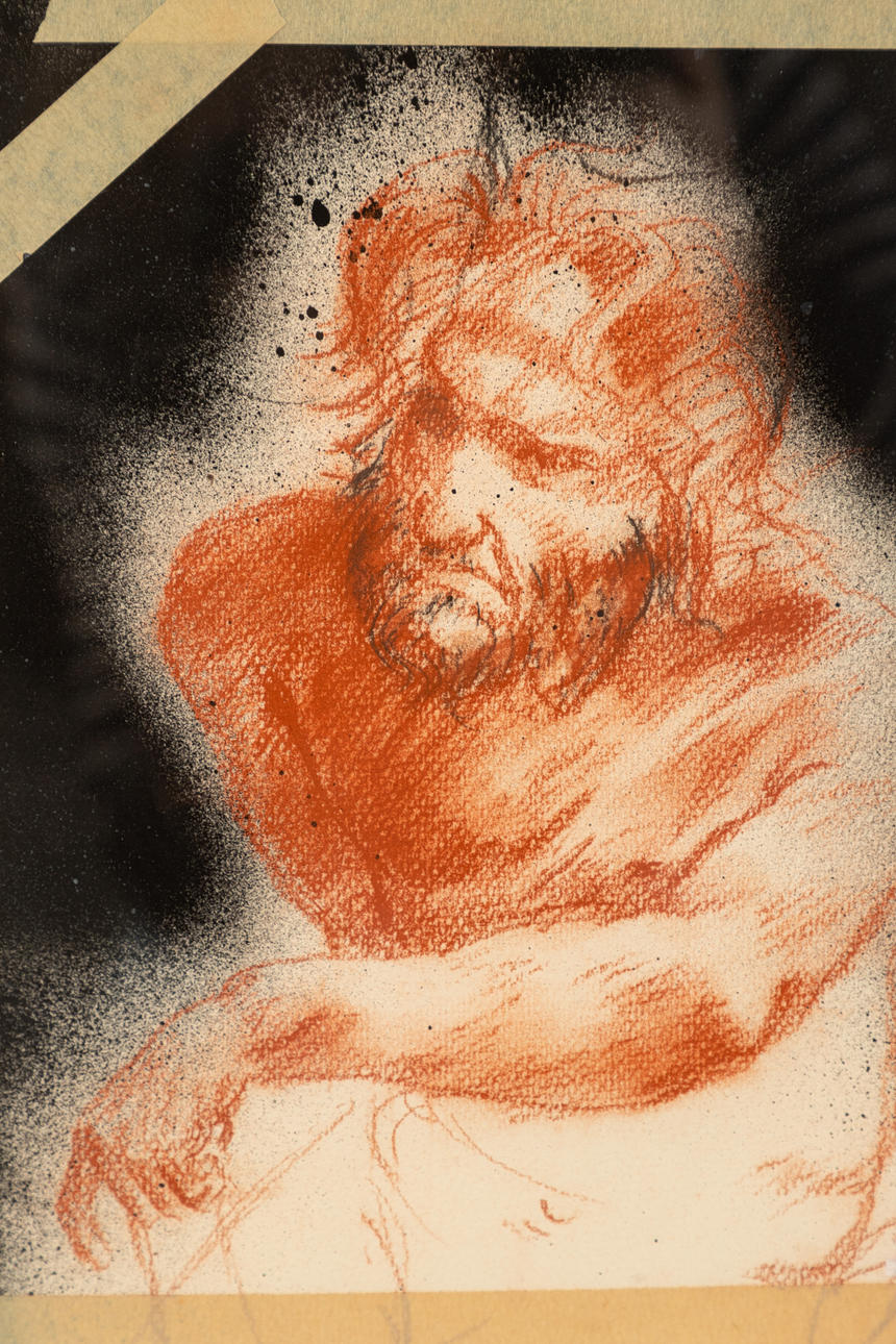 Troels Wörsel (1950-2018), Hercules, blandede medier, tegning med collage på papir, med titel og indskrift, ca. 49 x 31 cm, indrammet bag passepartout og glas, med ramme ca. 62 x 44 cm