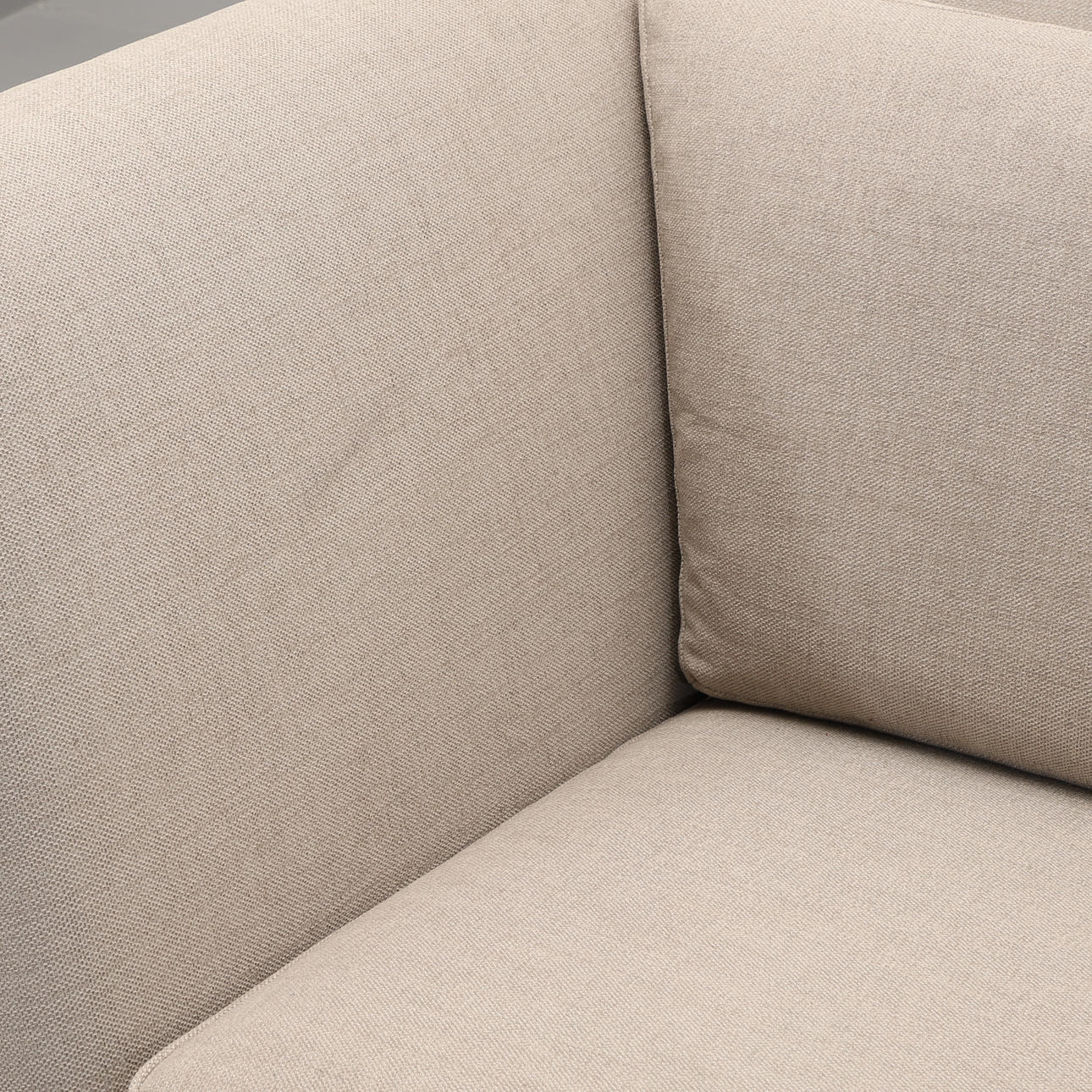 2-delt. Fuldbetrukket med løse polstrede puder, betrukket med gråt stof. Dekor negle. Længde 118+118=236 cm, dybde 103, sædehøjde ca. 40 cm.