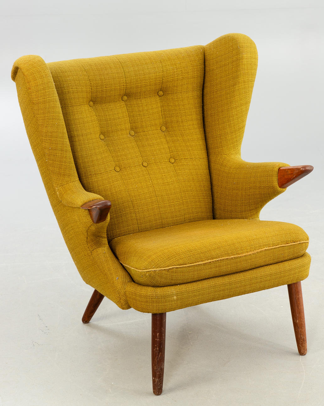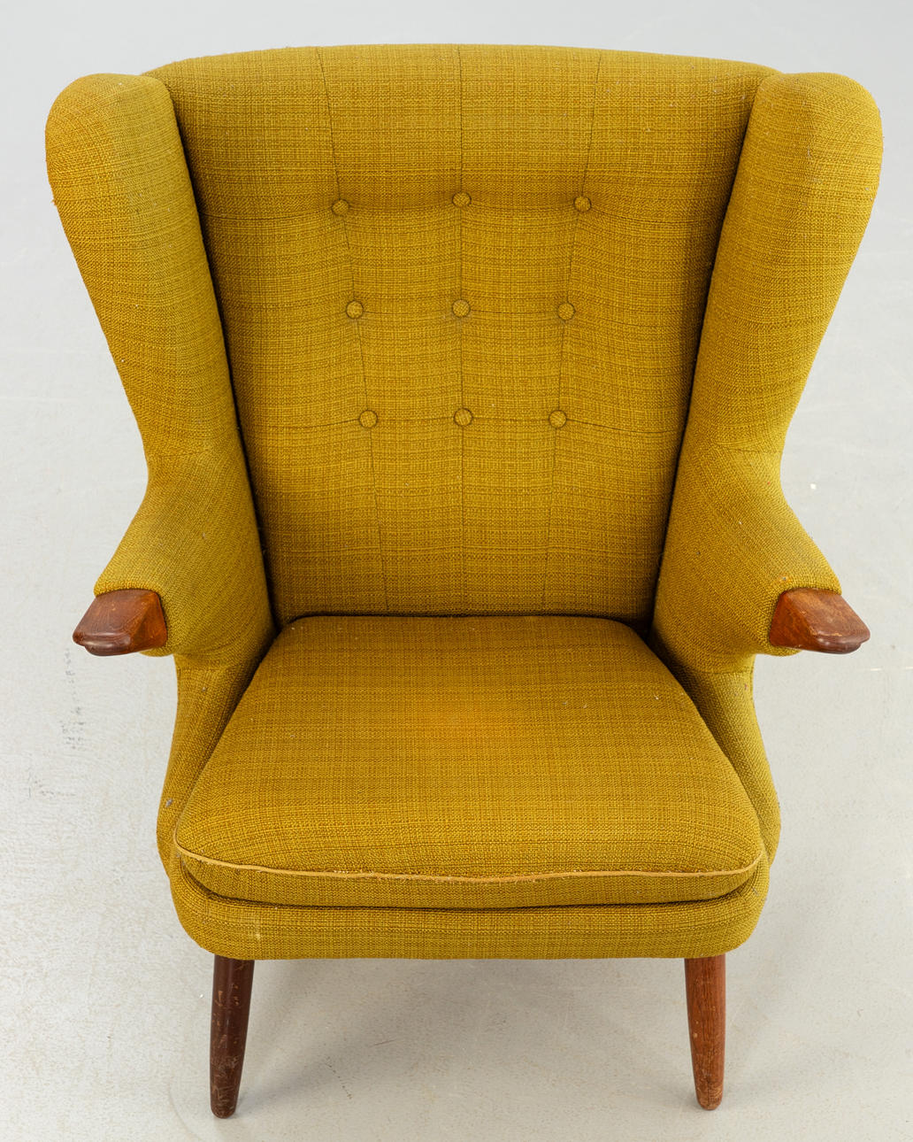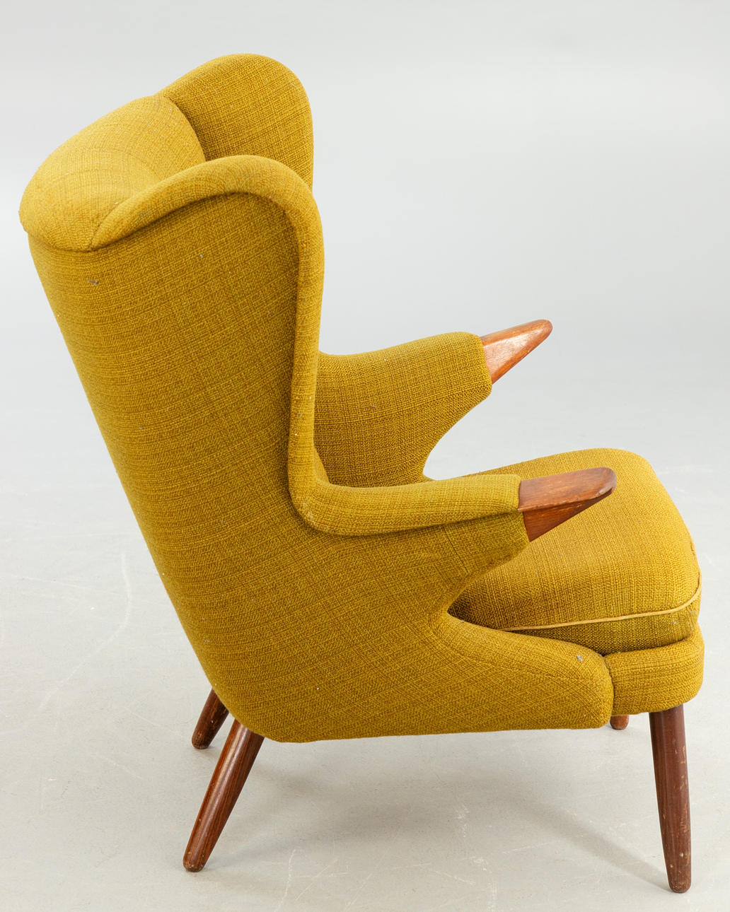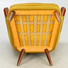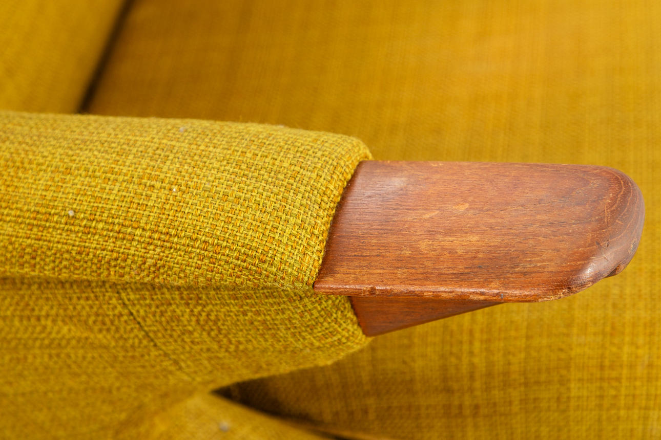 Teak ben og armlæn. Sennepsgult uldstof