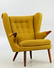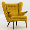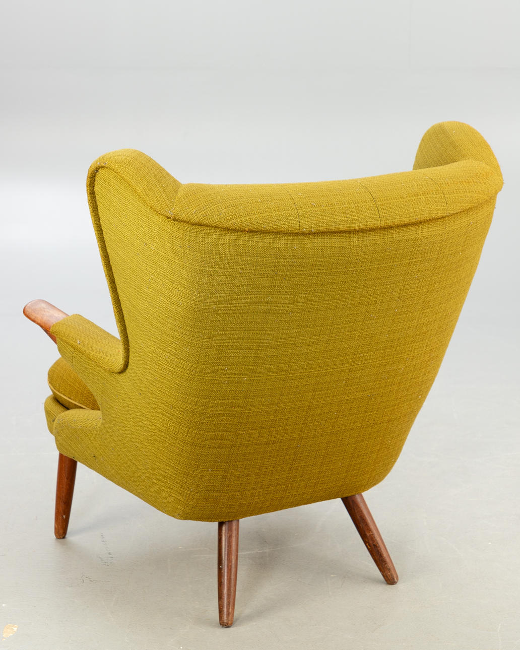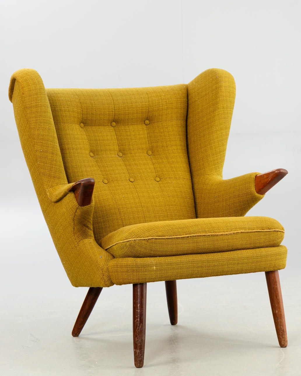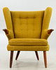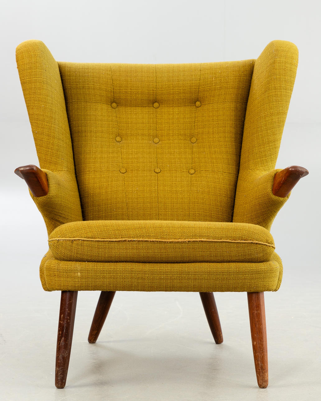 Teak ben og armlæn. Sennepsgult uldstof