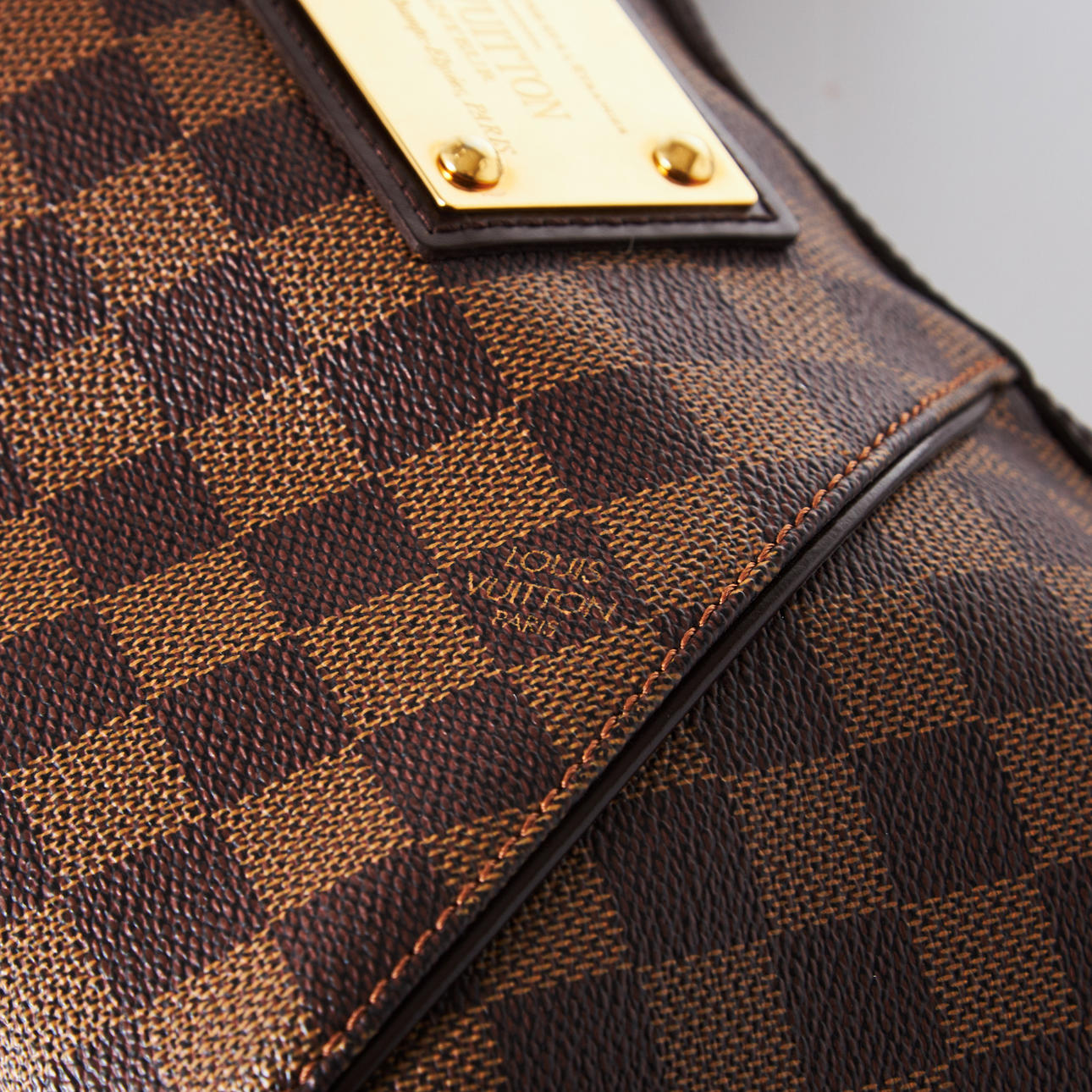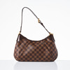Skuldertaske i damier ebene lærred med læder og gule metaldetaljer, justerbar skulderrem, indvendigt foret med rødt tekstil, to mindre rum, datokode AR4190, Frankrig 2010.