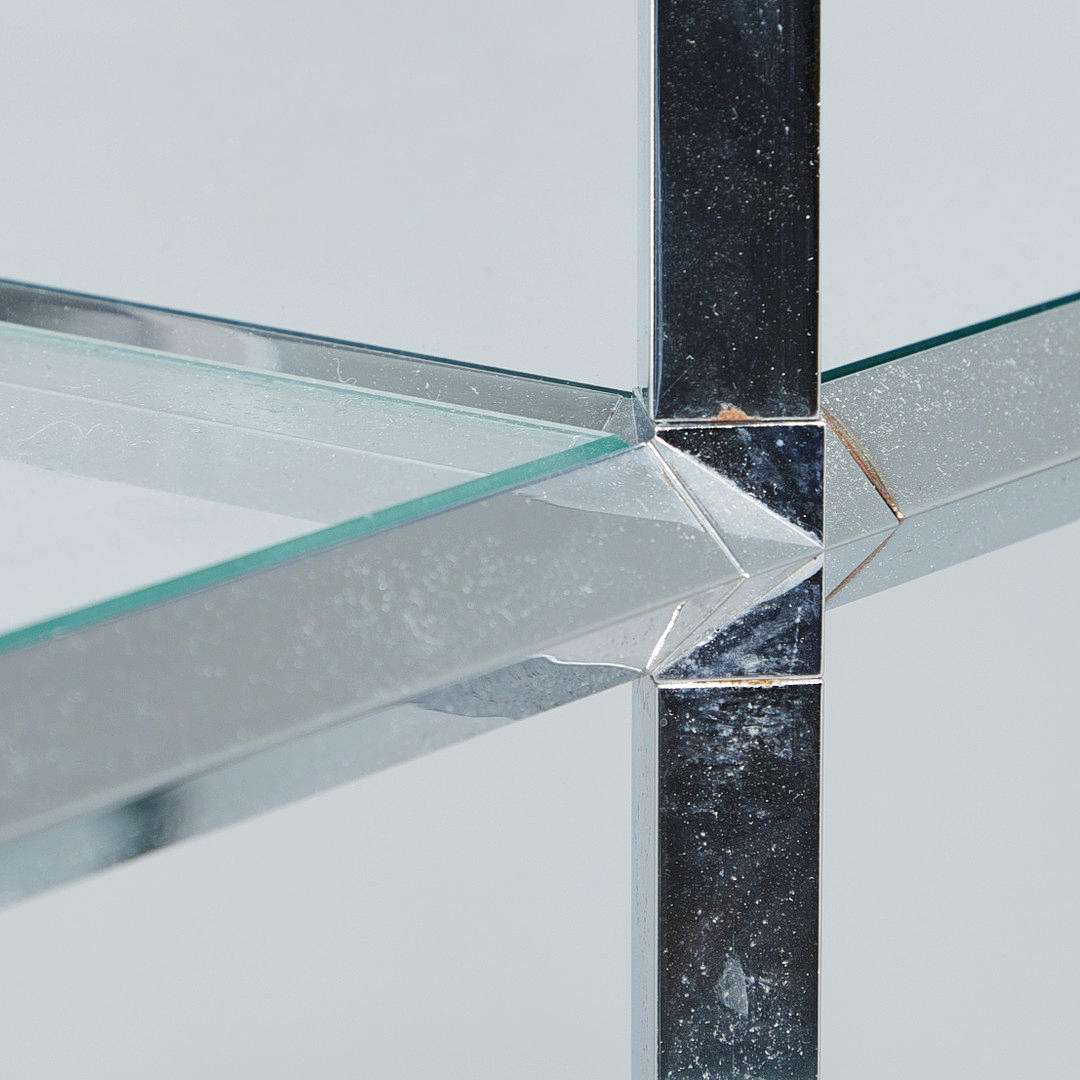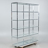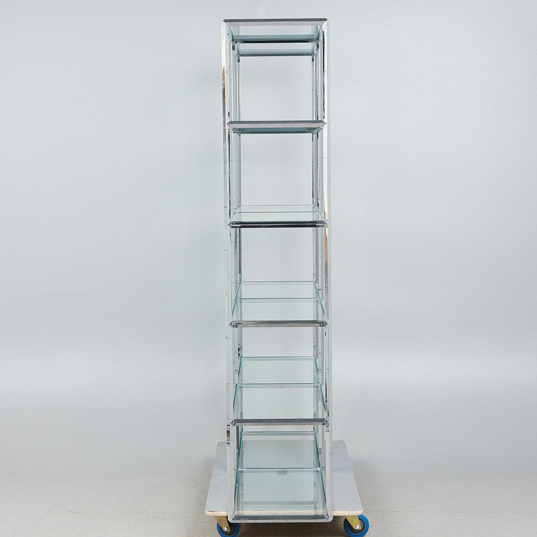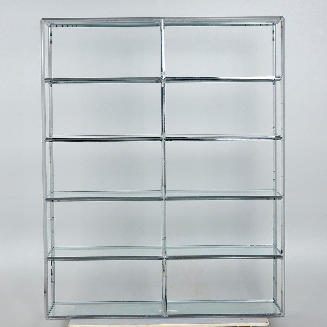 Væghylde/rumdeler, metal, forkromet, glas. Forkromet metalkonstruktion med tolv rektangulære, løst placerede glashylder, H.180cm, W.145cm, D.39cm.