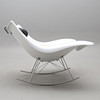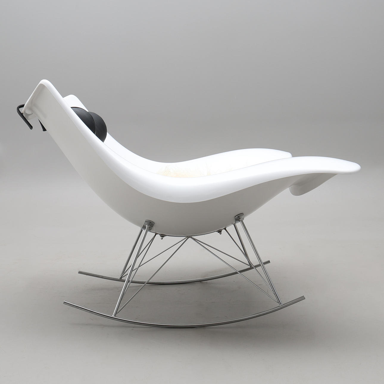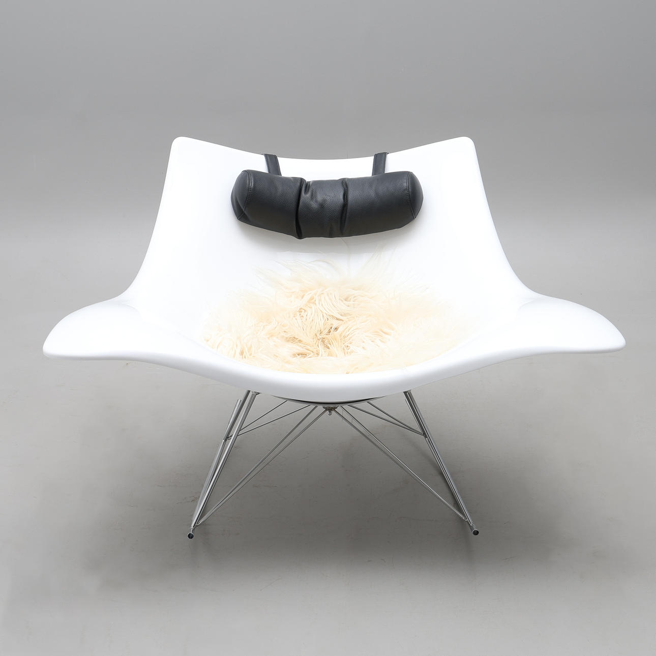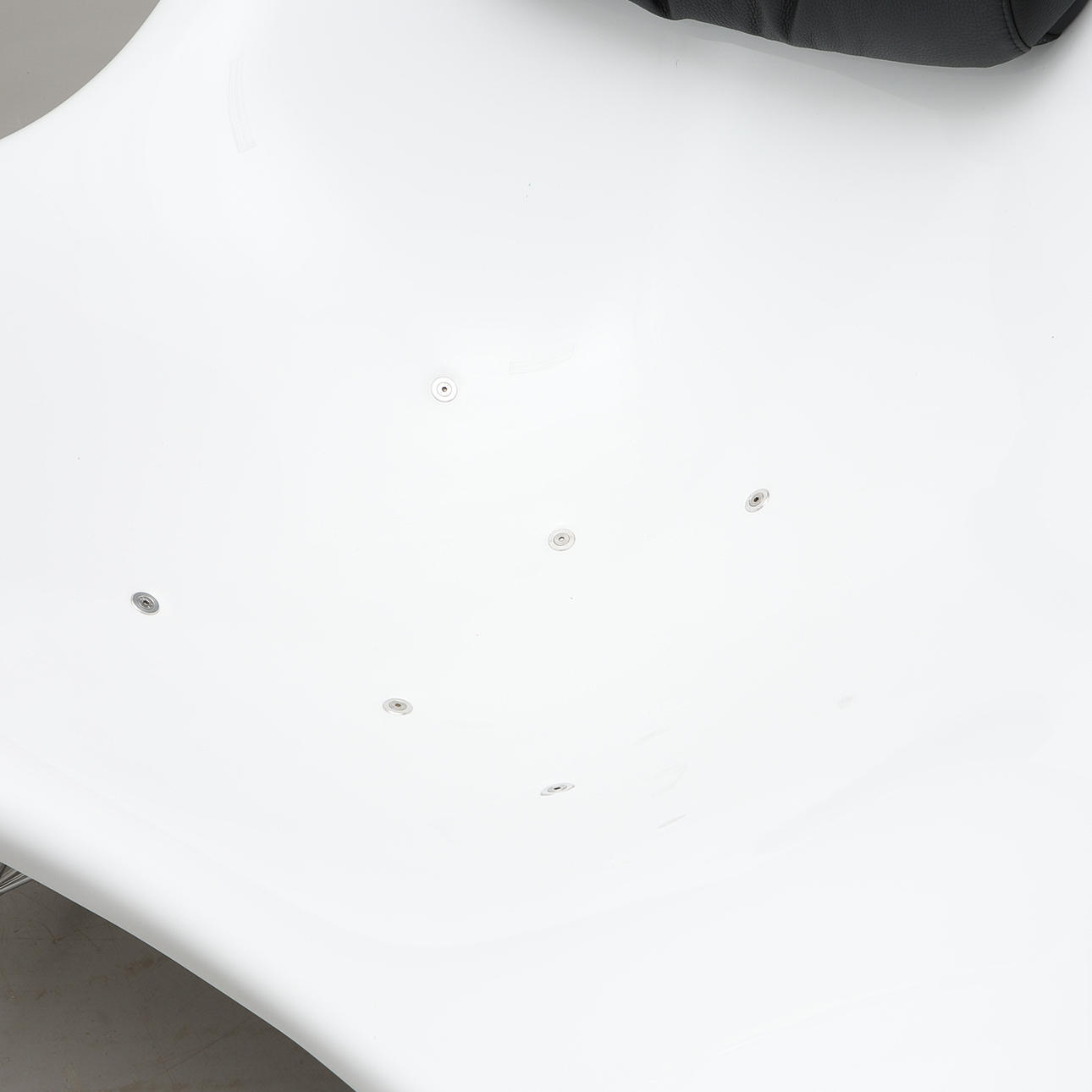 Lavet af hvid plast med forkromet stålunderstel, nakkepude lavet af sort læder og hvid fårepels, mærke Federicia møbler, Danmark, højde 45, bredde 120 cm.