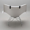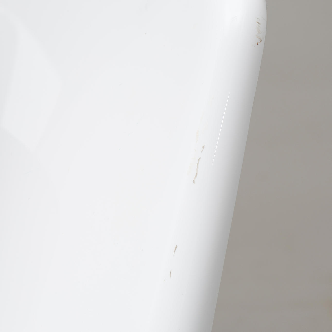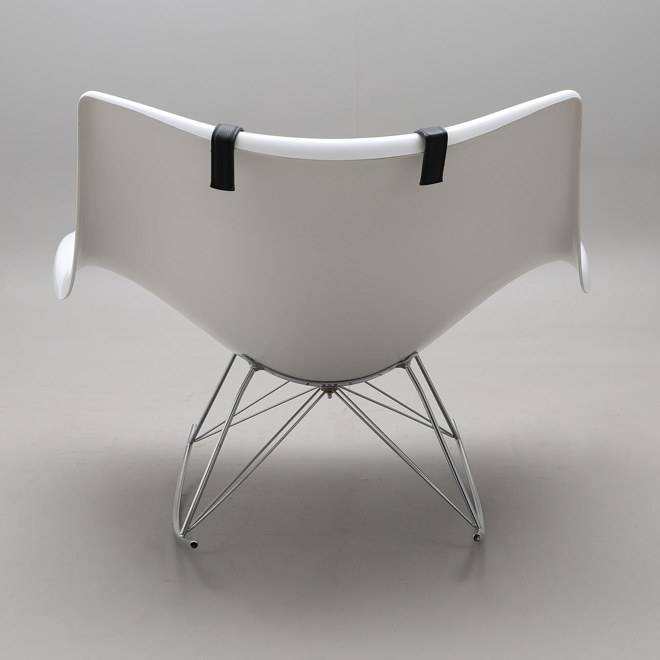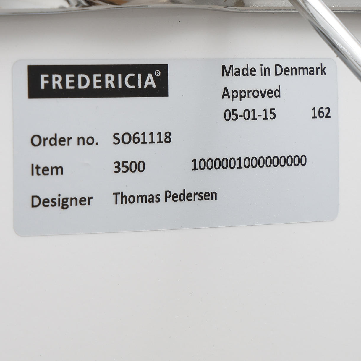 Lavet af hvid plast med forkromet stålunderstel, nakkepude lavet af sort læder og hvid fårepels, mærke Federicia møbler, Danmark, højde 45, bredde 120 cm.