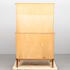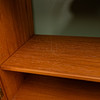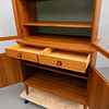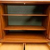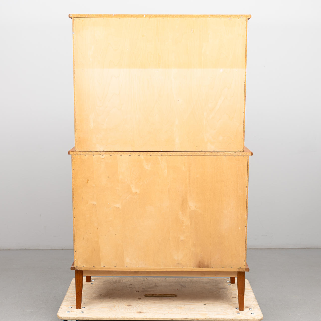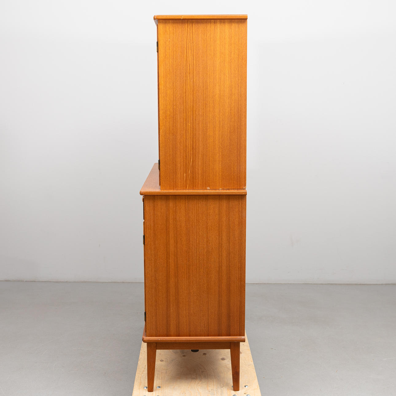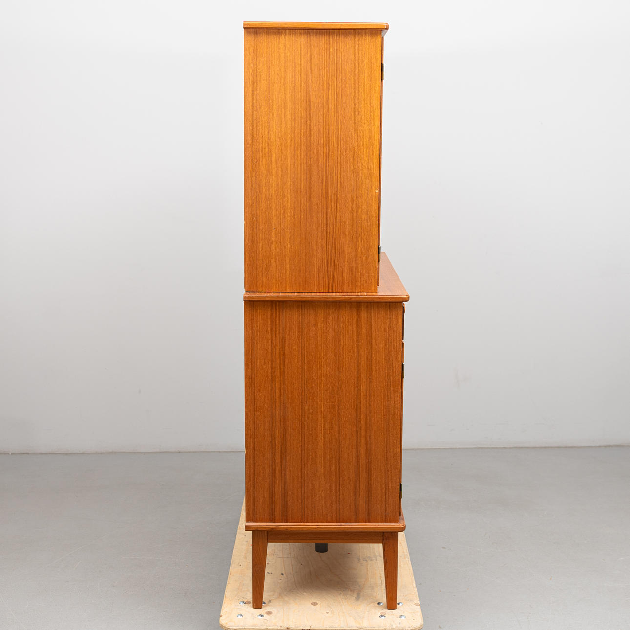 Todelt glasplade med dobbelte døre, to indvendige og aftagelige hylder. Bund med to udvendige skuffer, riflede dobbeltdøre med baghylder. Længde ca 104, dybde 47, højde 170 cm.