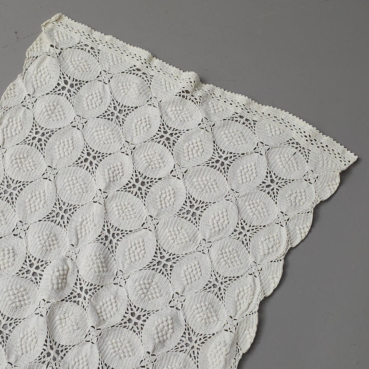 3395367. HÆKLET SENGETÆPPE MED PUDEBETRÆK. HVID FARVE.