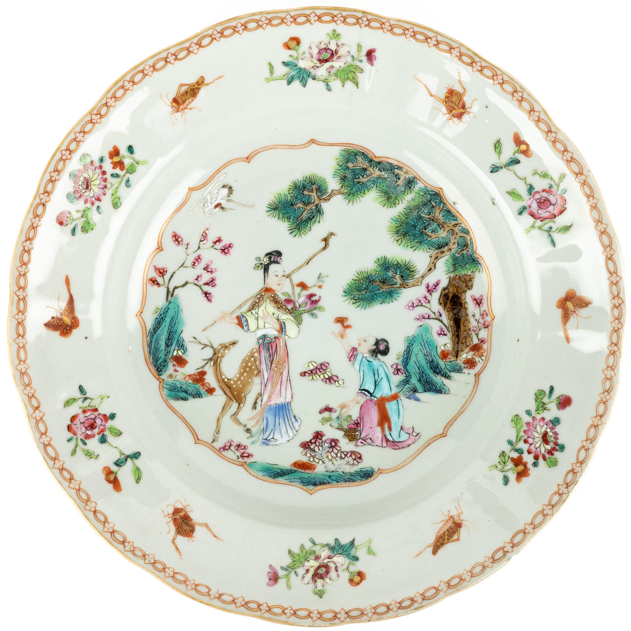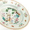Dybe tallerkener med let kontureret kant, indretning i familierosen paletten af figurscene omgivet af strøede blomster og fårekyllinger og sommerfugle, diam. 23 cm.