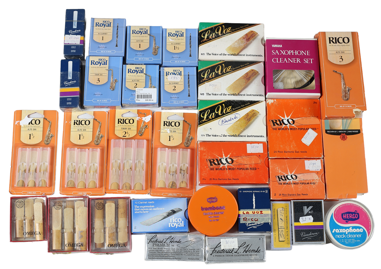 Betingelse for brug. Alle pakker er brudte og med ufuldstændigt indhold tilbage undtagen 4 Rico „Alto Sax/Tenor“, 1 La Voz „Baritone Sax Reeds“ og 1 Vandoren „Sax“. Baryton“.