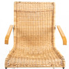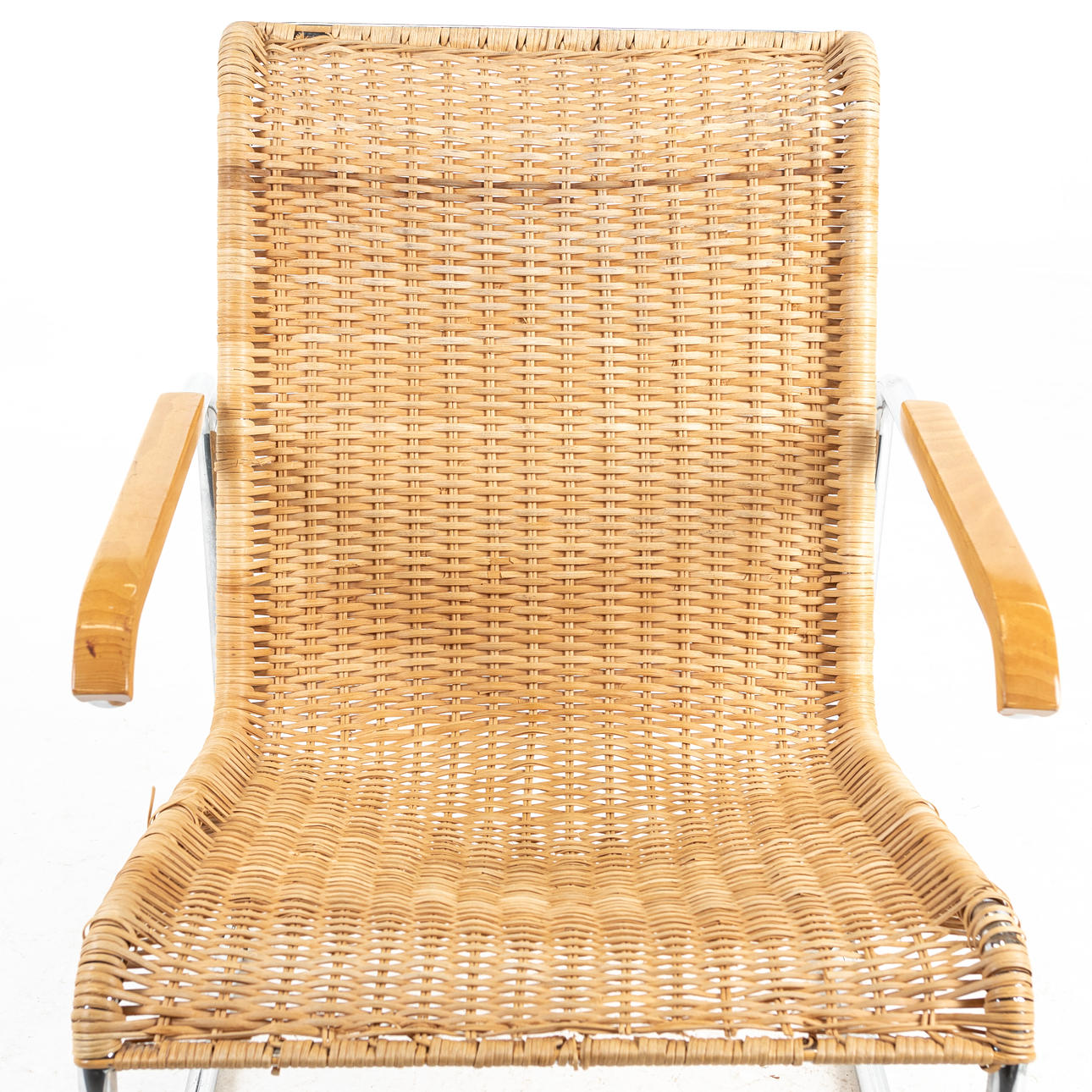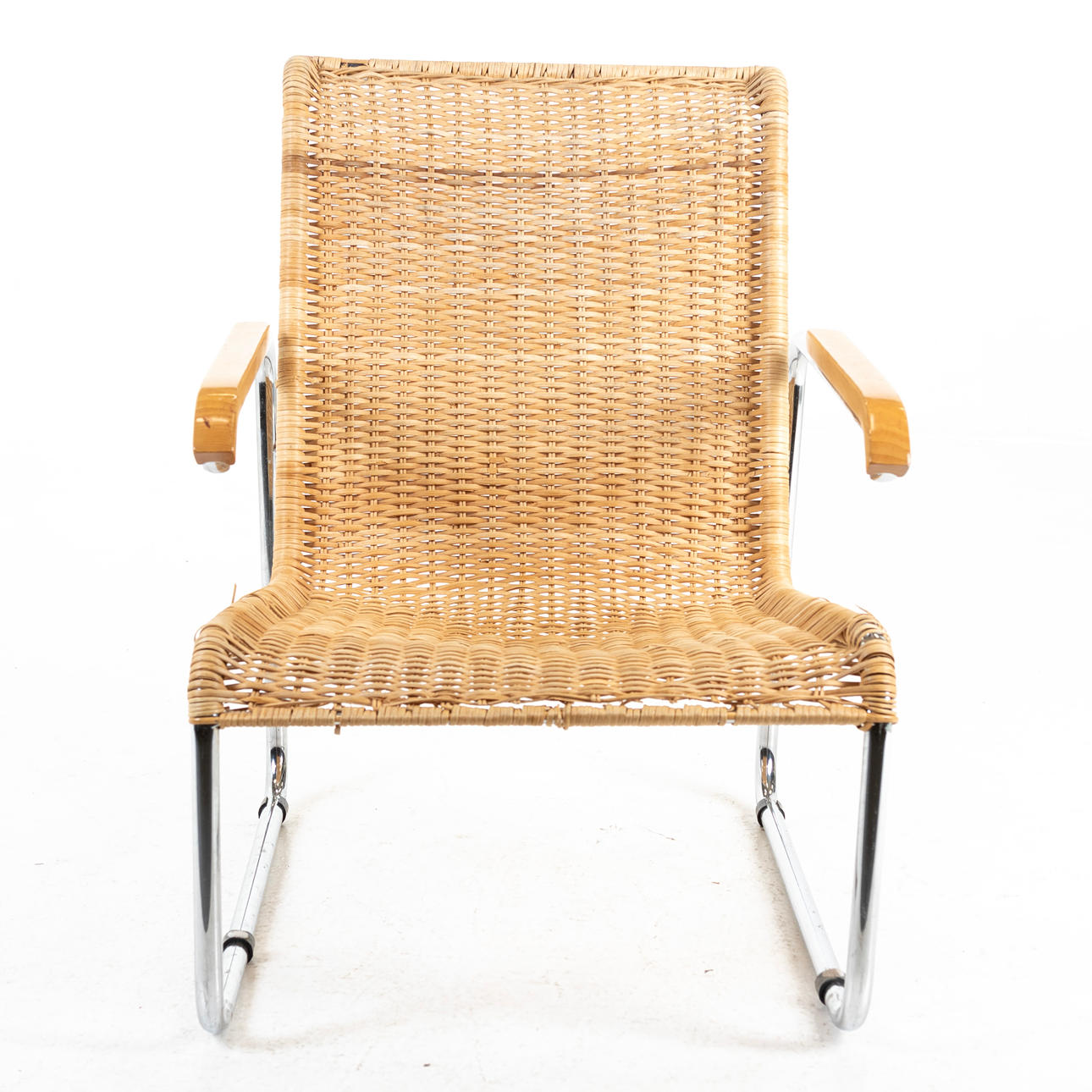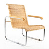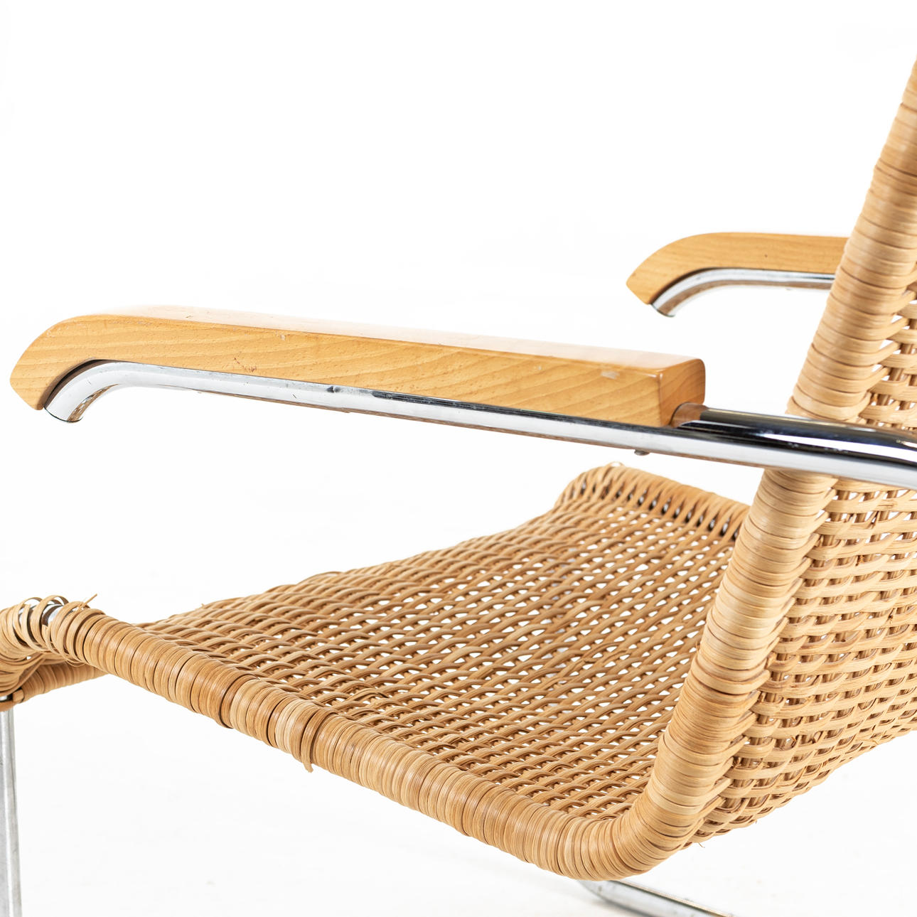 Forkromet stålrørramme med flettet rotting i sæde og ryg. Bøgetræ i armlængde