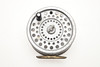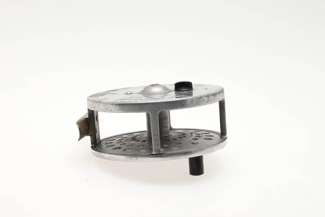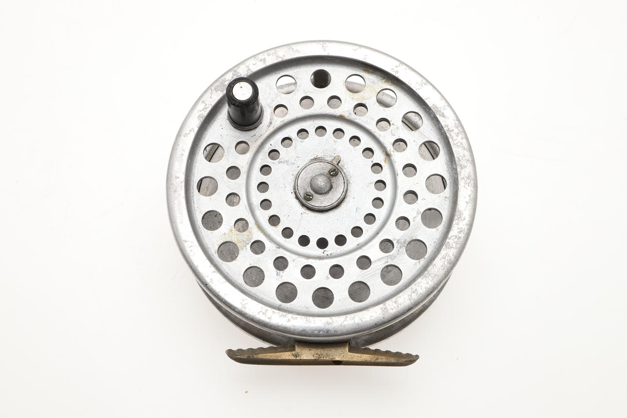 En stor 4 tommer legeringsrulle med en messingfod, mærket 'Marquis Salmon N 2, Made by Hardy Bros Ltd, England'.