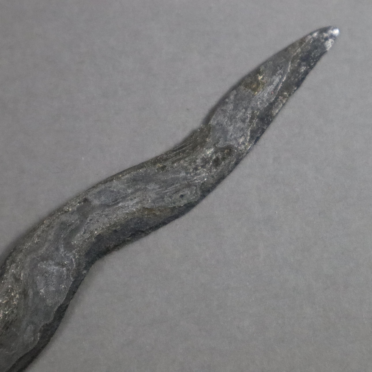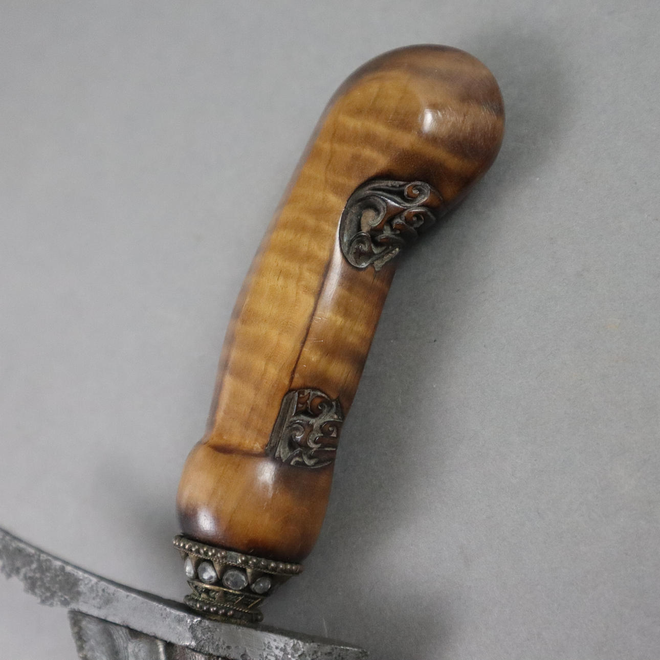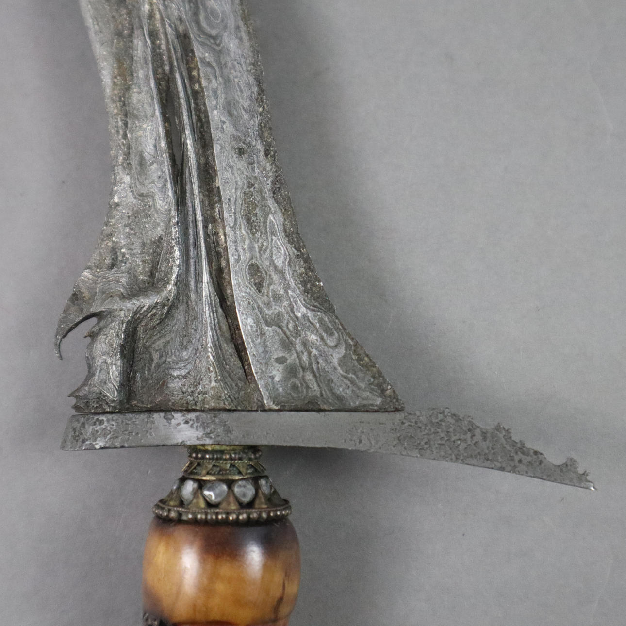 bølget blad/ dapur sangkelat med pamor, Nunggak halvtræskaft, selut med farveløse dekorative sten, længde ca. 45 cm (klinge op til ca. 35,8 cm).