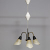 Tre armet loftskrone af messing med skærme af "kraftig pergament " H. ca 40 cm ( ex ledning) Diam ca 50 cm.