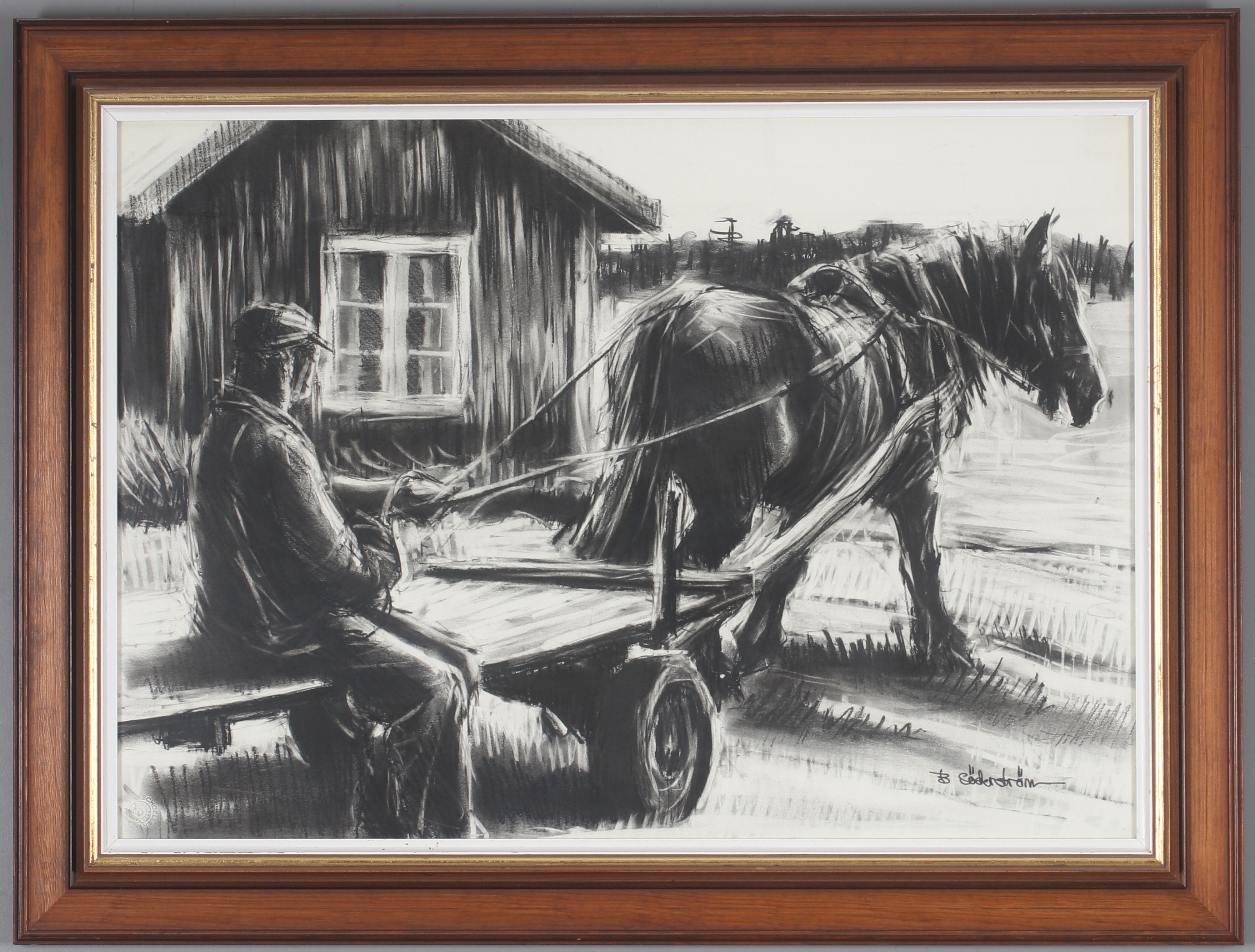 3412269. BERTIL SÖDERSTRÖM. Arbejdshest, trækulstegning, signeret.