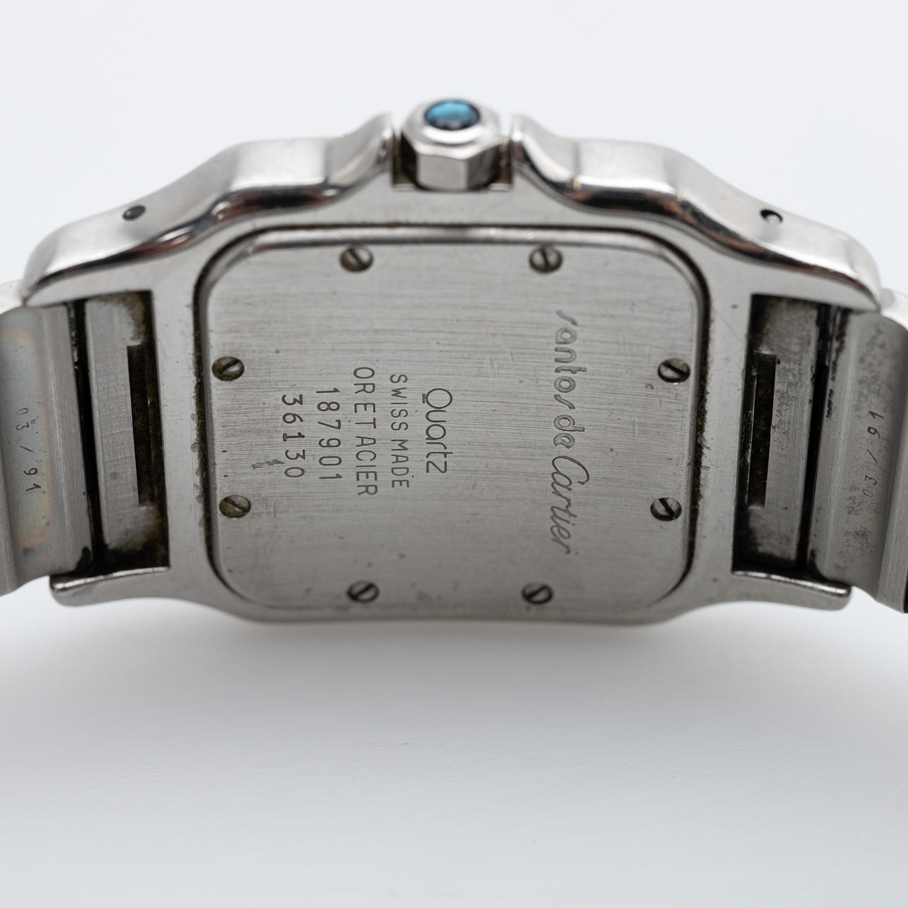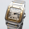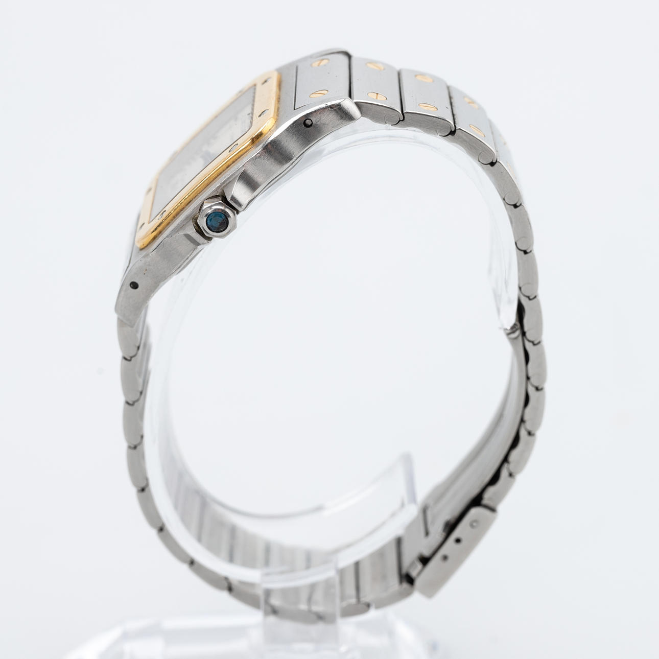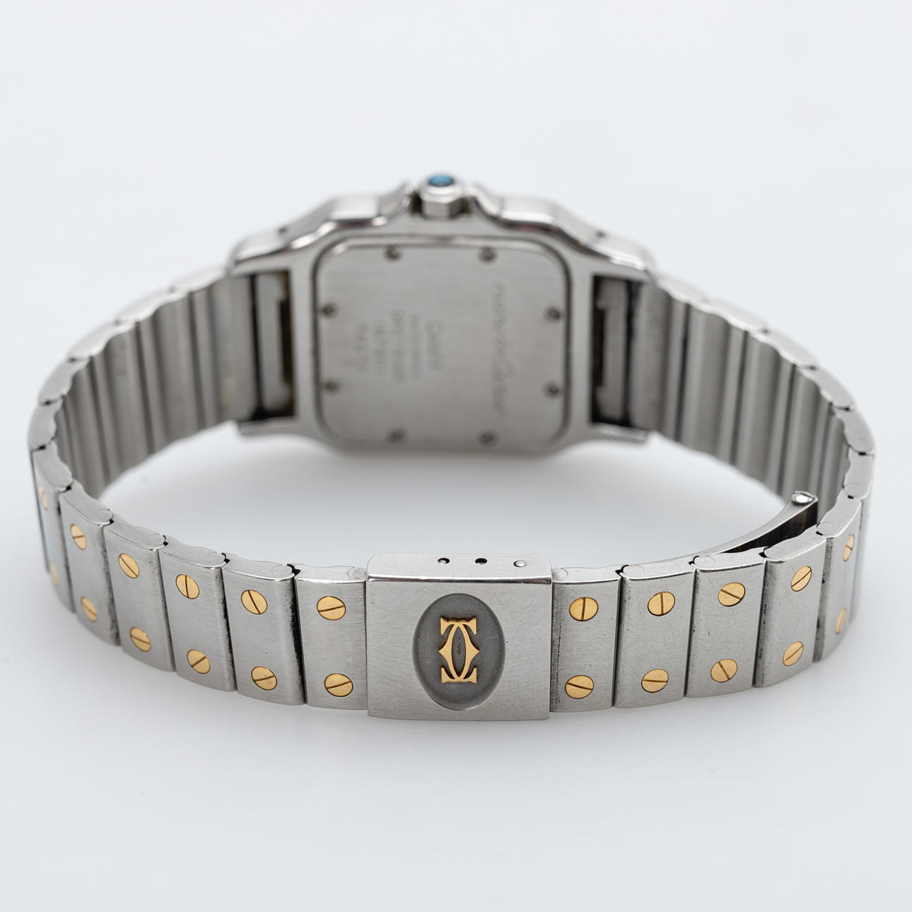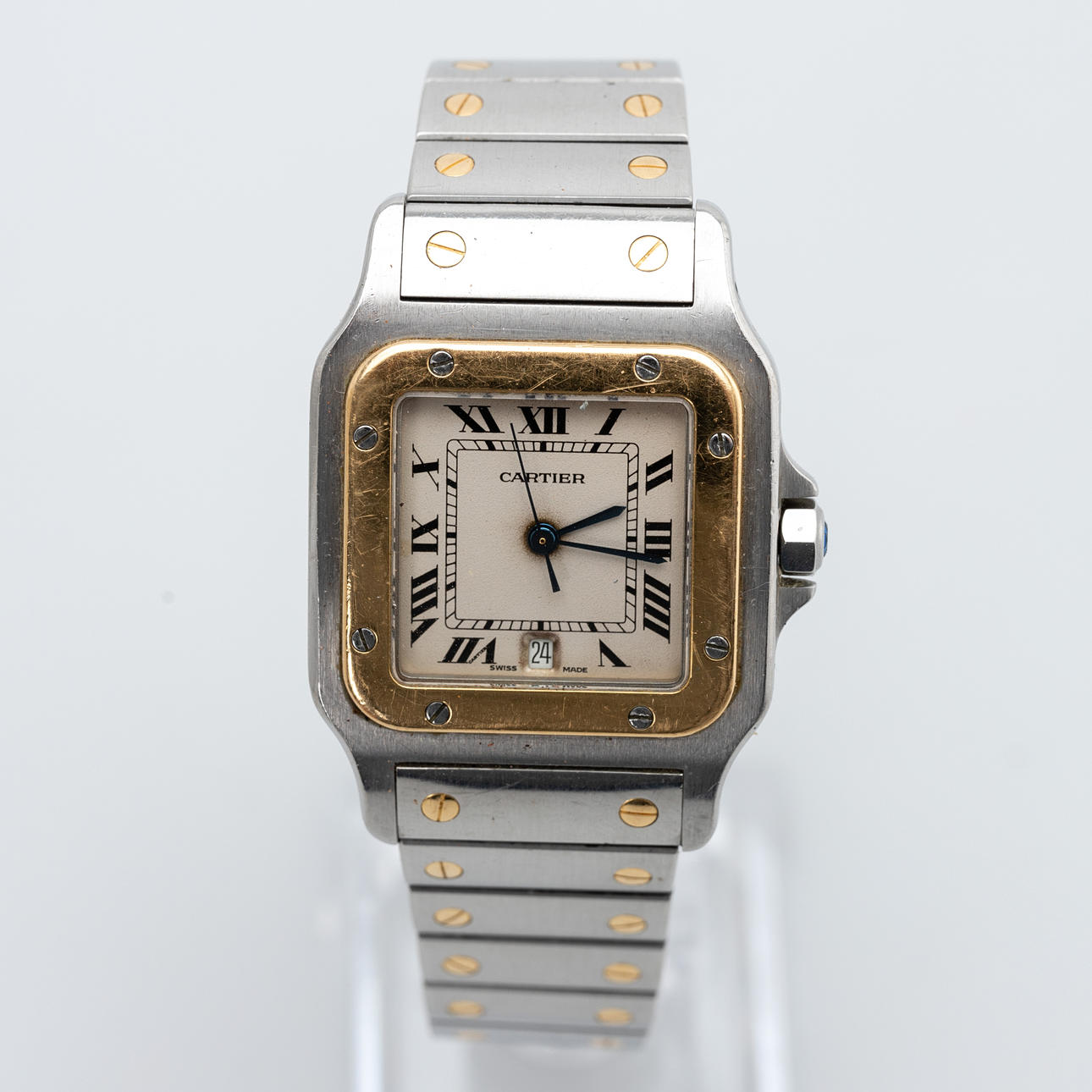 Cartier „Santos“ armbåndsur Kasse og armbånd i rustfrit stål med guldelementer, cremefarvet urskive med datovisning på '6', krone med safir, skruet bagkasse, nummereret kvartsurværk, kassens mål ca. 29 mm På tidspunktet for gennemgangen kørte uret, Auctionet.com garanterer ikke funktionalitet.