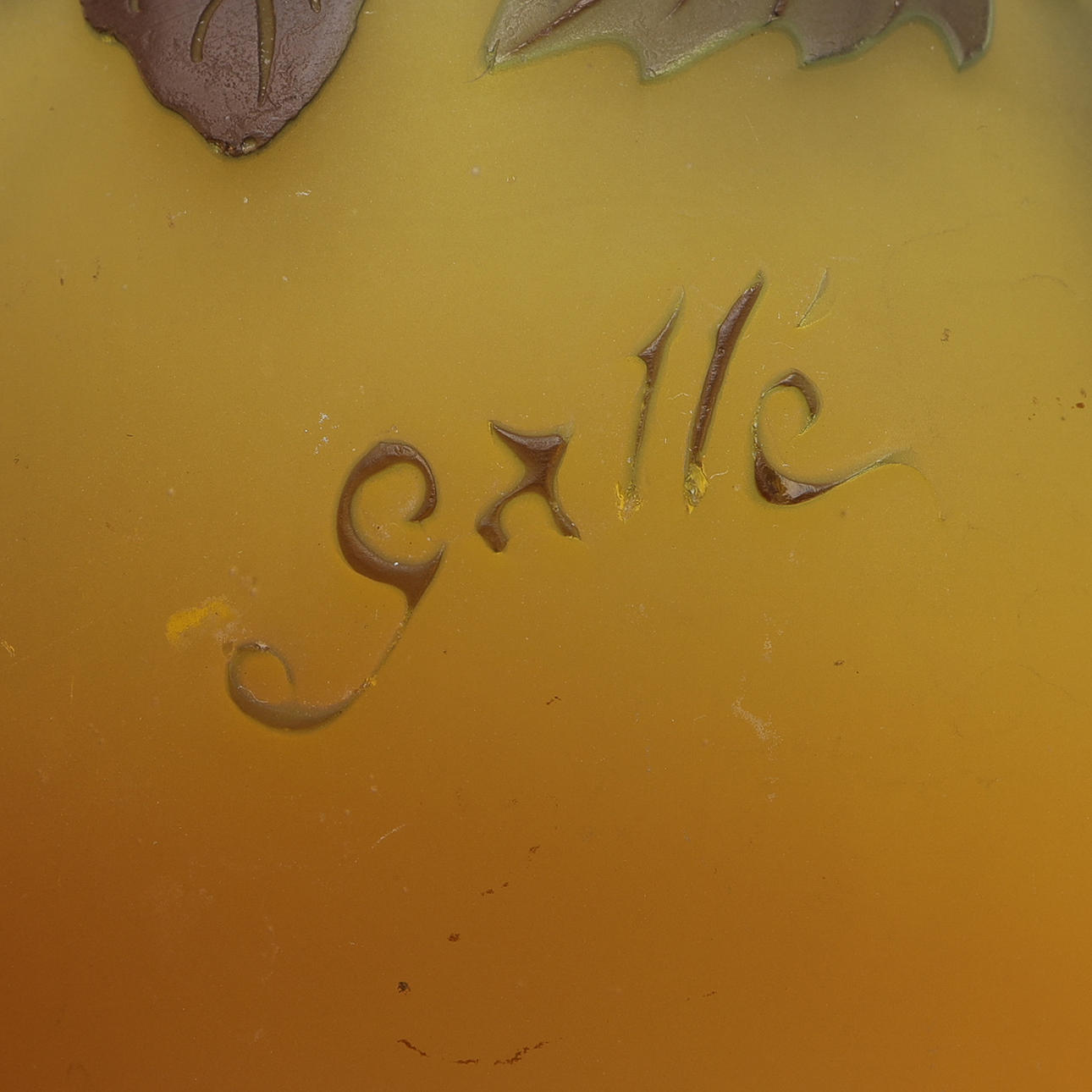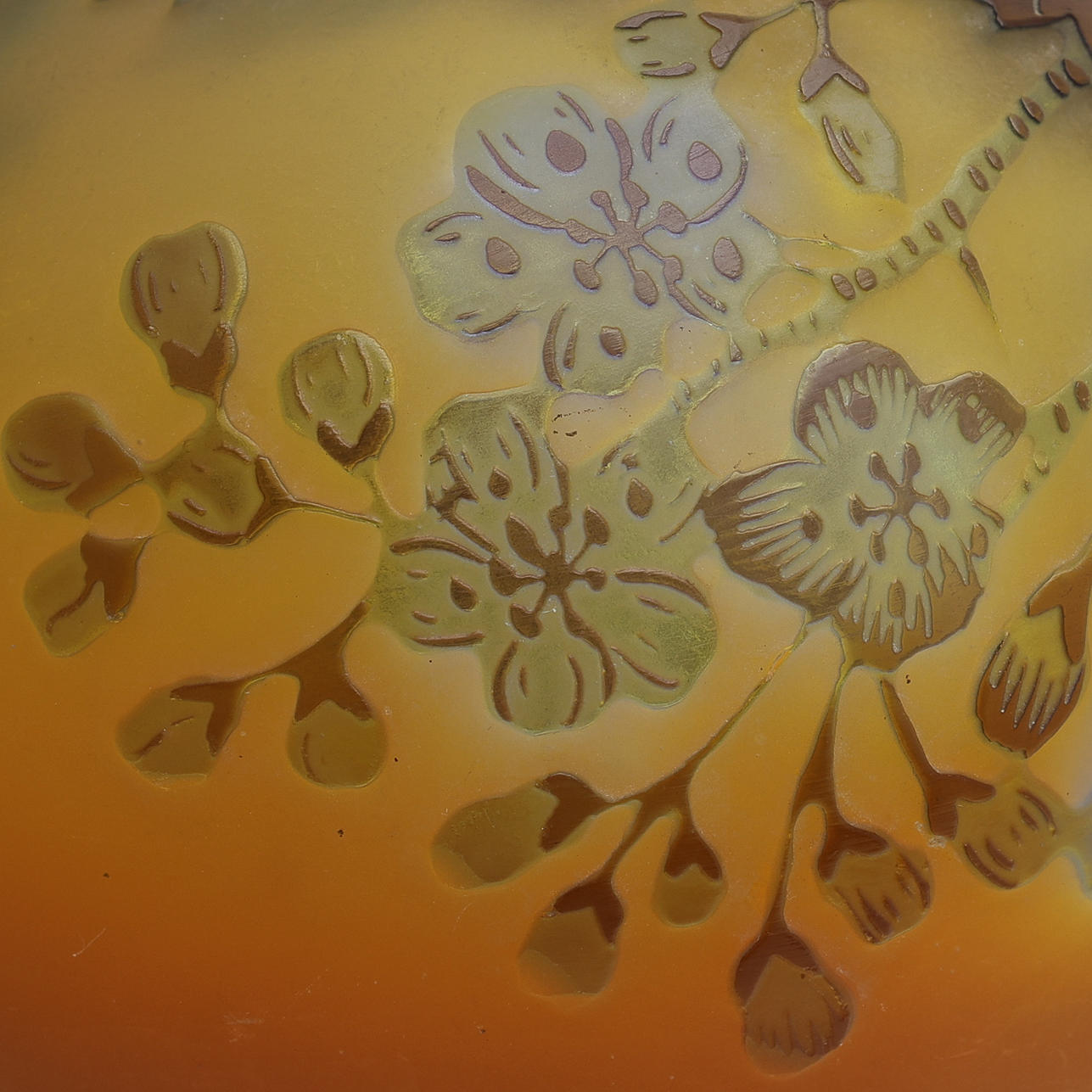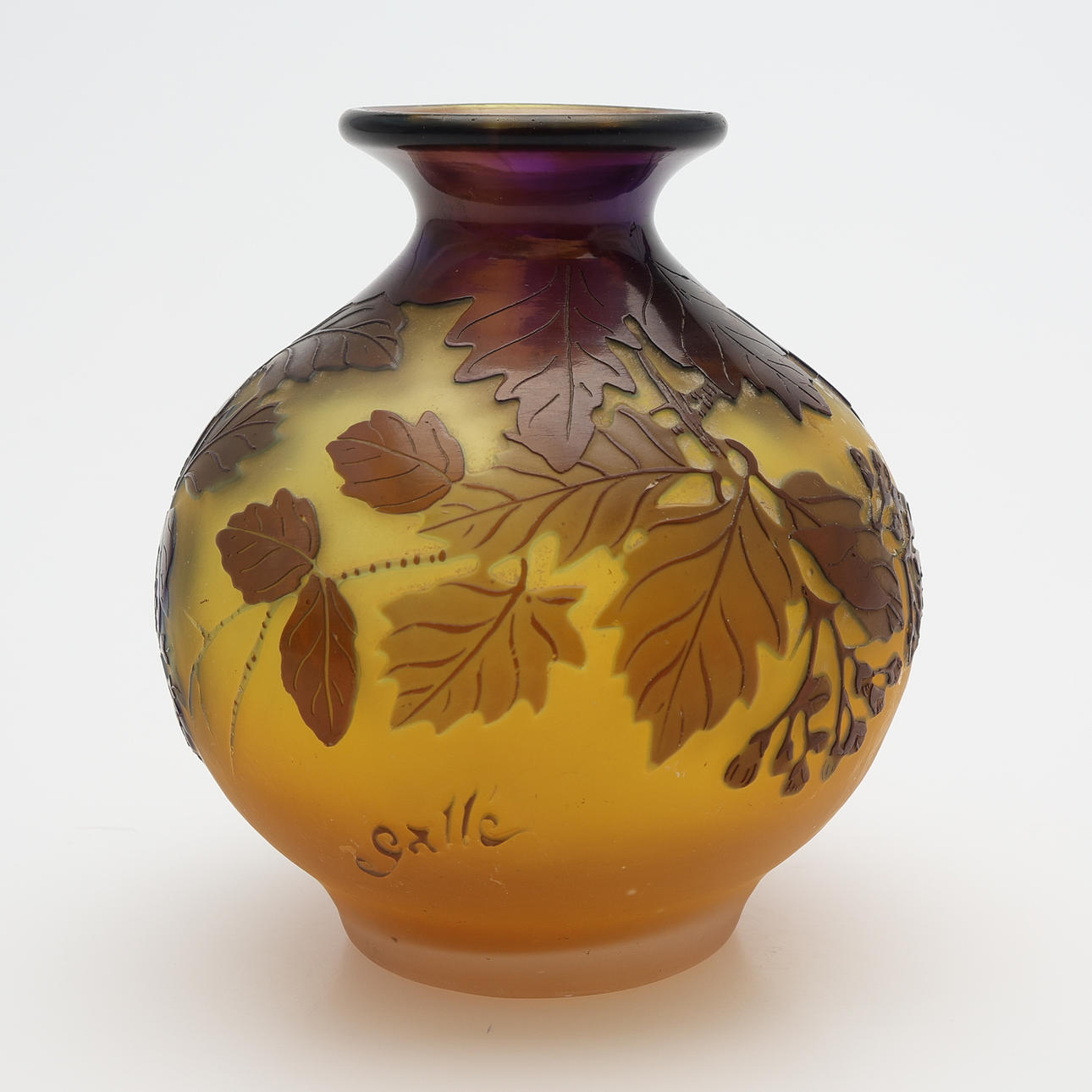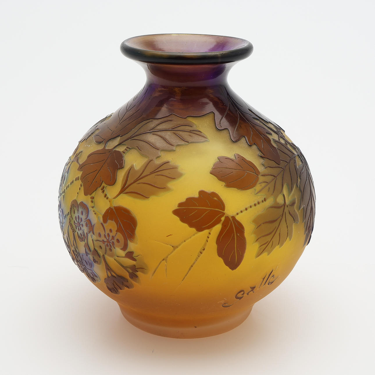 Art Nouveau, kugleformet med lille hals, overhængsglas i gult, violet og brunt med billede af æbleblomst, signeret „Gallé“, Frankrig, første halvdel af det 20. århundrede, højde 10,5 cm.