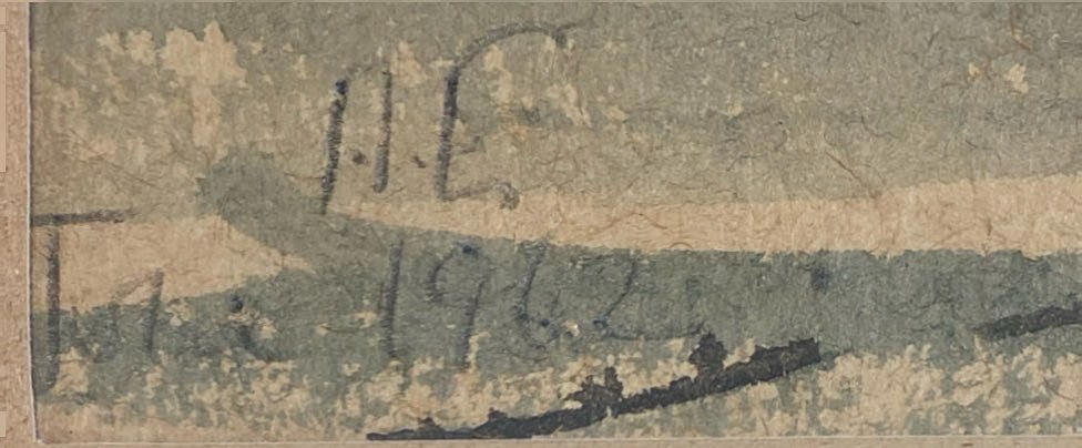 Akvarel, indrammet på papir af en landlig scene, signeret 'A E, juni 1962', rammestørrelse 73 x 55 cm.