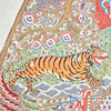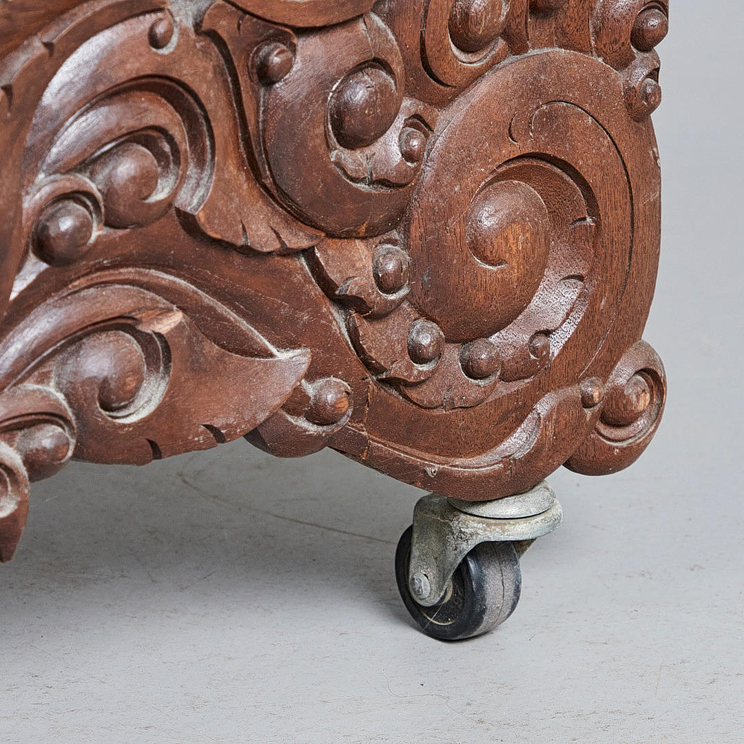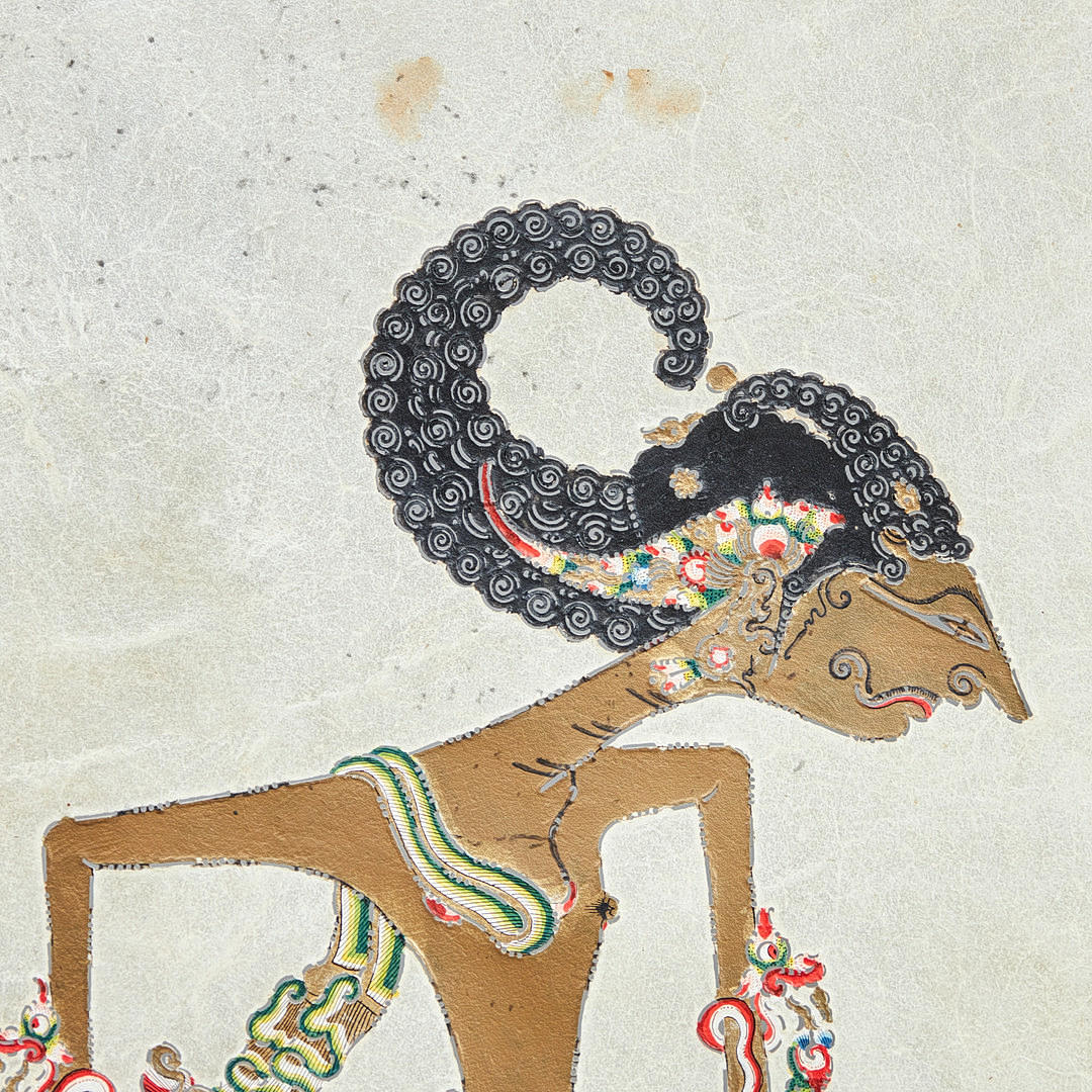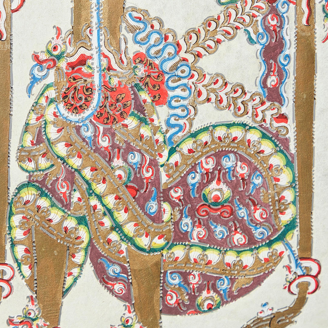Paravent bestående af tre foldevinger, hver med en glaseret træramme med asiatiske udskæringer og et centralt pergament dekoreret i stil med et papirsnit, der skildrer stiliserede asiatiske motiver, herunder figurer i traditionel dragt og dyremotiver, håndmalet med polykrome farver, ydre vinger er hver forsynet med en rulle og aftagelige, H.165-177cm, B65-220cm, T.4cm.
