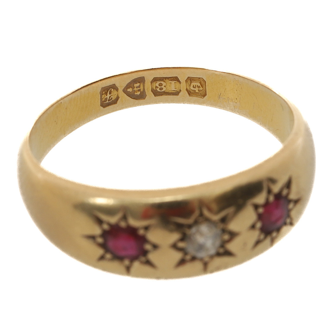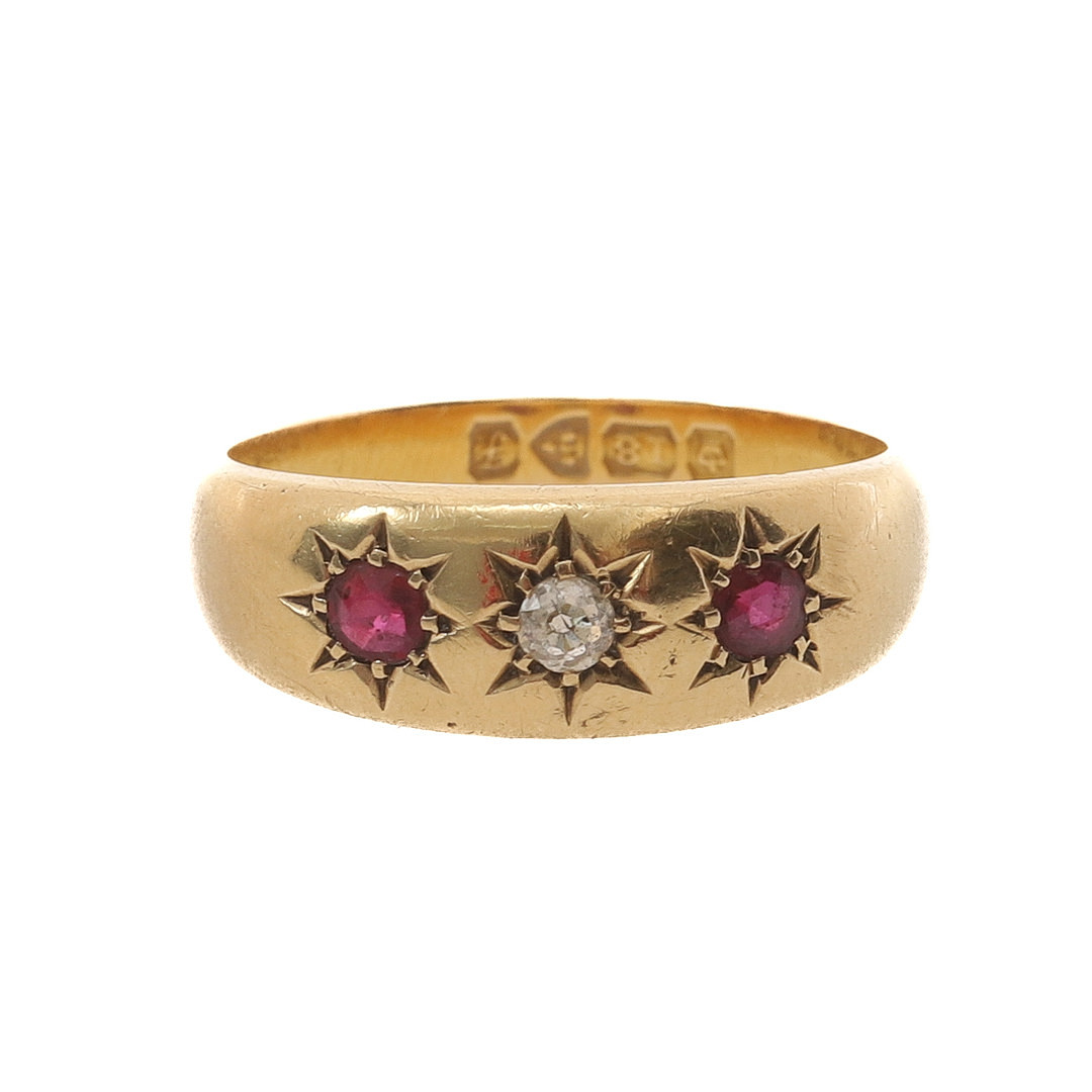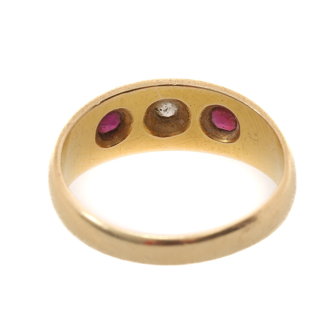 3425861. EN 18 KARAT GULD RUBIN OG DIAMANT TRE STEN RING.