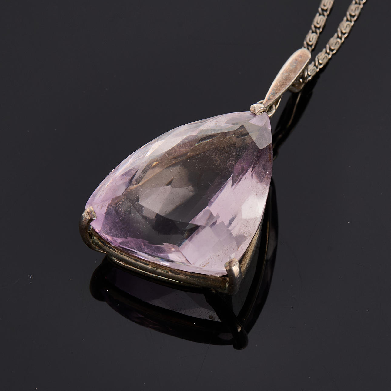 Sølv halskæde længde 52cm. Vedhæng ca 4,2 cm, ametyst ca. 2,8x 2,2x 3,3 mm.
