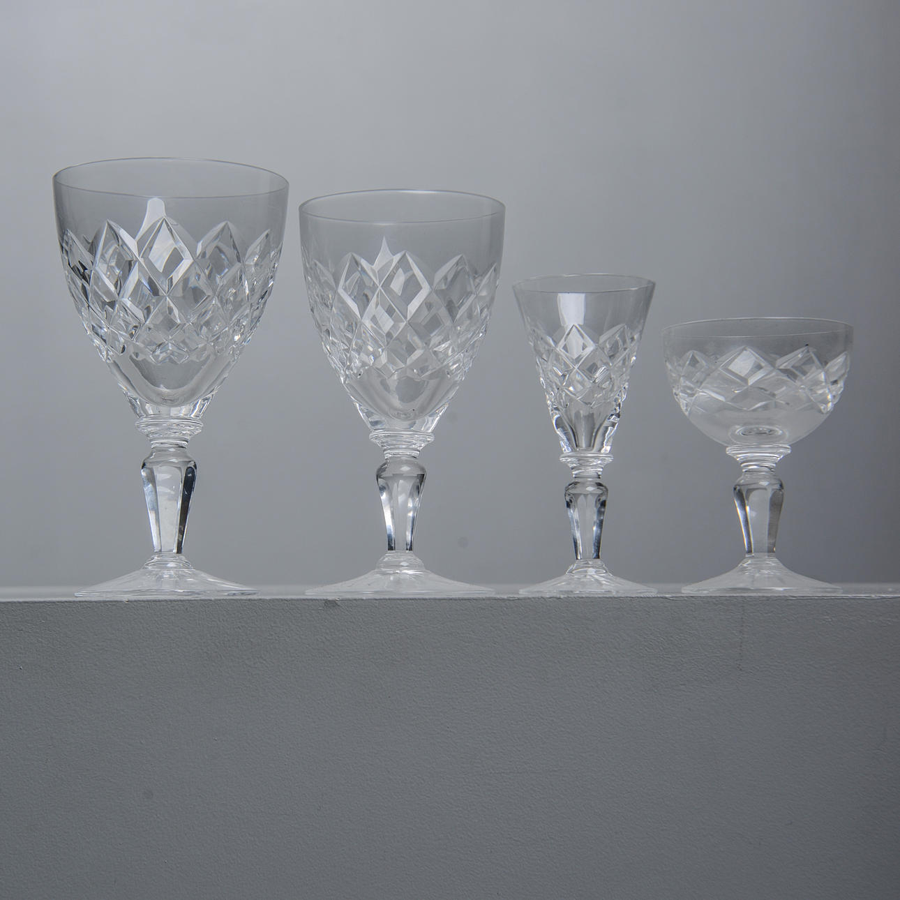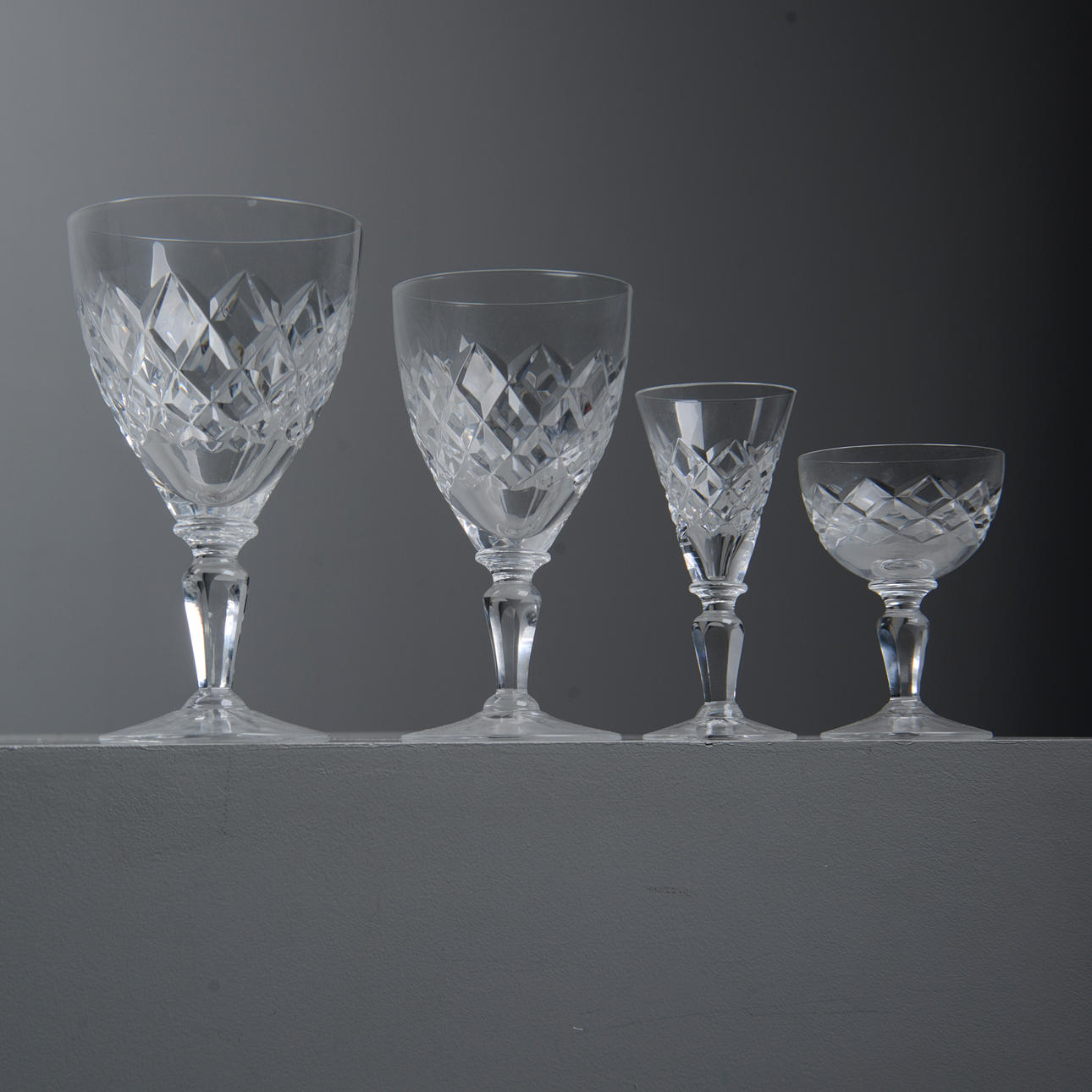 Krystalglas med udskåret indretning. 10 rødvinsglas, 11 hvidvinsglas, 9 snapsglas, 11 likørglas.