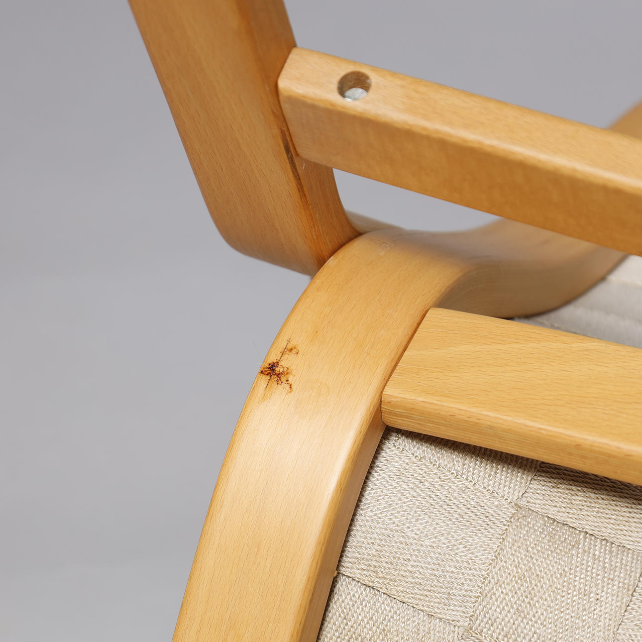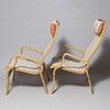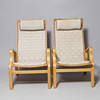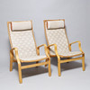 Et par højryggede hvilestole med stel af lamineret bøgetræ model Albert, monteret med flettede gjorde. Fremstillede hos Kvist Møbler. H. 96 cm. Sh. 40 cm. B. 62 cm. (2).