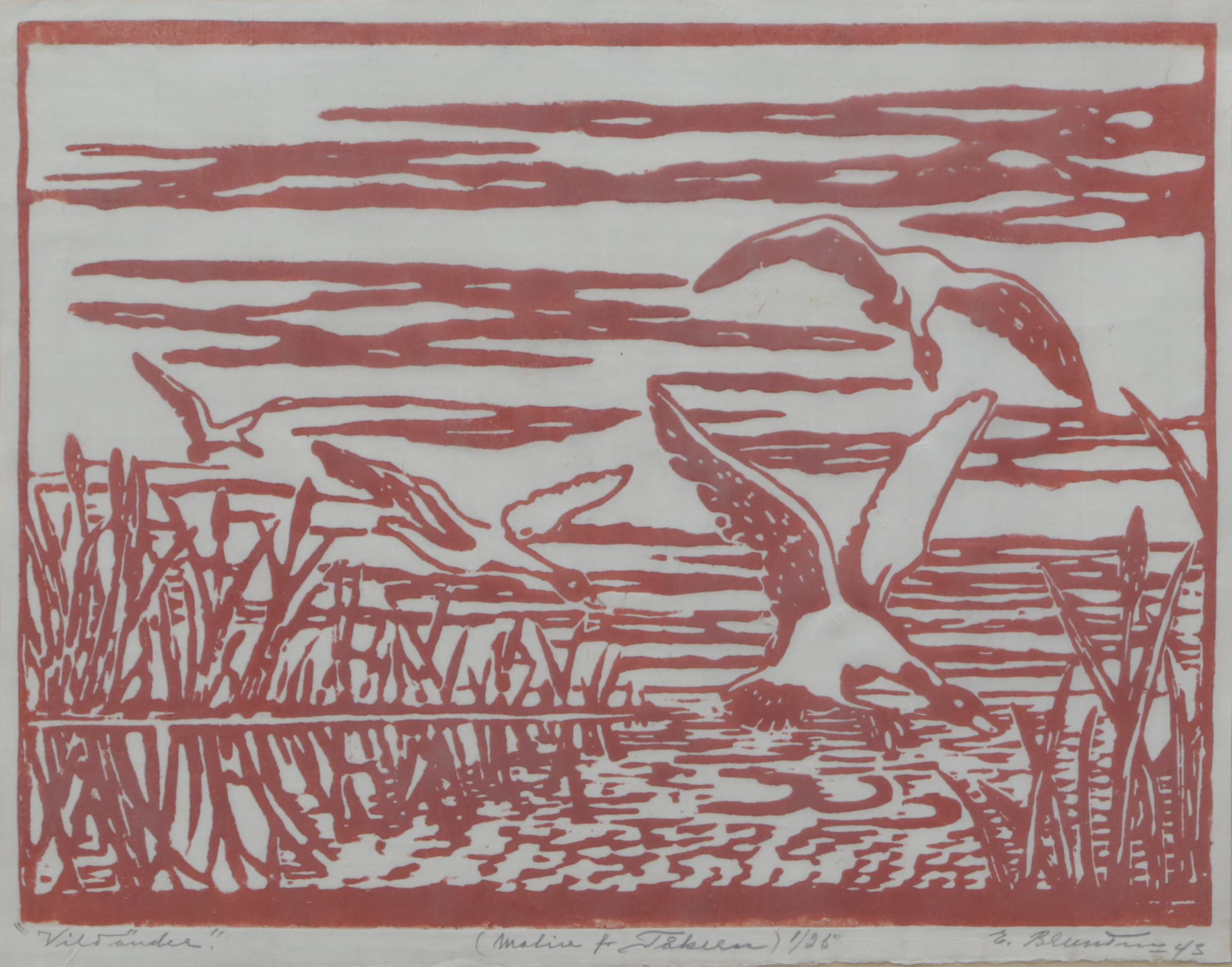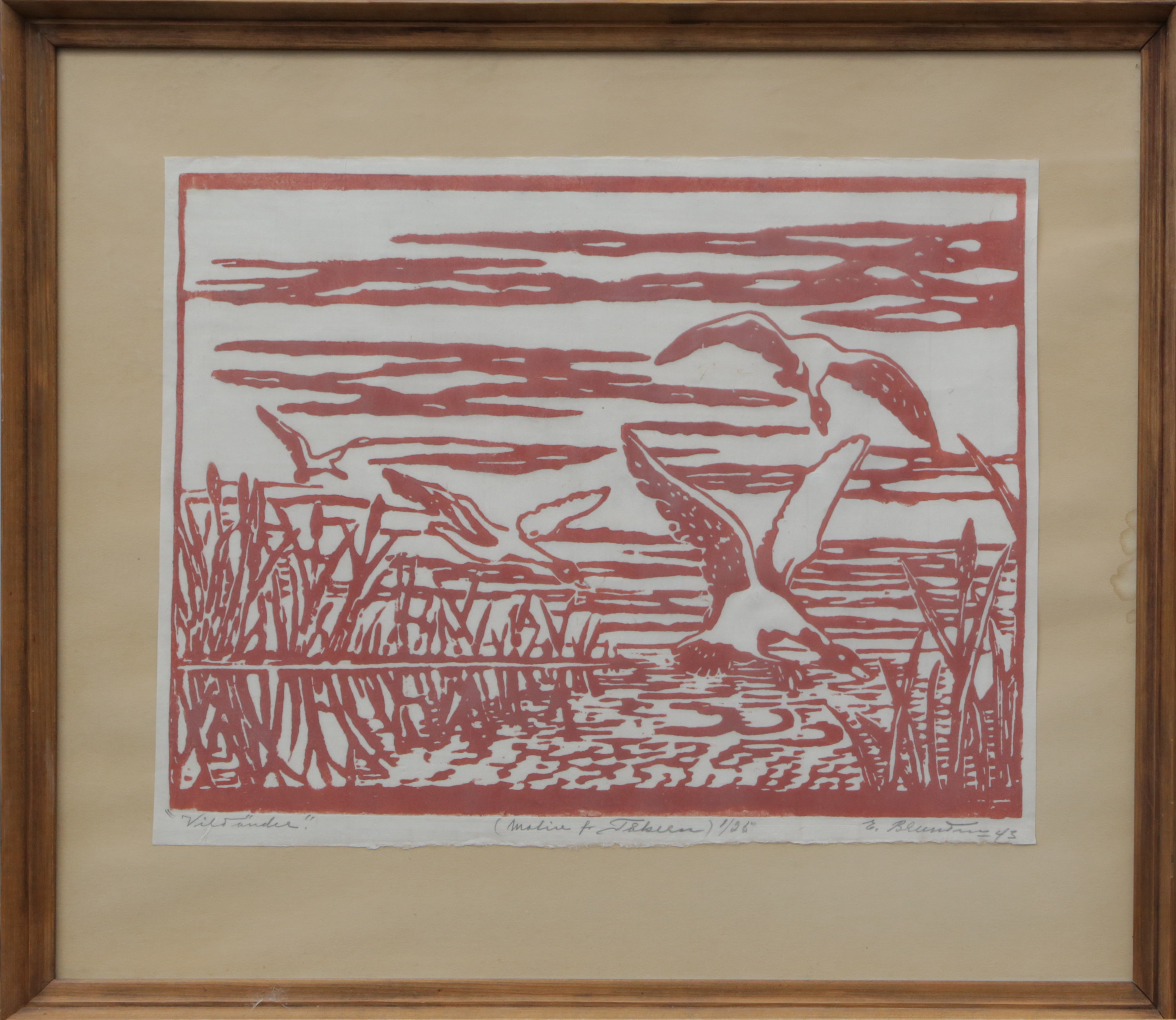 3454692. OIDENTIFIERAD KONSTNÄR. TRÆSNIT, Vilde ænder, signeret, 1943.