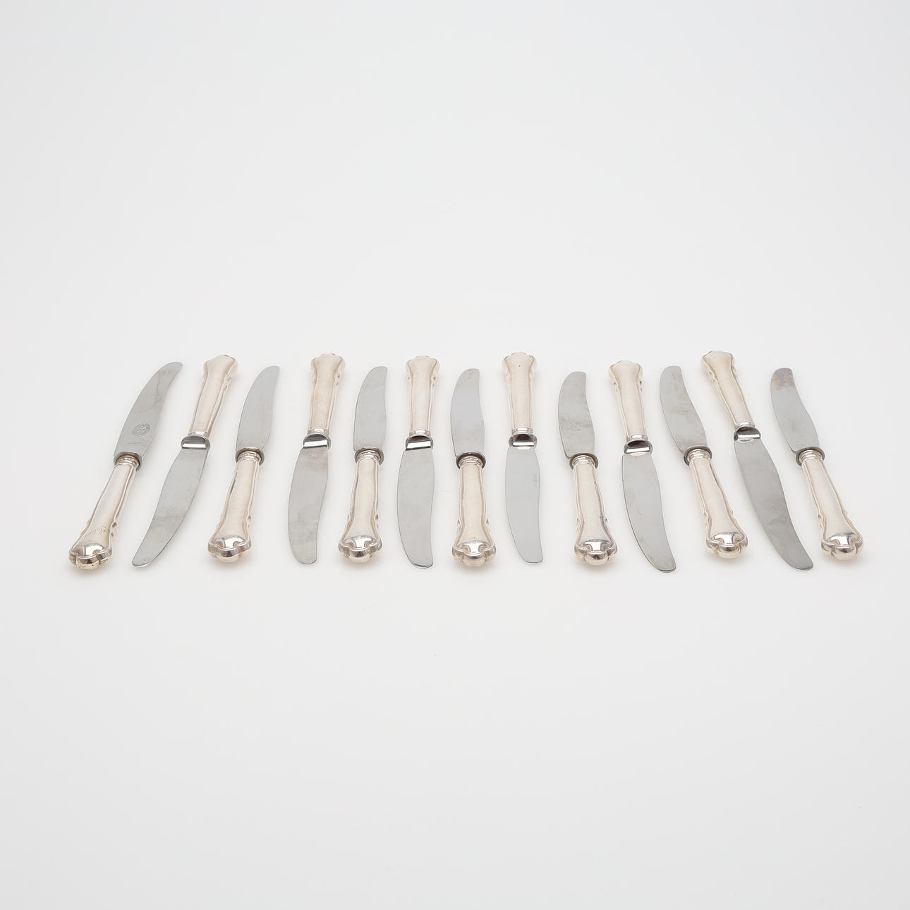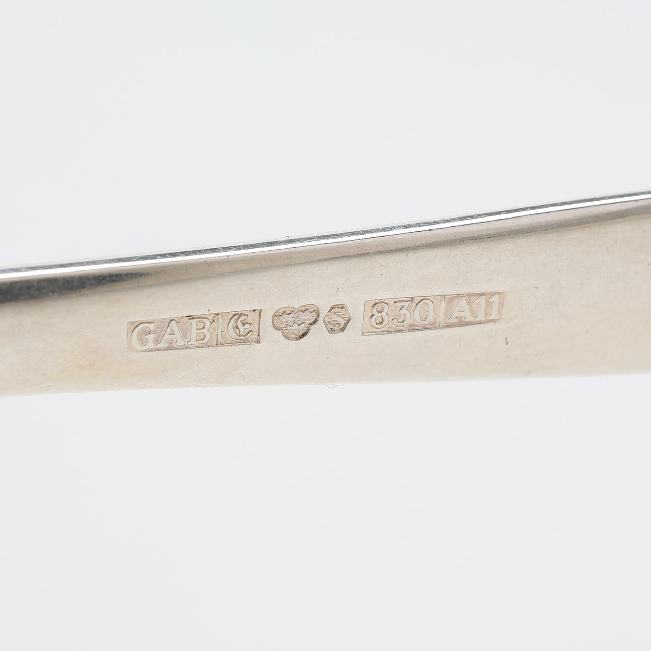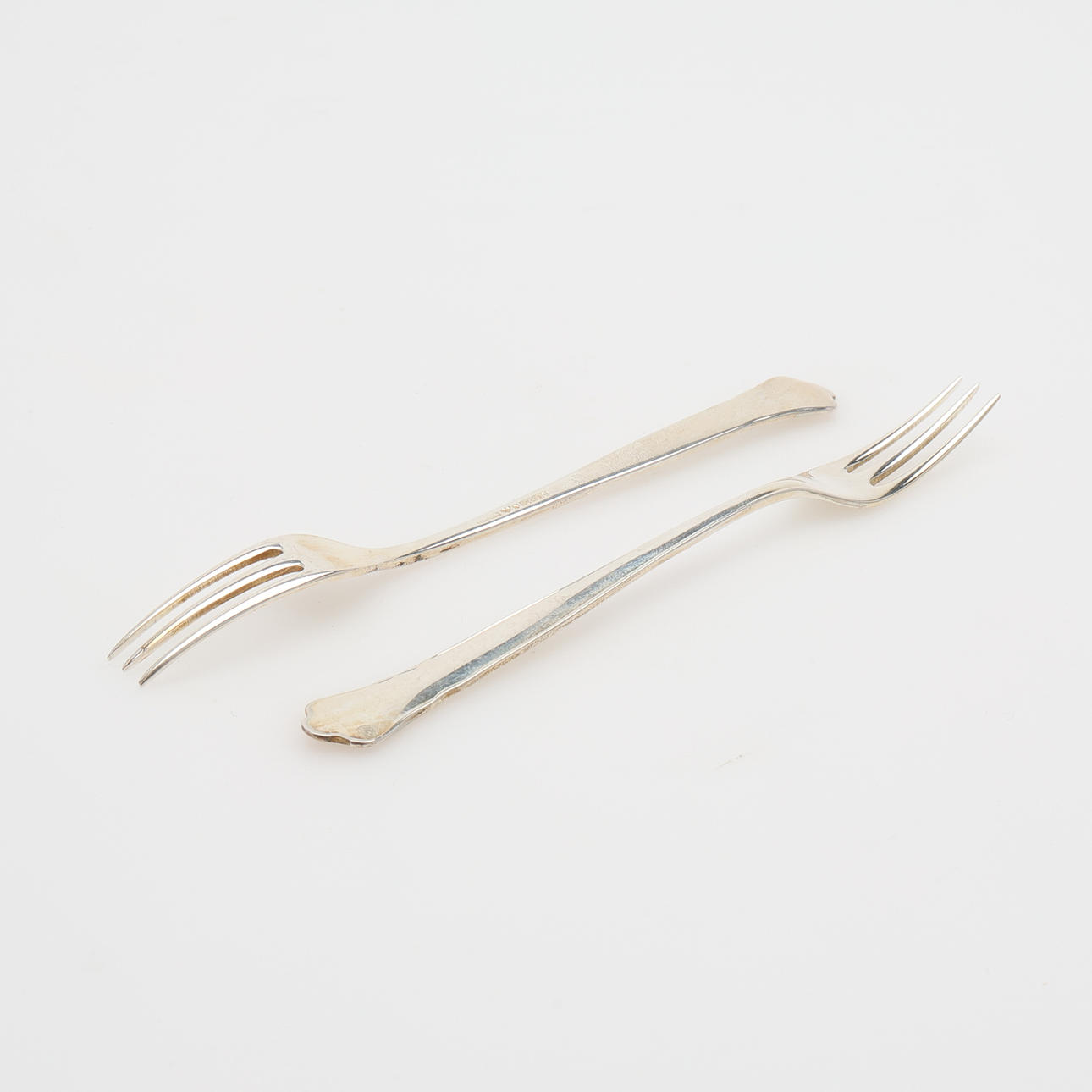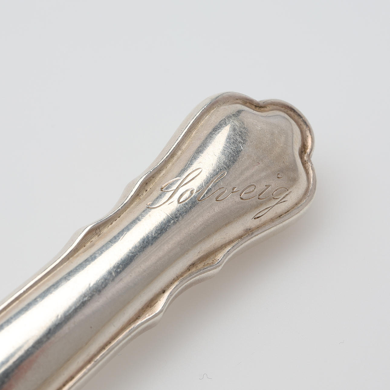 Sølv, Gullsmedsaktiebolaget: 13 bordgafler, længde 17,8 cm; 12 spiseskefulde, længde 18,3 cm: 13 bordknive med stålklinger, længde 20,2 cm; 12 fiskeknive; 12 sandwichgafler; 12 sandwichknive; 12 dessertskeer; 6 smørknive med stålblade; 11 kaffeskeer; 12 ruskindskeer og 2 syltegafler. Vægt ekskl. knive med stålklinger 2388 gram.