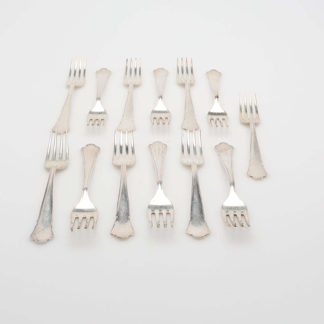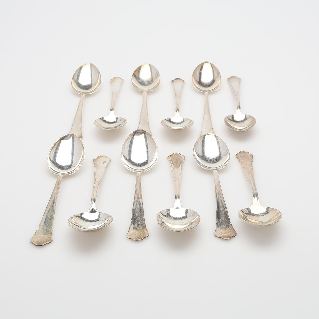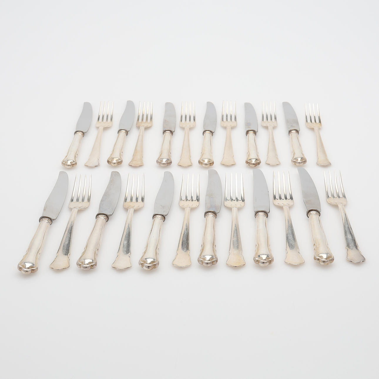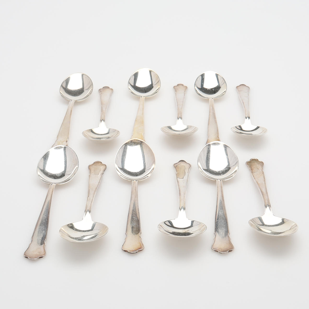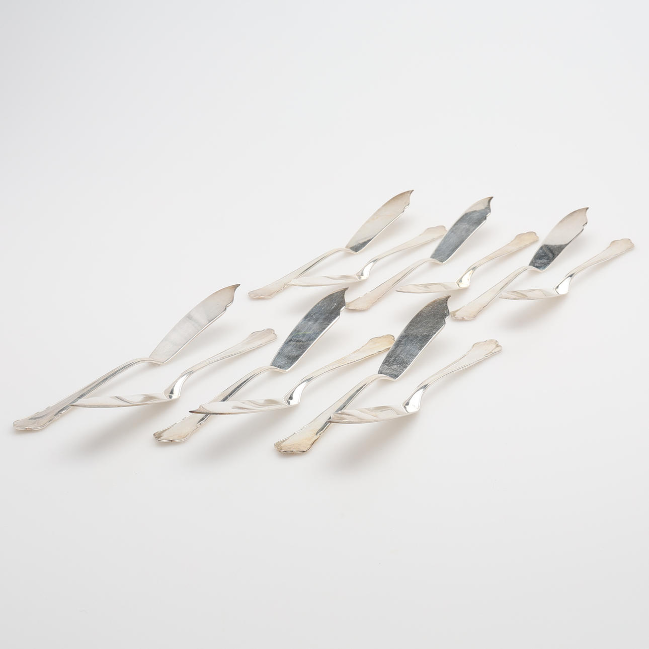 Sølv, Gullsmedsaktiebolaget: 13 bordgafler, længde 17,8 cm; 12 spiseskefulde, længde 18,3 cm: 13 bordknive med stålklinger, længde 20,2 cm; 12 fiskeknive; 12 sandwichgafler; 12 sandwichknive; 12 dessertskeer; 6 smørknive med stålblade; 11 kaffeskeer; 12 ruskindskeer og 2 syltegafler. Vægt ekskl. knive med stålklinger 2388 gram.