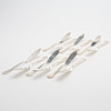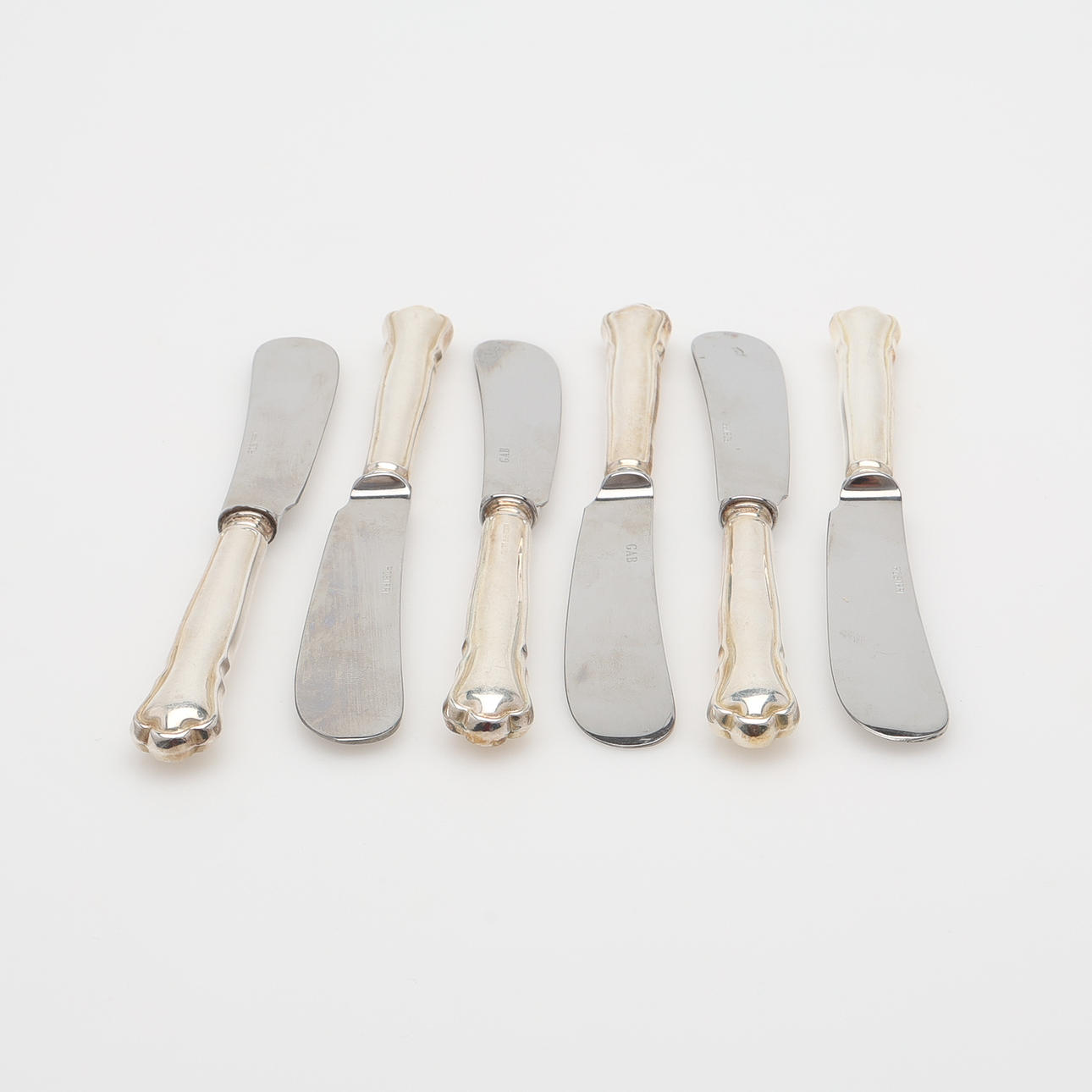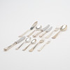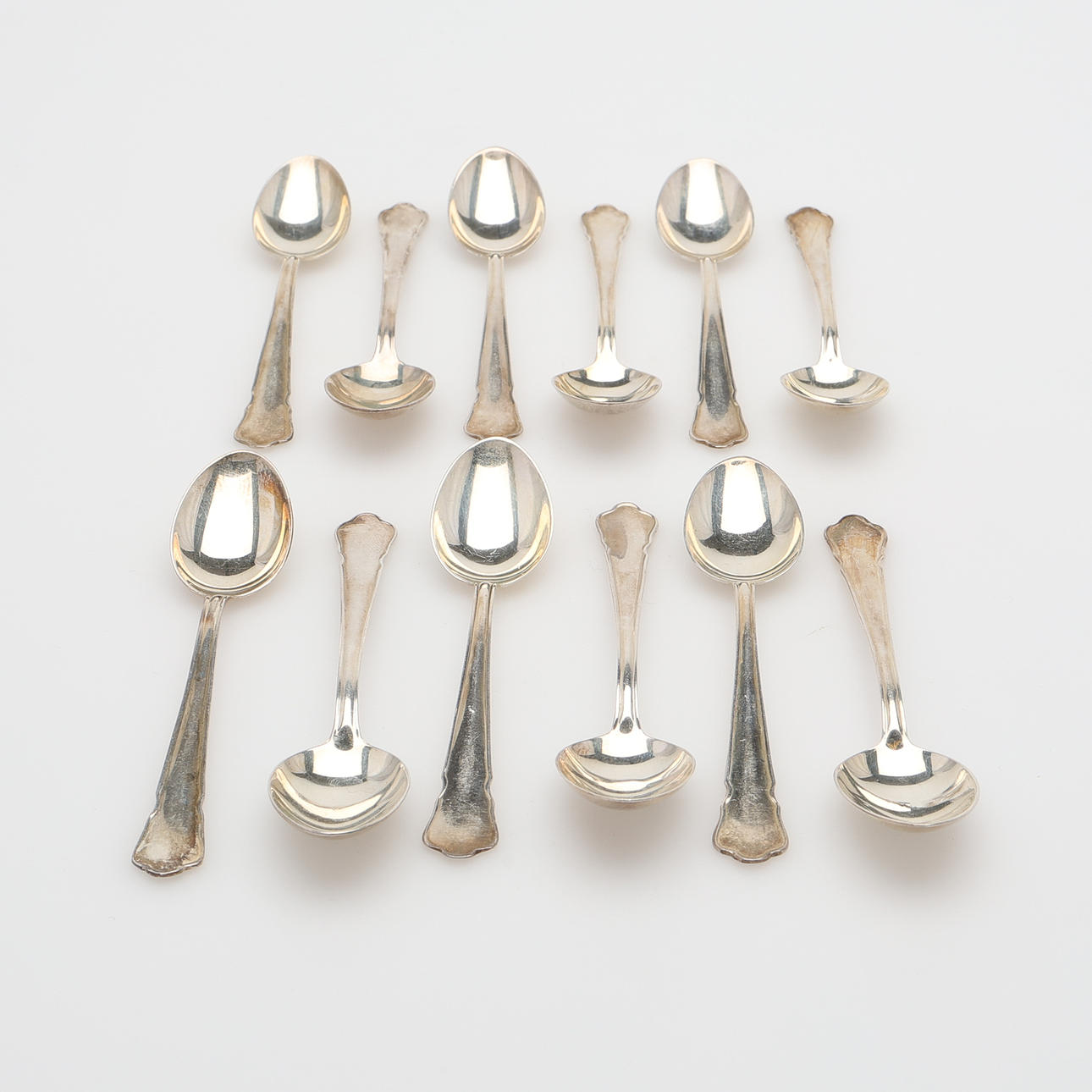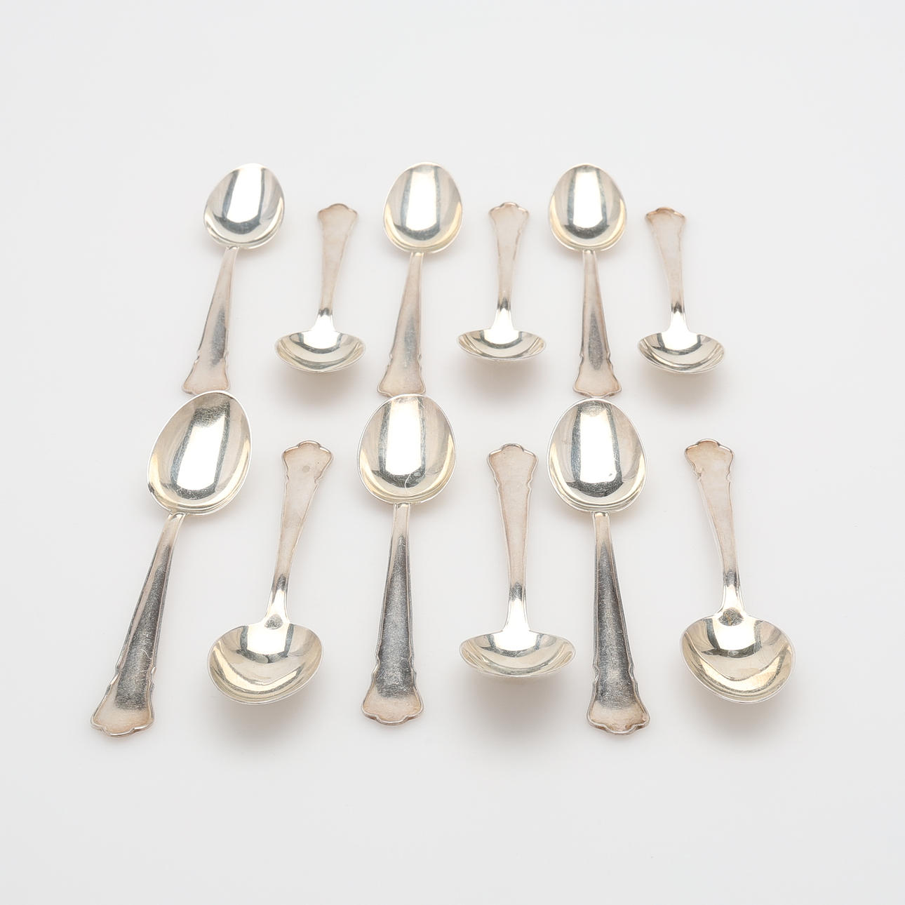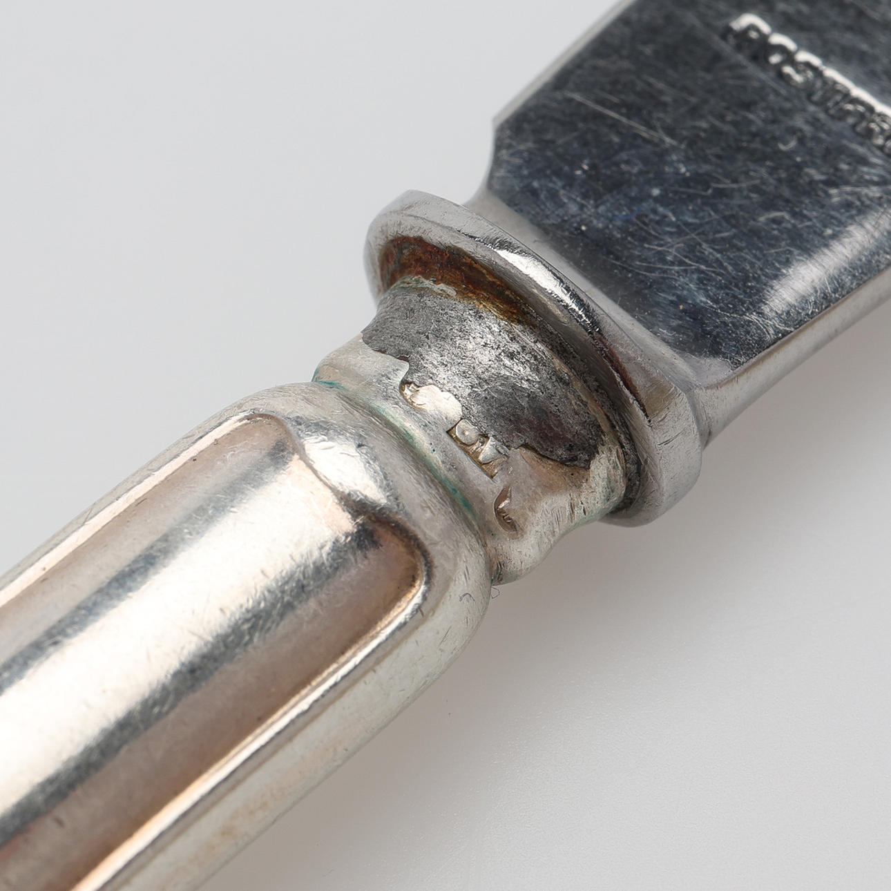 Sølv, Gullsmedsaktiebolaget: 13 bordgafler, længde 17,8 cm; 12 spiseskefulde, længde 18,3 cm: 13 bordknive med stålklinger, længde 20,2 cm; 12 fiskeknive; 12 sandwichgafler; 12 sandwichknive; 12 dessertskeer; 6 smørknive med stålblade; 11 kaffeskeer; 12 ruskindskeer og 2 syltegafler. Vægt ekskl. knive med stålklinger 2388 gram.