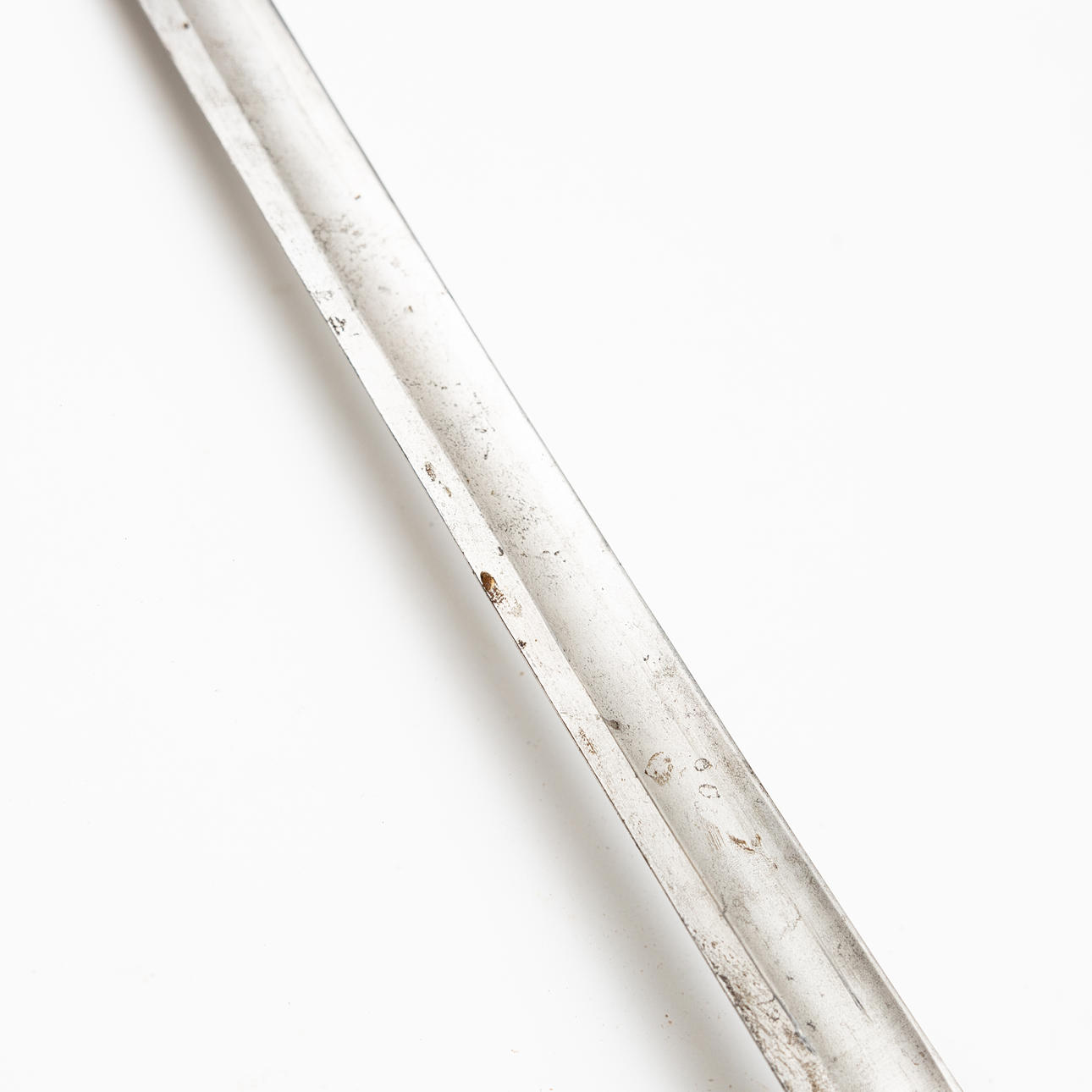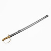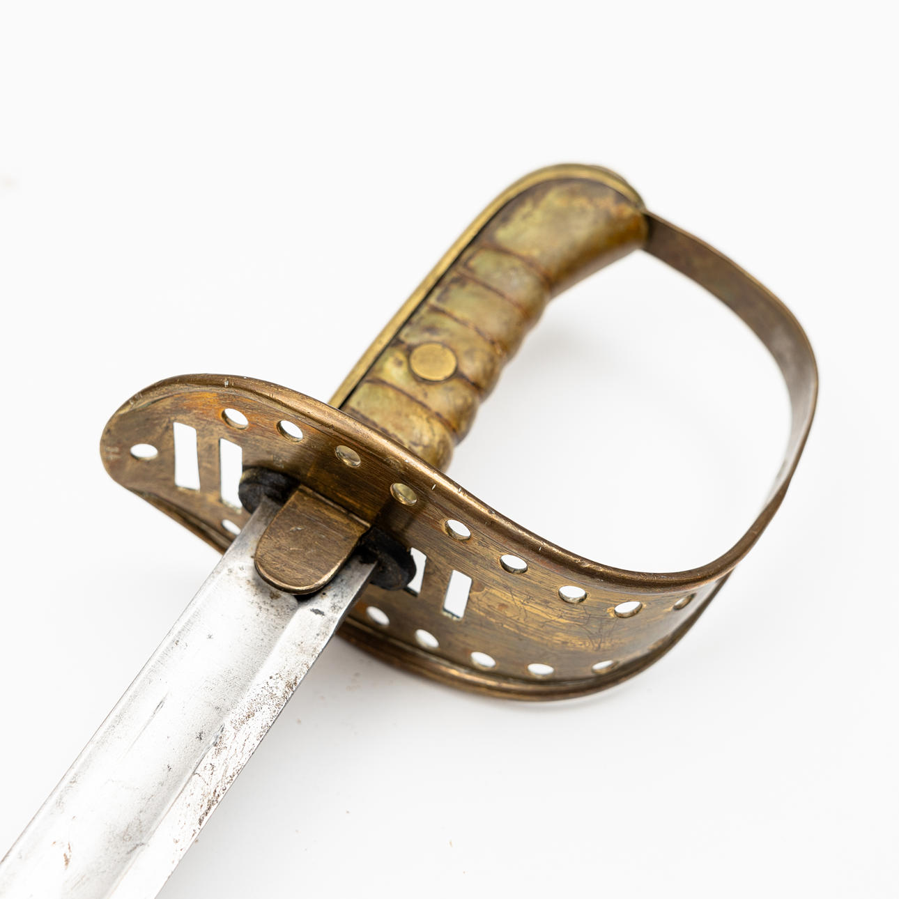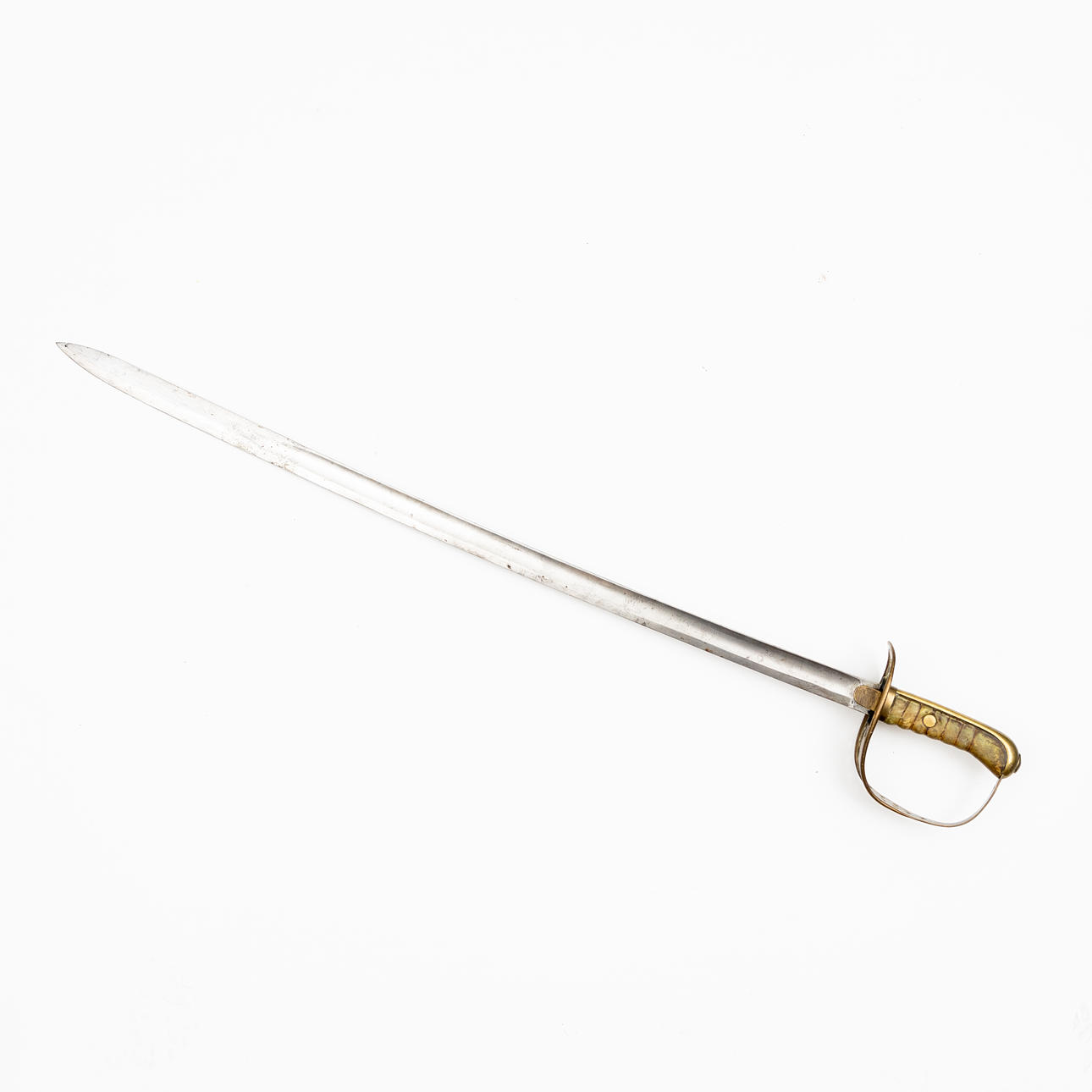 Messingbeslag med læderindpakket kagerulle og parerplade, enkeltkantet blad med skålslibning og flad ryg, længde 90,5, total længde 106 cm.
