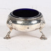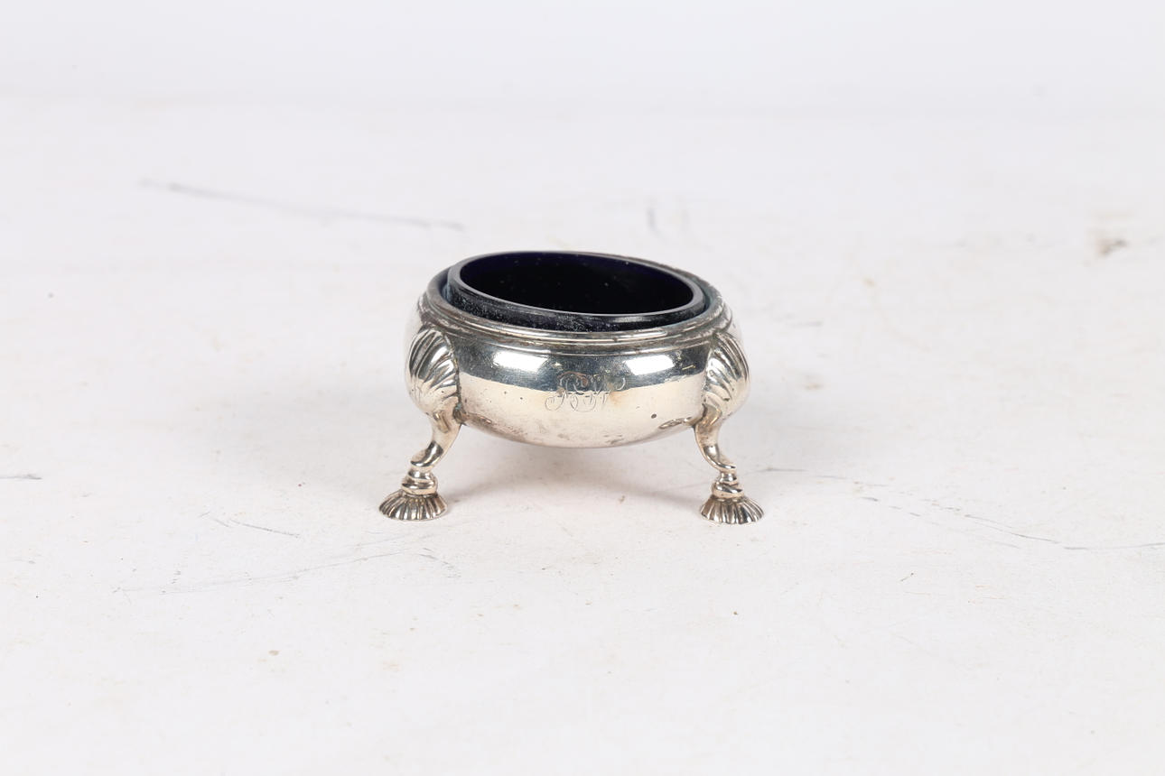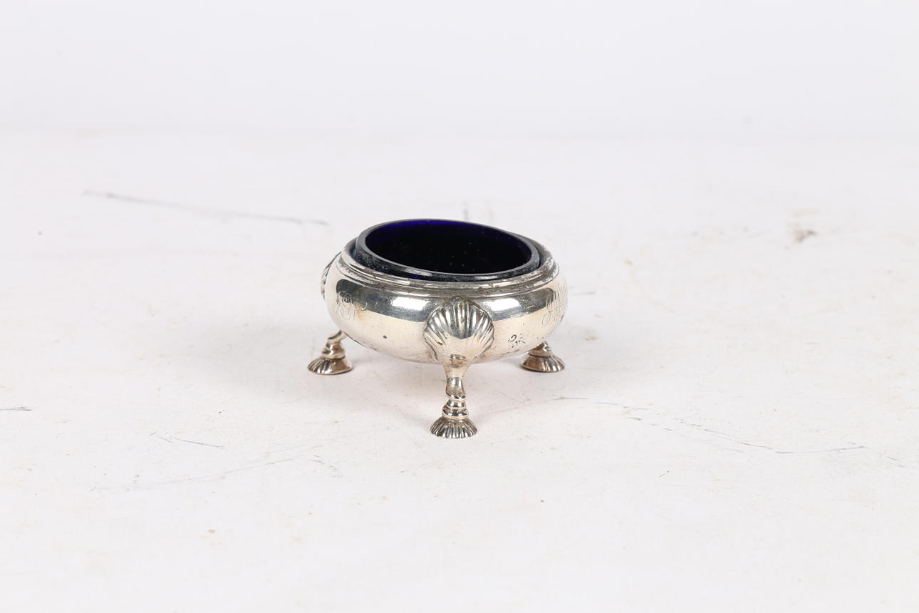 London 1853, producent Thomas Hughes Headland, af kedleform med monogram på den ene side og blå glasforing, hævet på tre skalstøbte trinfødder, 8 cm diameter, 3,8 oz ekskl. foring.