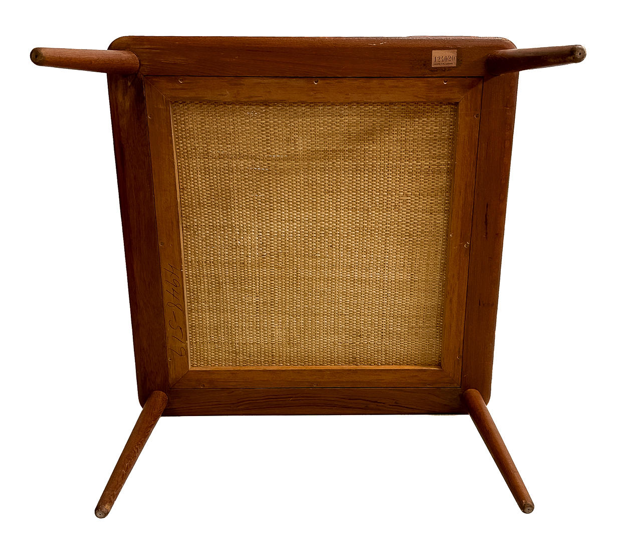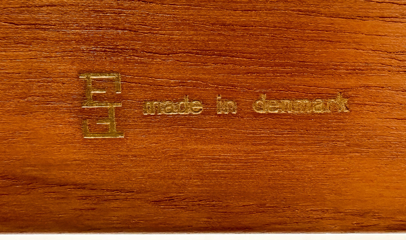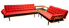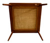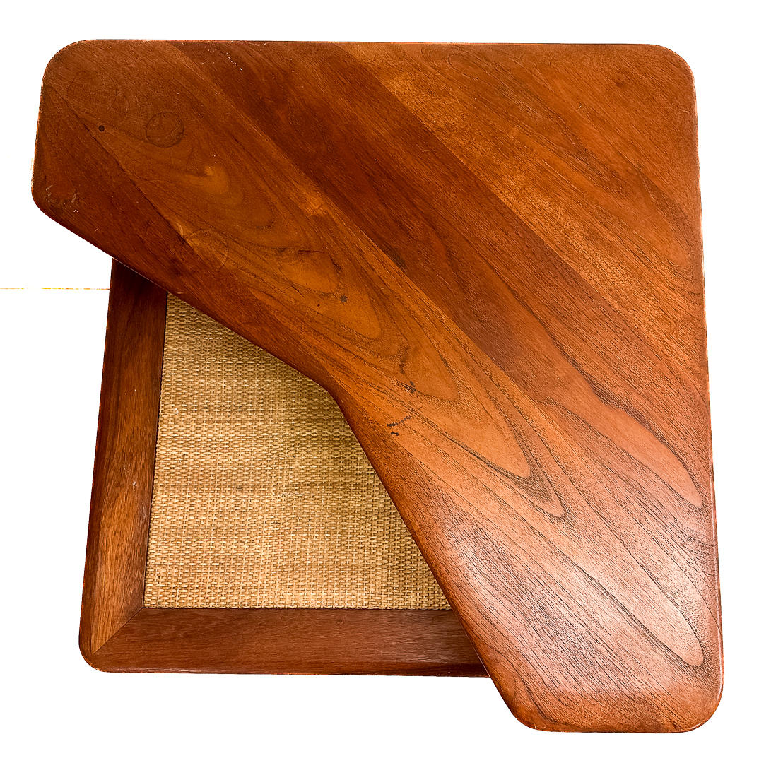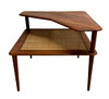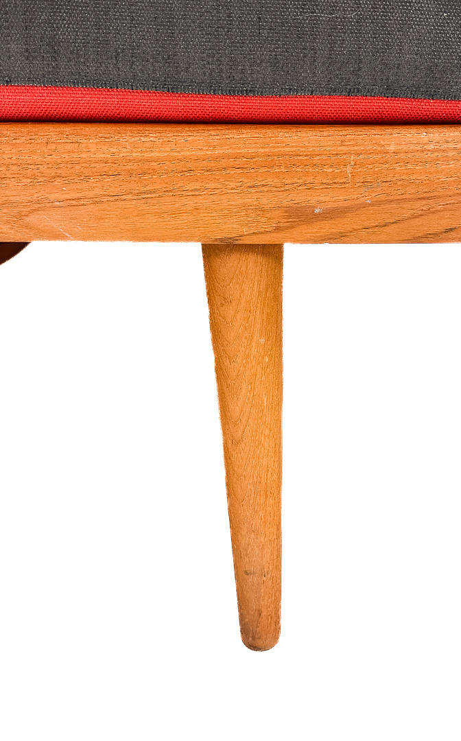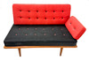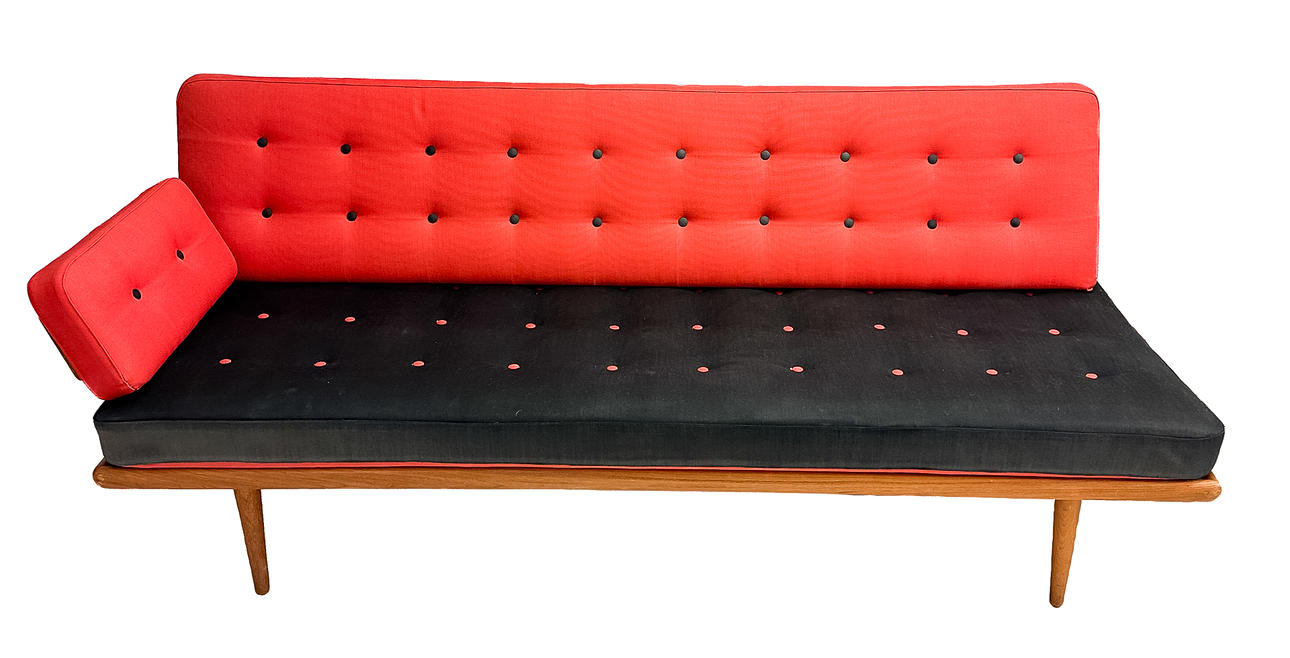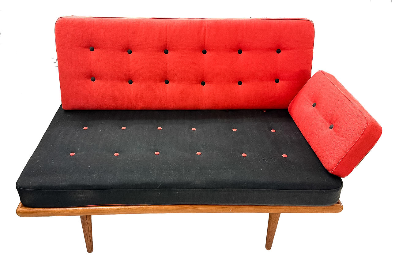 Sofagruppe med 2 sofa/dagsenge og et hjørnebord i teak. 3-personers sofa 190 x 76 cm, 2-personers sofa 120 x 76 cm. Bord med underliggende plade i rotting, 74 x 74 x 65 cm. Alle dele mærket.