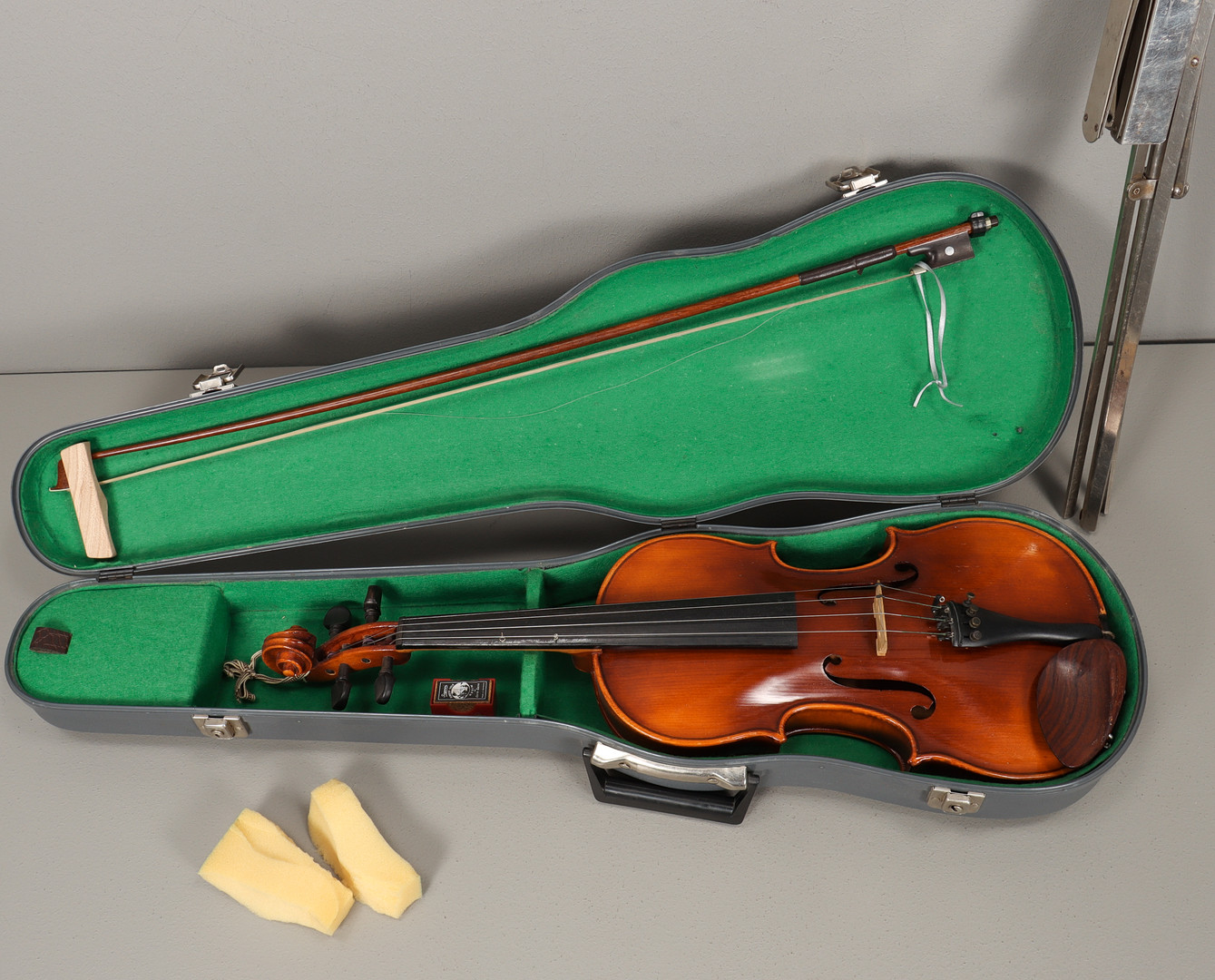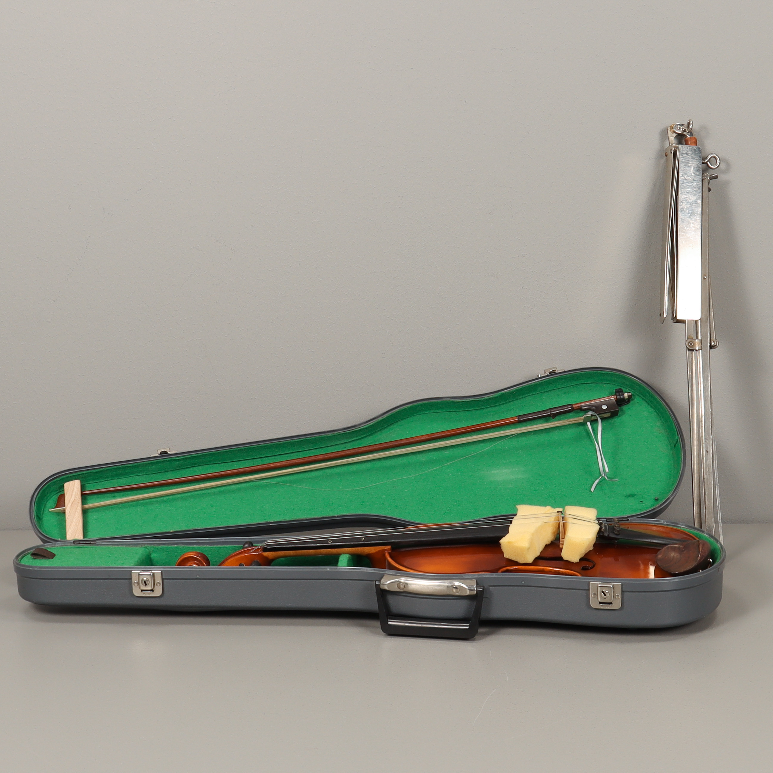 3476595. Violin med stryger og musikstativ.