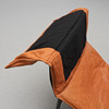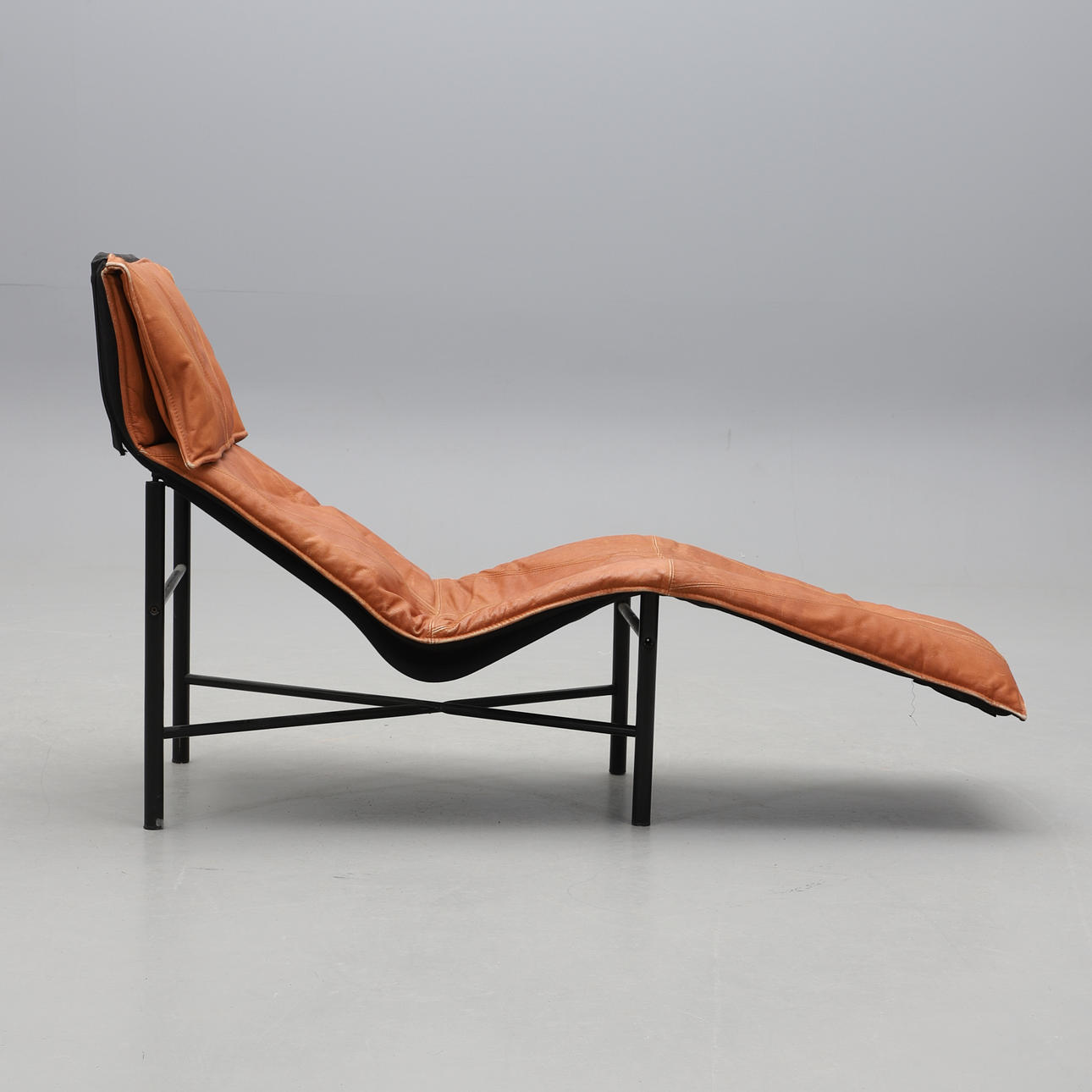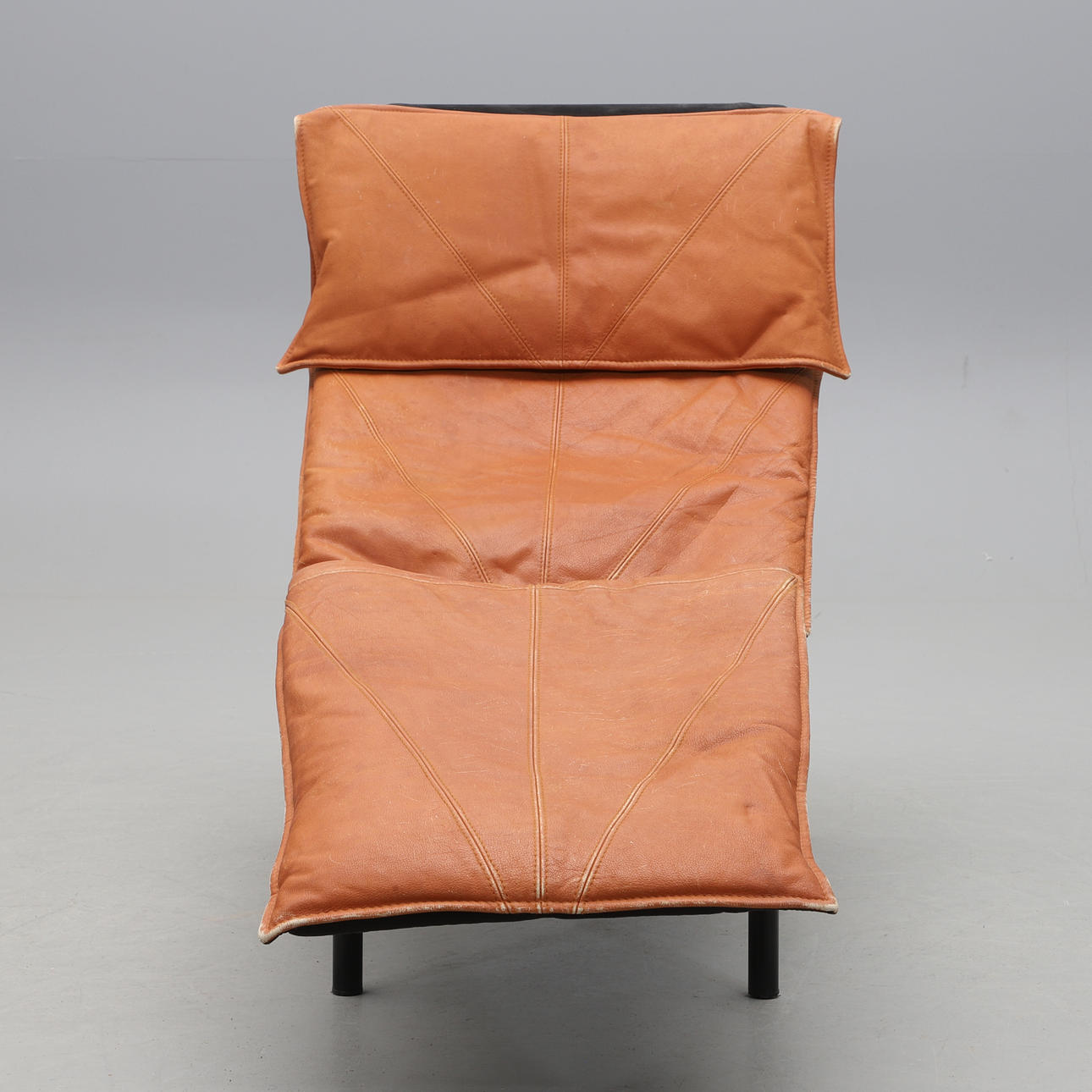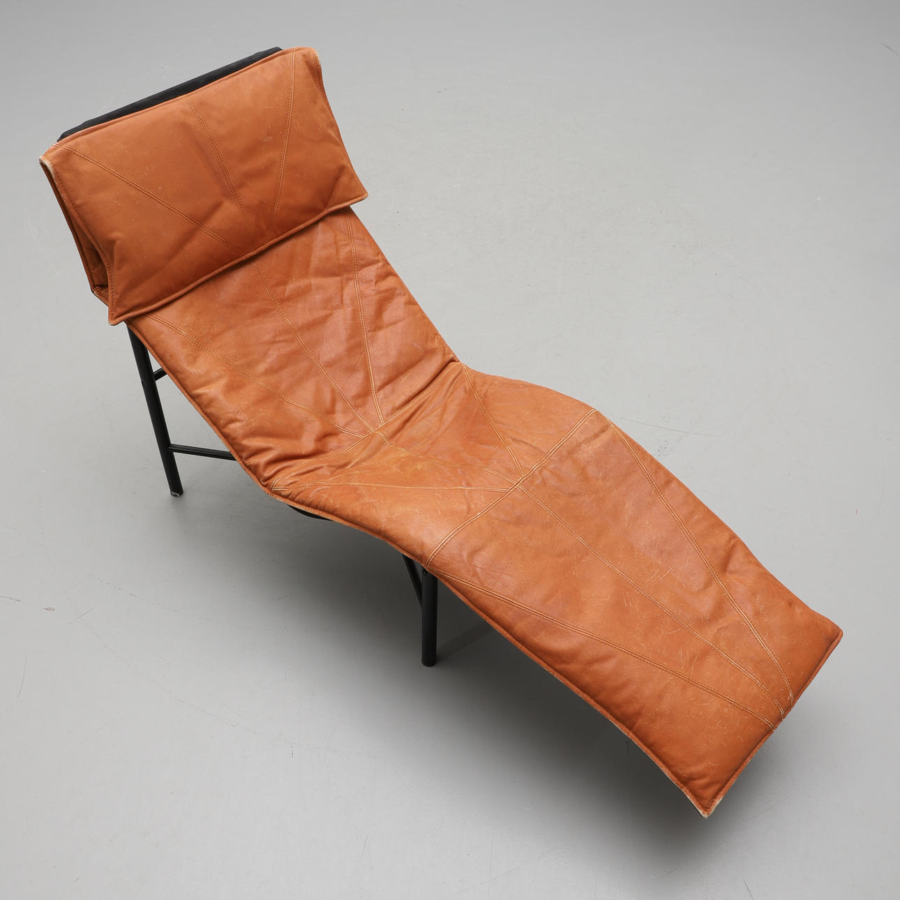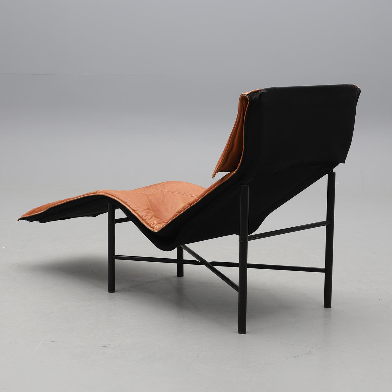 Drejeligt polstret sæde, betrukket i lysebrunt læder. Sort lakeret metalramme. Længde ca 156 cm, bredde ca. 70 cm.