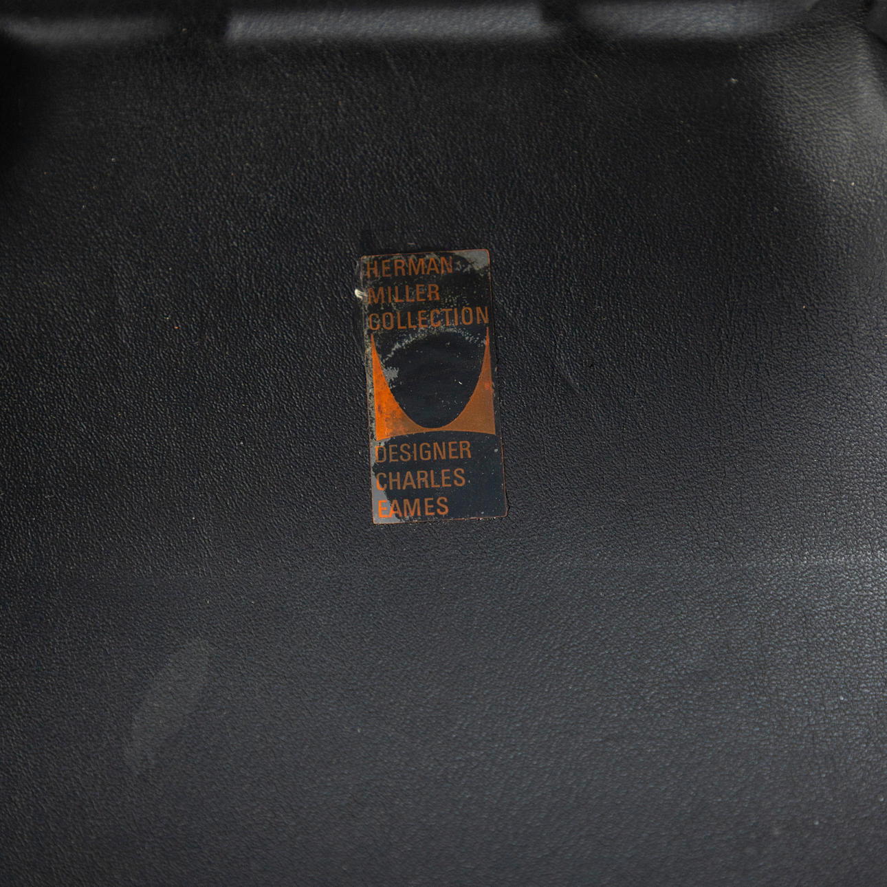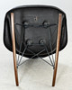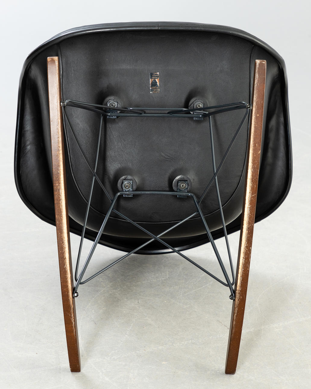 Design: 1950. Herman Miller sædeskal polstret og helt dækket med sort læder. Vitra base (senere) lavet af metal i sort og træløbere.