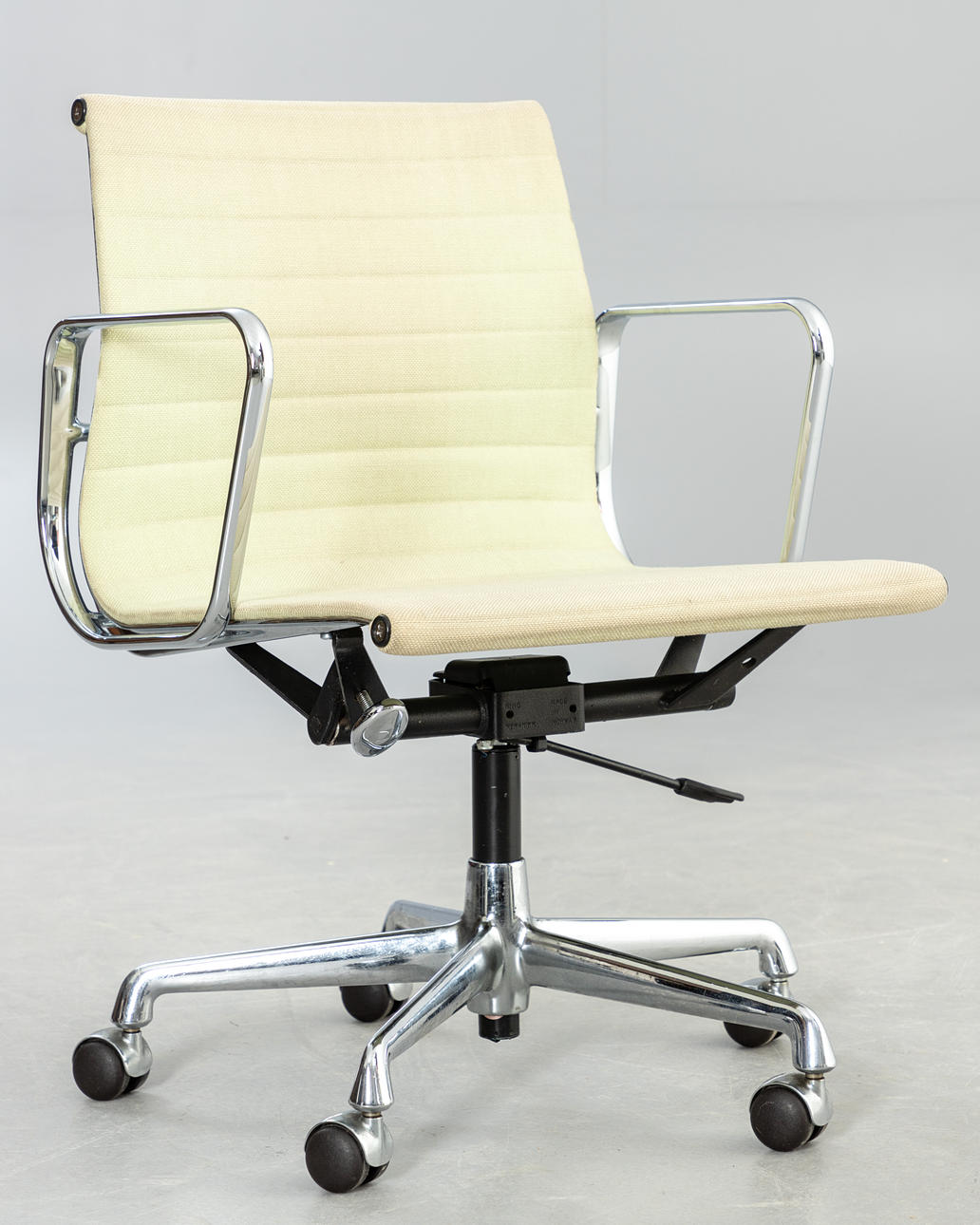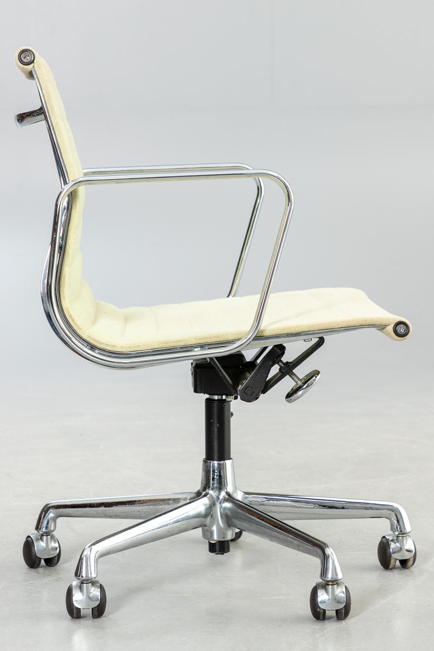 Vitra. 'EA 117' kontorstol af Ray & Charles Eames. Design: 1958. Udførelse med hopsak-dæksel og forkromet aluminiumsramme. Drejeligt 5-stjernet fod på hjul, højdejusterbar og med vippefunktion. Indskrevet med etiket.