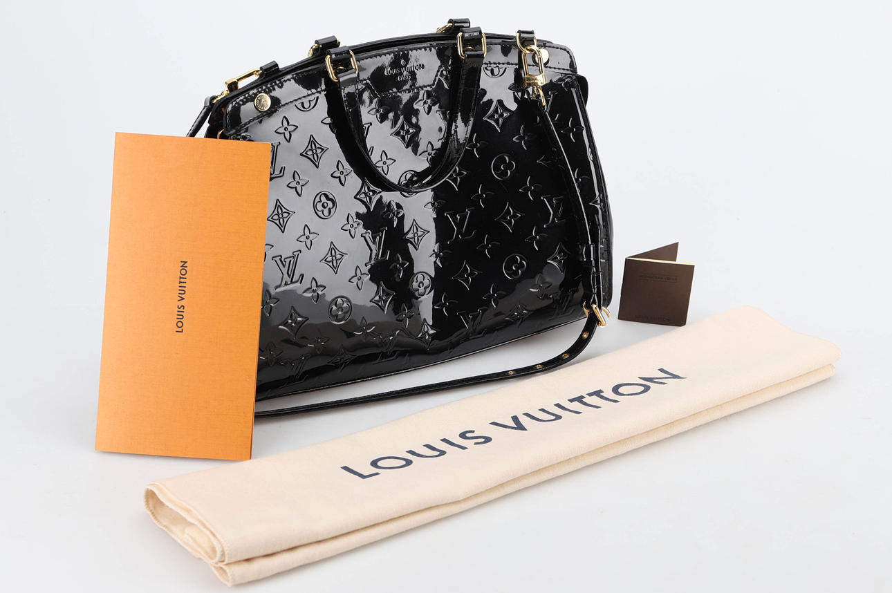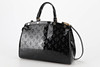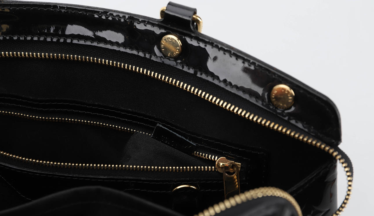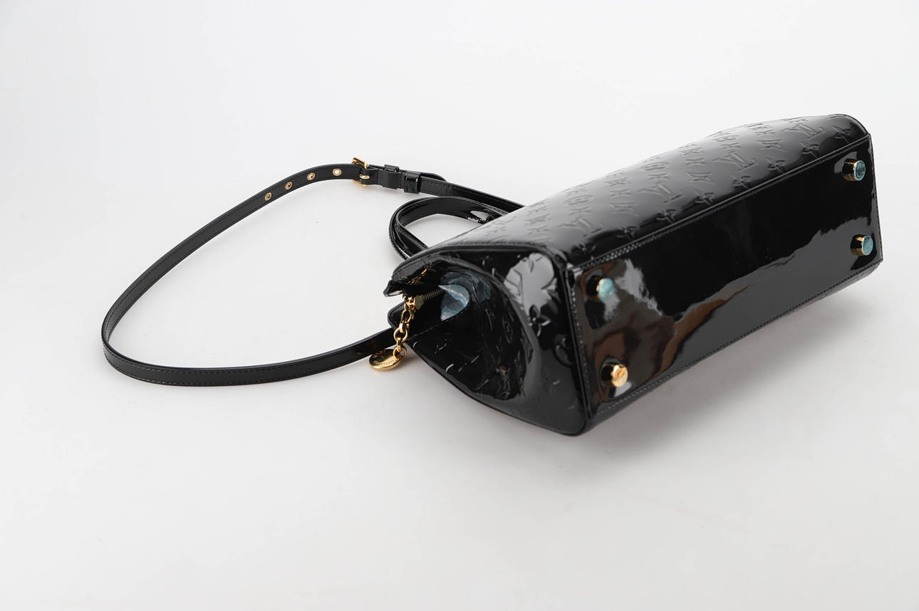 i sort vernis laklæder, med gule metaldetaljer. Interiør i sort bomuldlærred med lynlås i siderne og to åbne siderum. Mærket LOUIS VUITTON PARIS, samt AA0165, lavet i 2015.