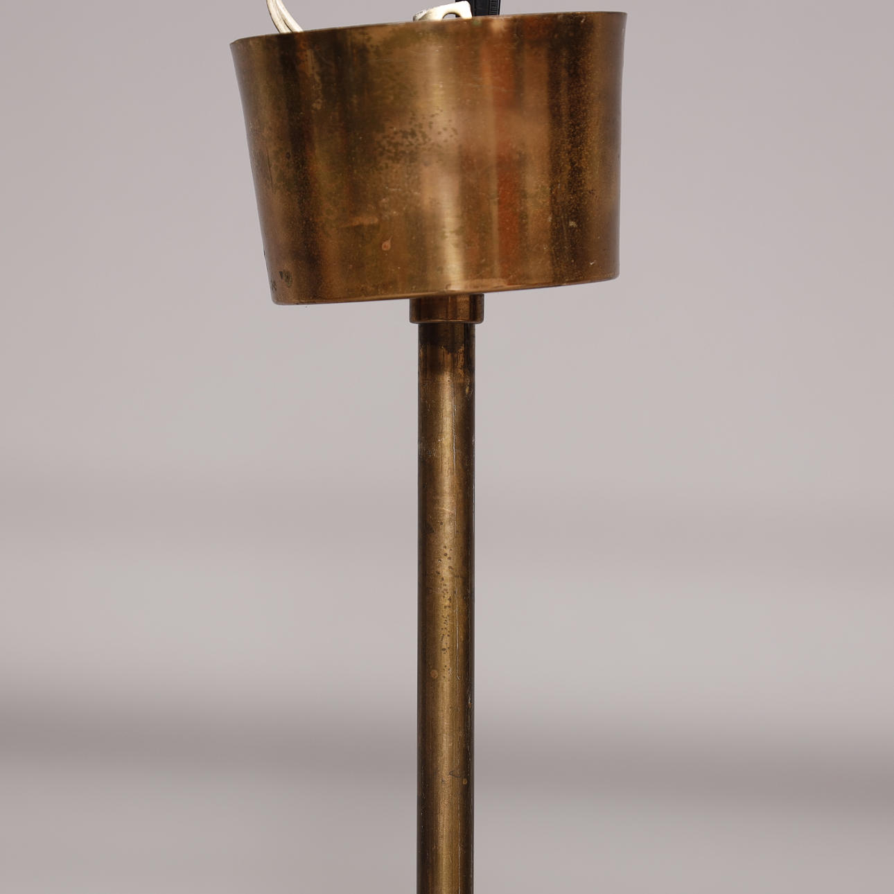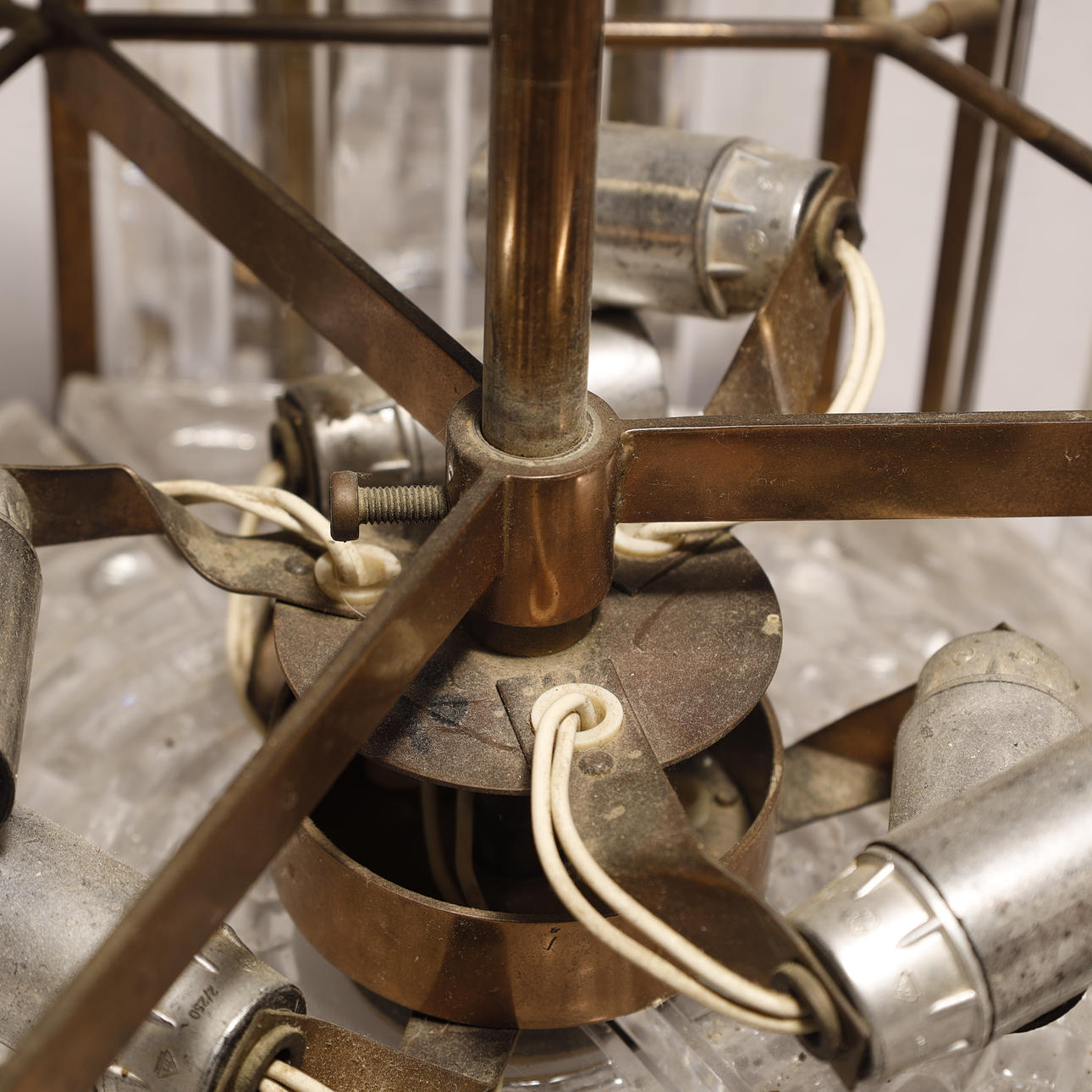 Loftslampe af messing med seks indsatser af profileret glas, samt underskærm i mønster. H. 50 cm til baldakin, H.15 cm på skærm. Diam. 33 cm.