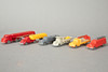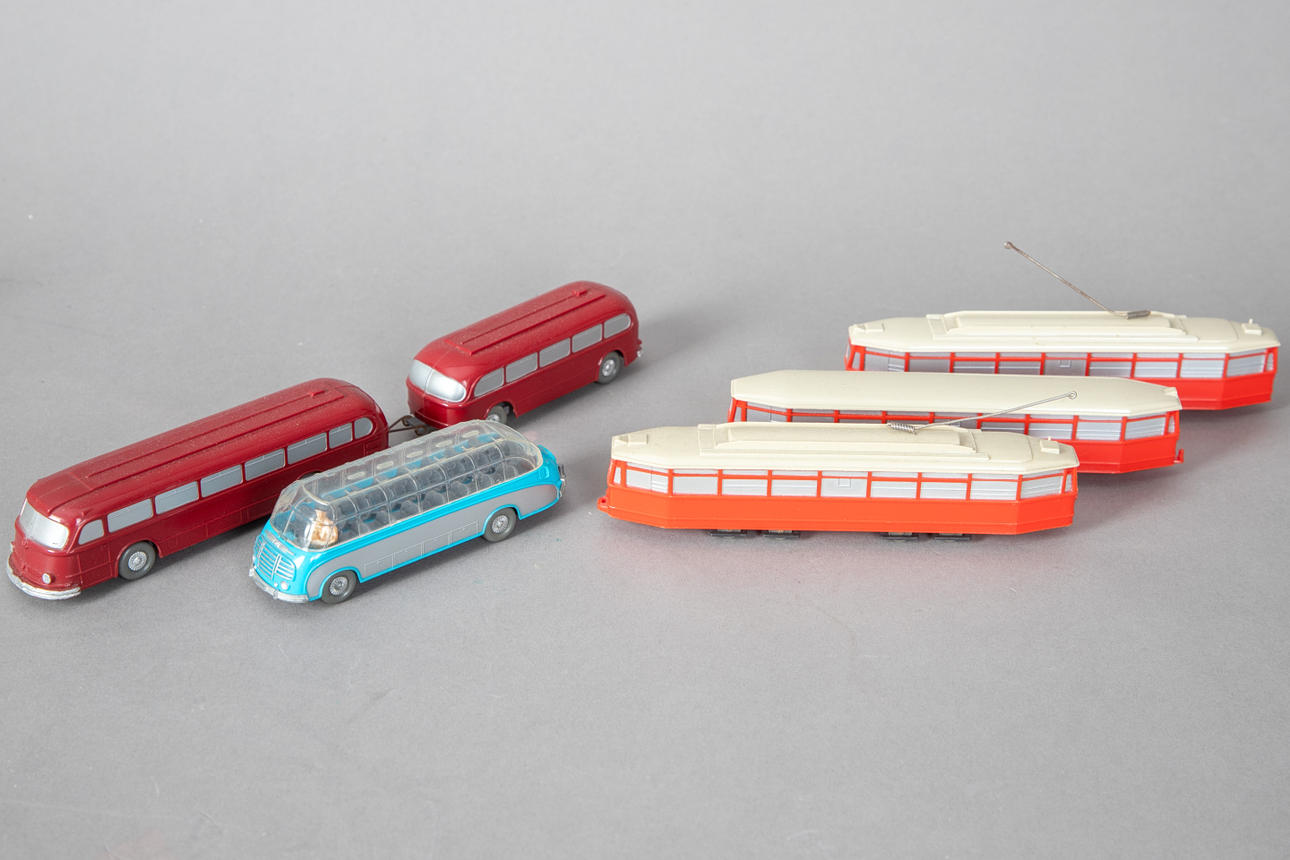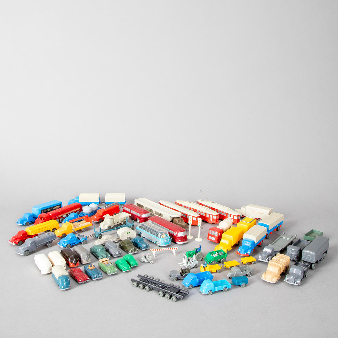 En samling af forskellige køretøjer og vejskilte. Herunder uglaserede biler og lastbiler, nogle med trailere, autocampere, en traktor, en motorcykel, en sporvogn med 3 vogne, 1 gaffeltruck, 1 terrængående køretøj og VW T1 Bullies.