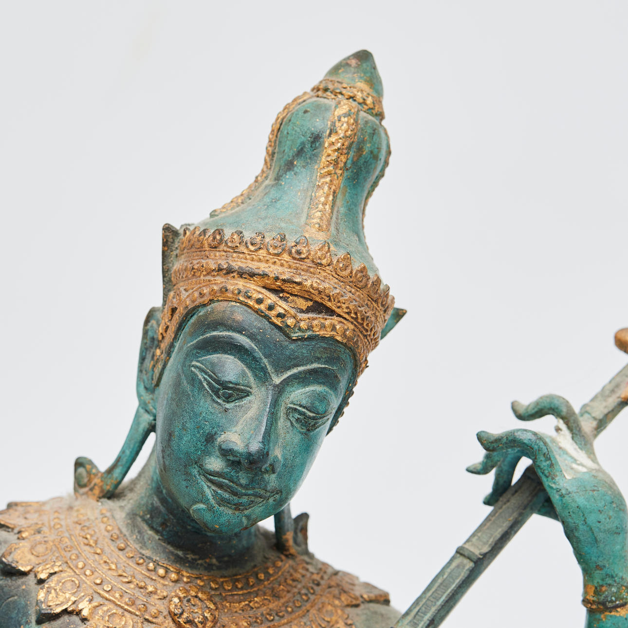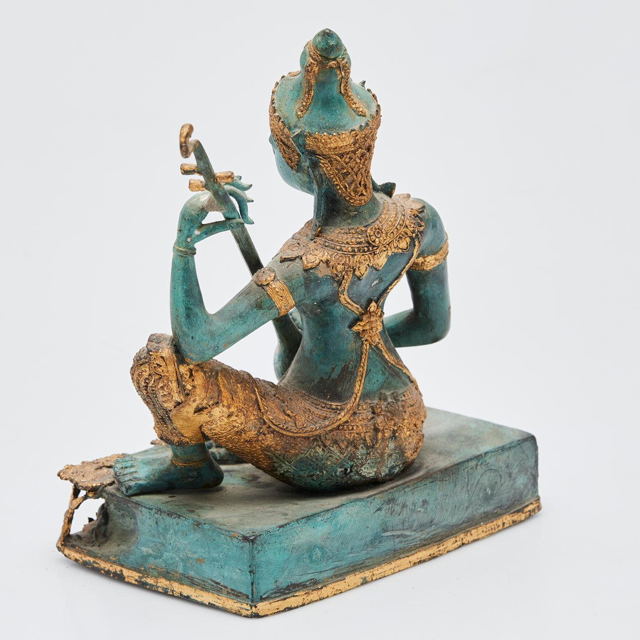 Skulpturskildring af en kvindelig Buddha med en lut, lavet af bronze malet i guld på steder, h.30.5cm, w.23cm, d.16cm.